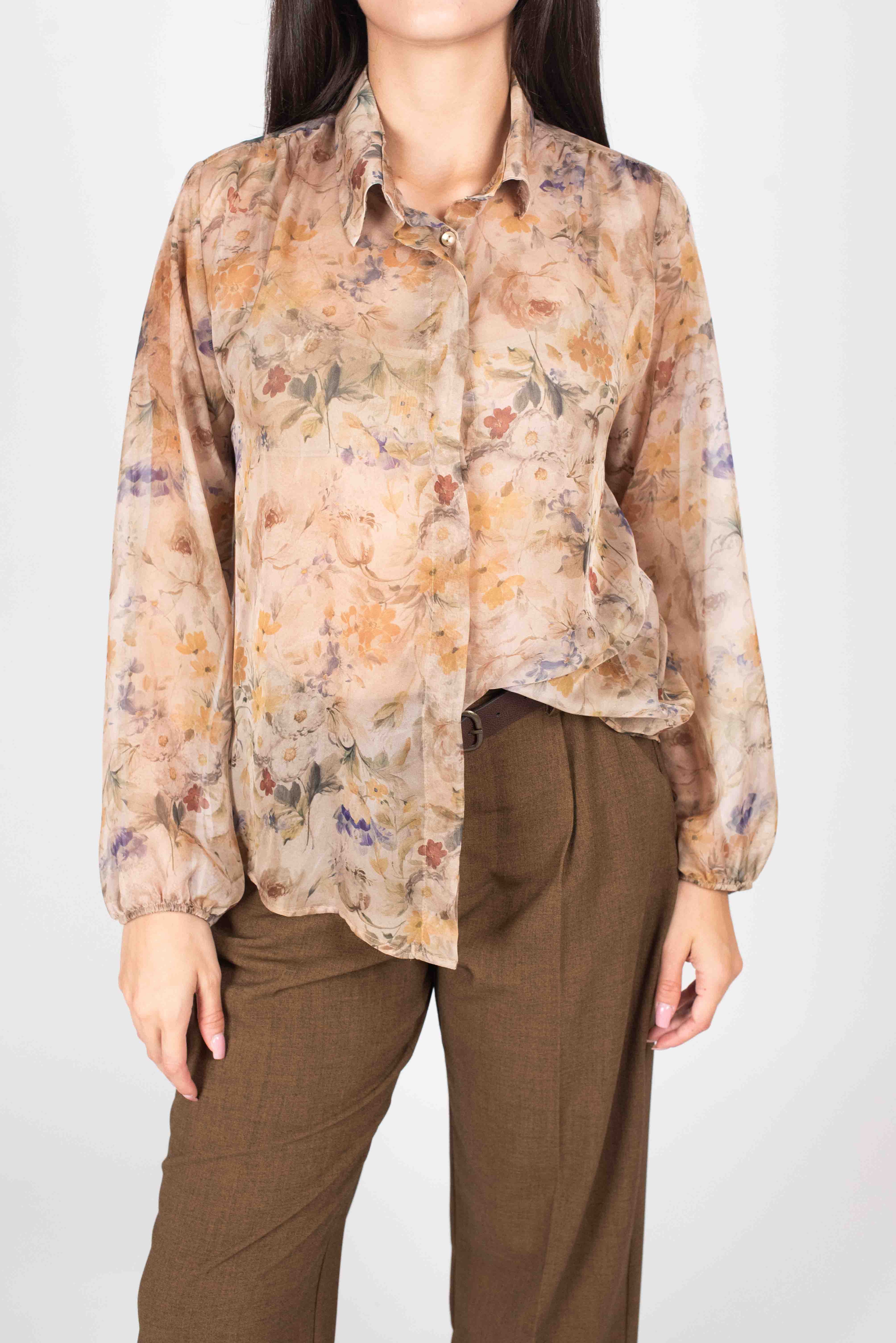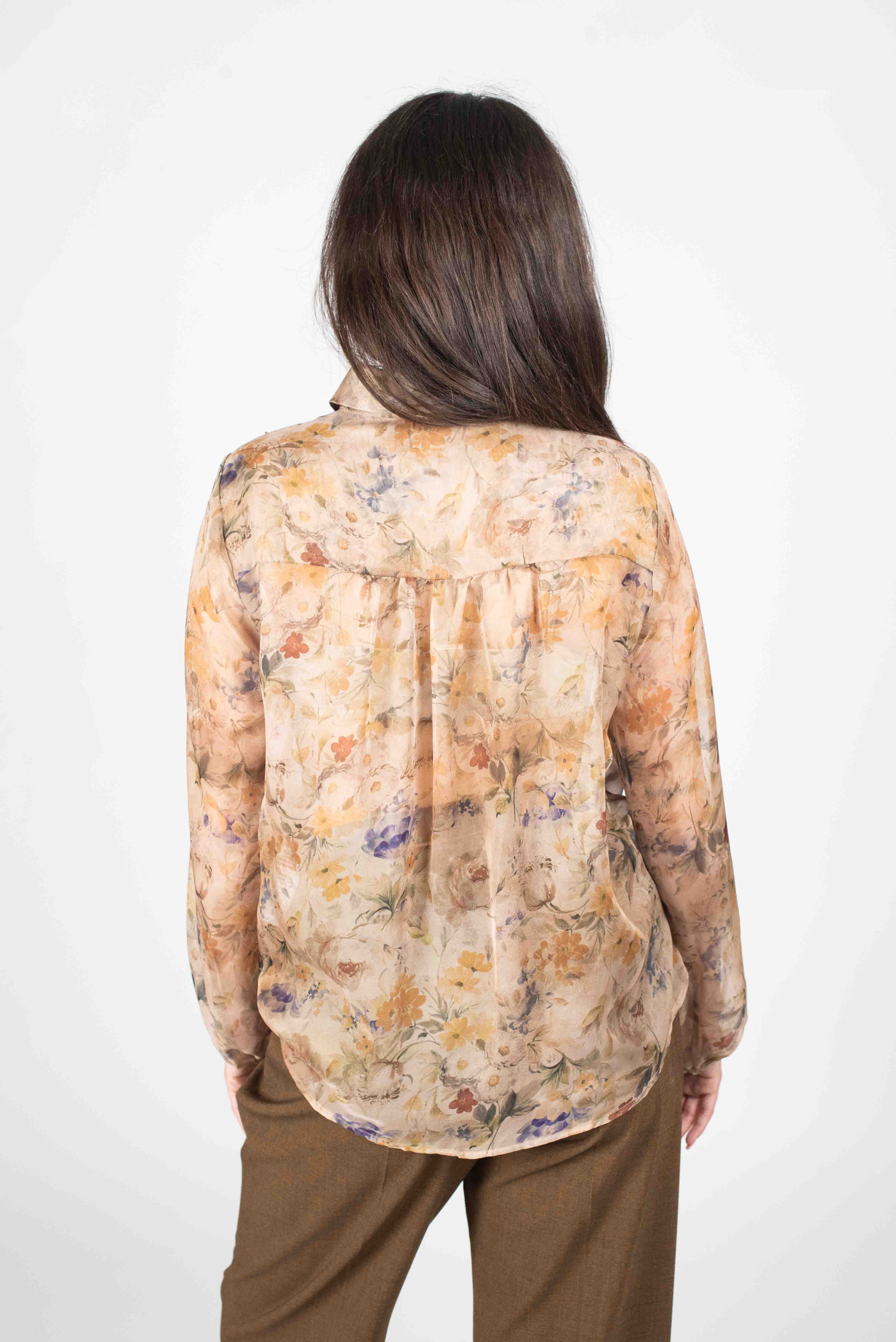 Camicia fantasia con bottoni nascosti ed elastico sul polsino.