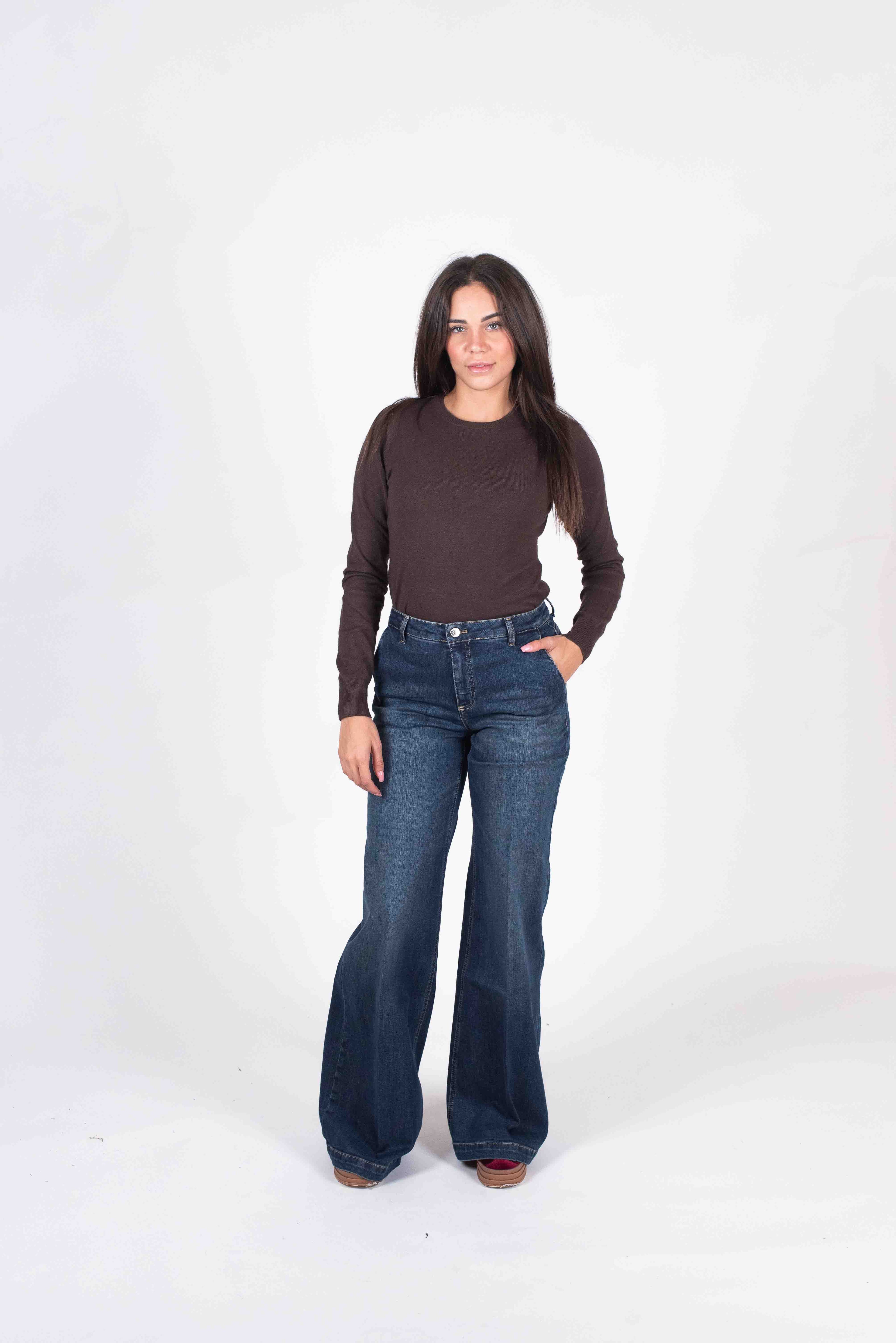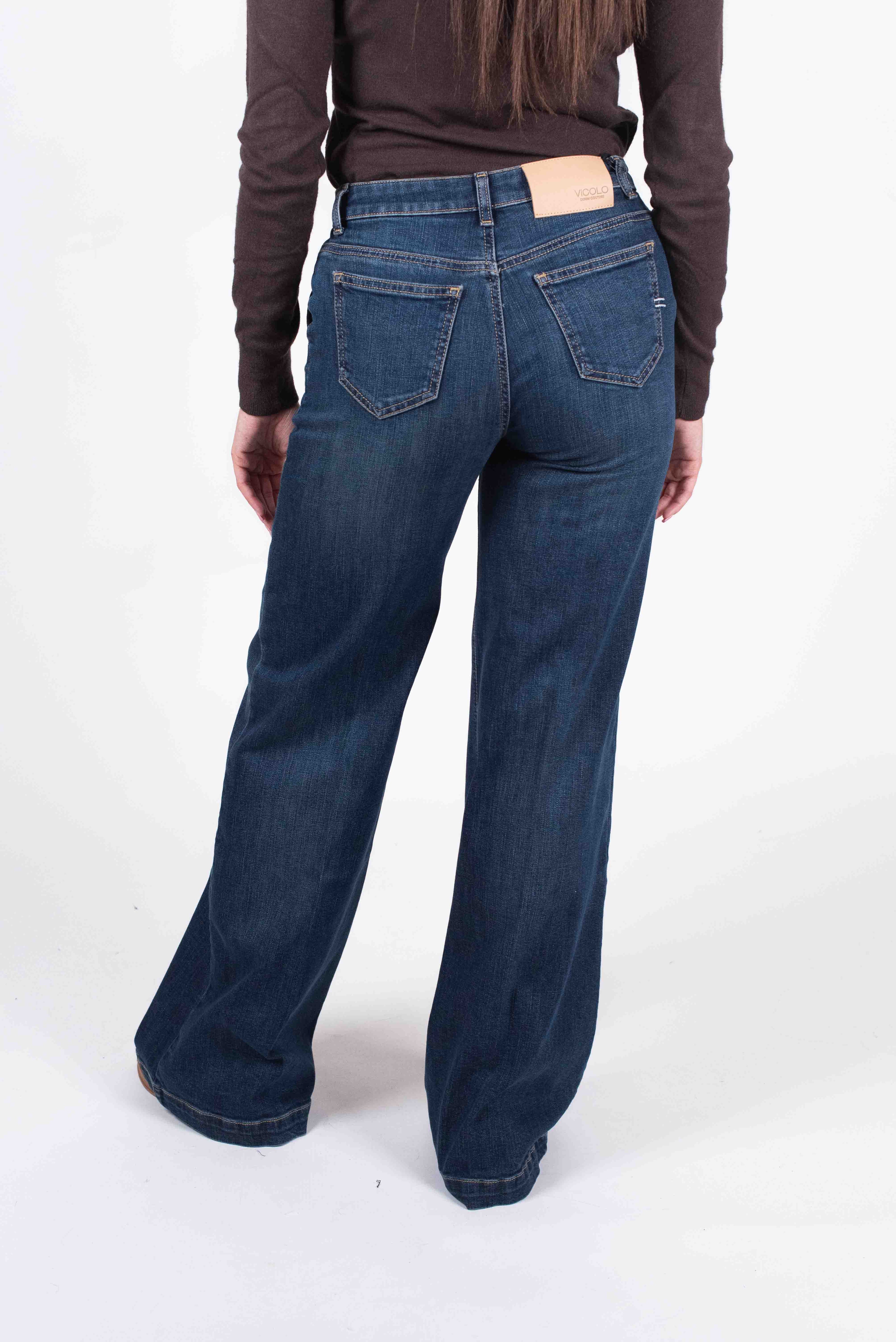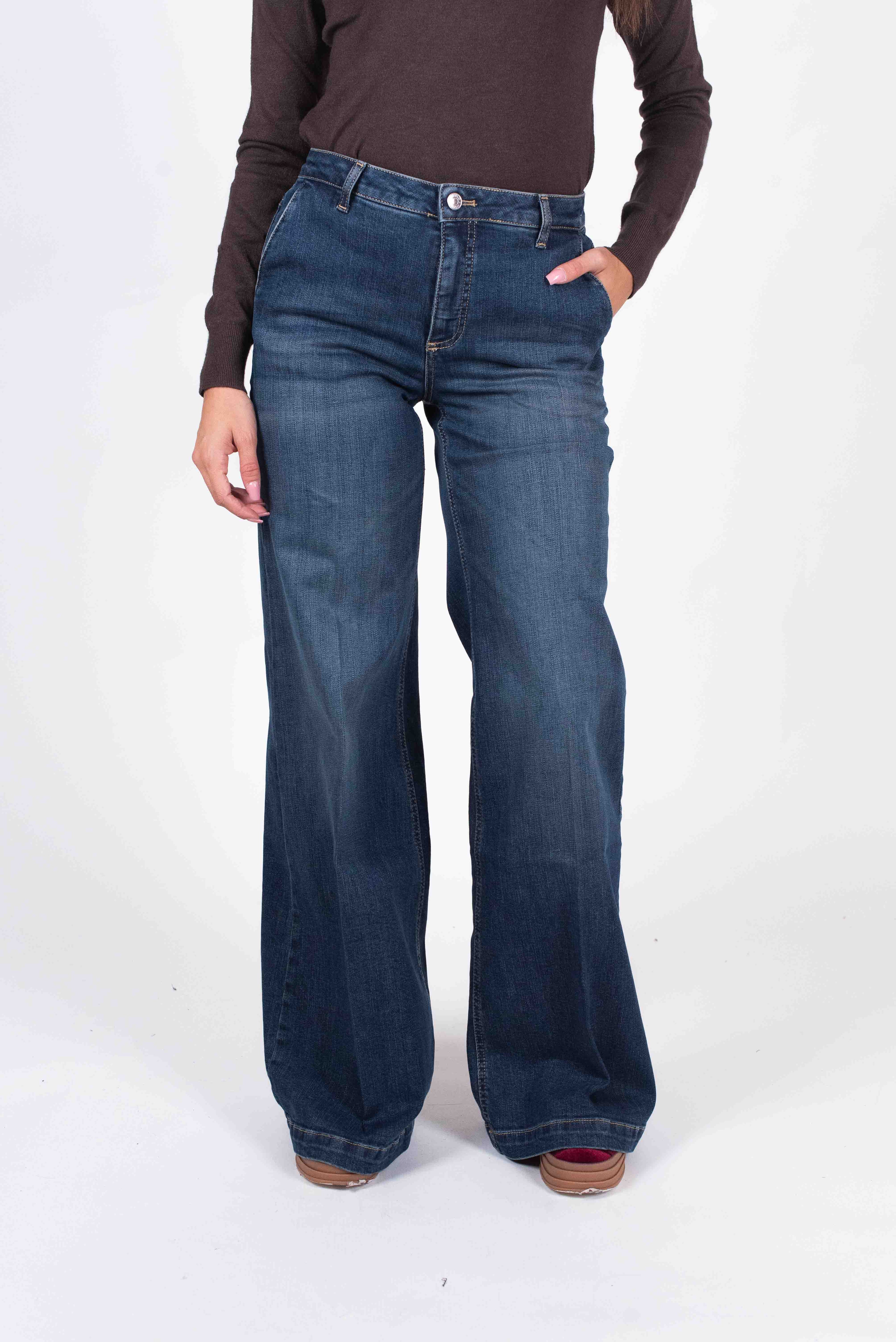 Jeans palazzo vita alta con tasca alla francese e impuntura su orlo.
