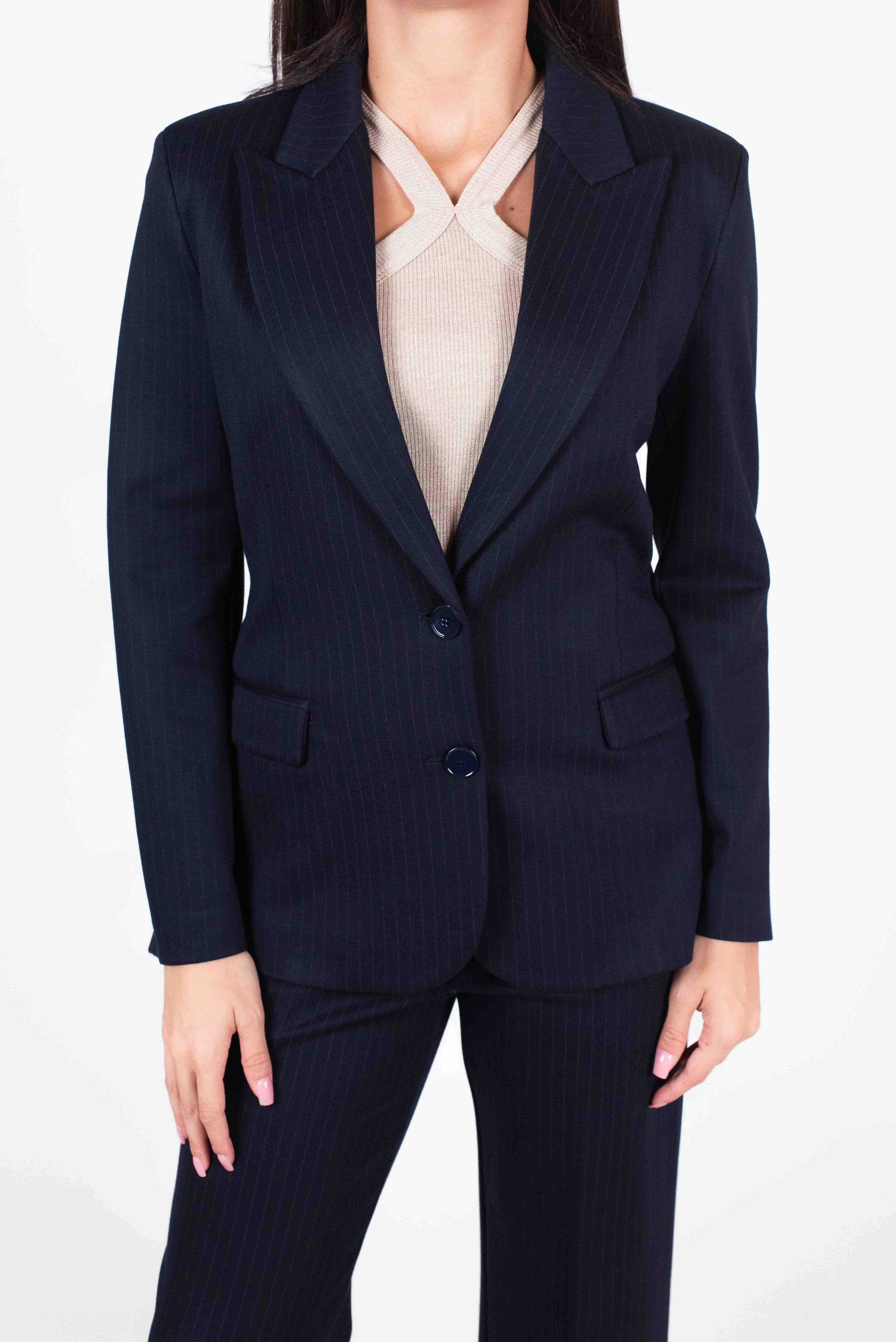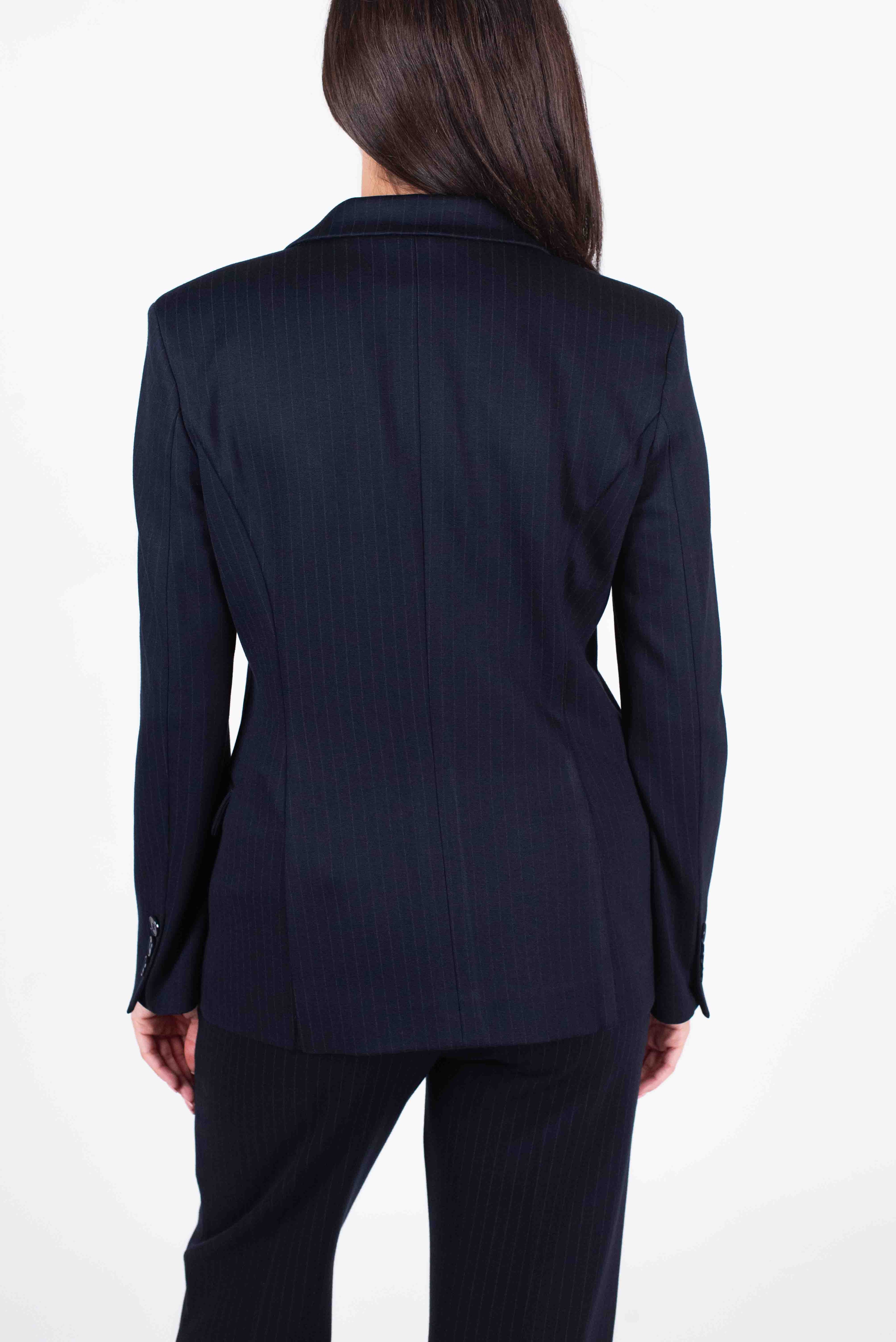 Giacca gessata due bottoni con tasche a pattina.