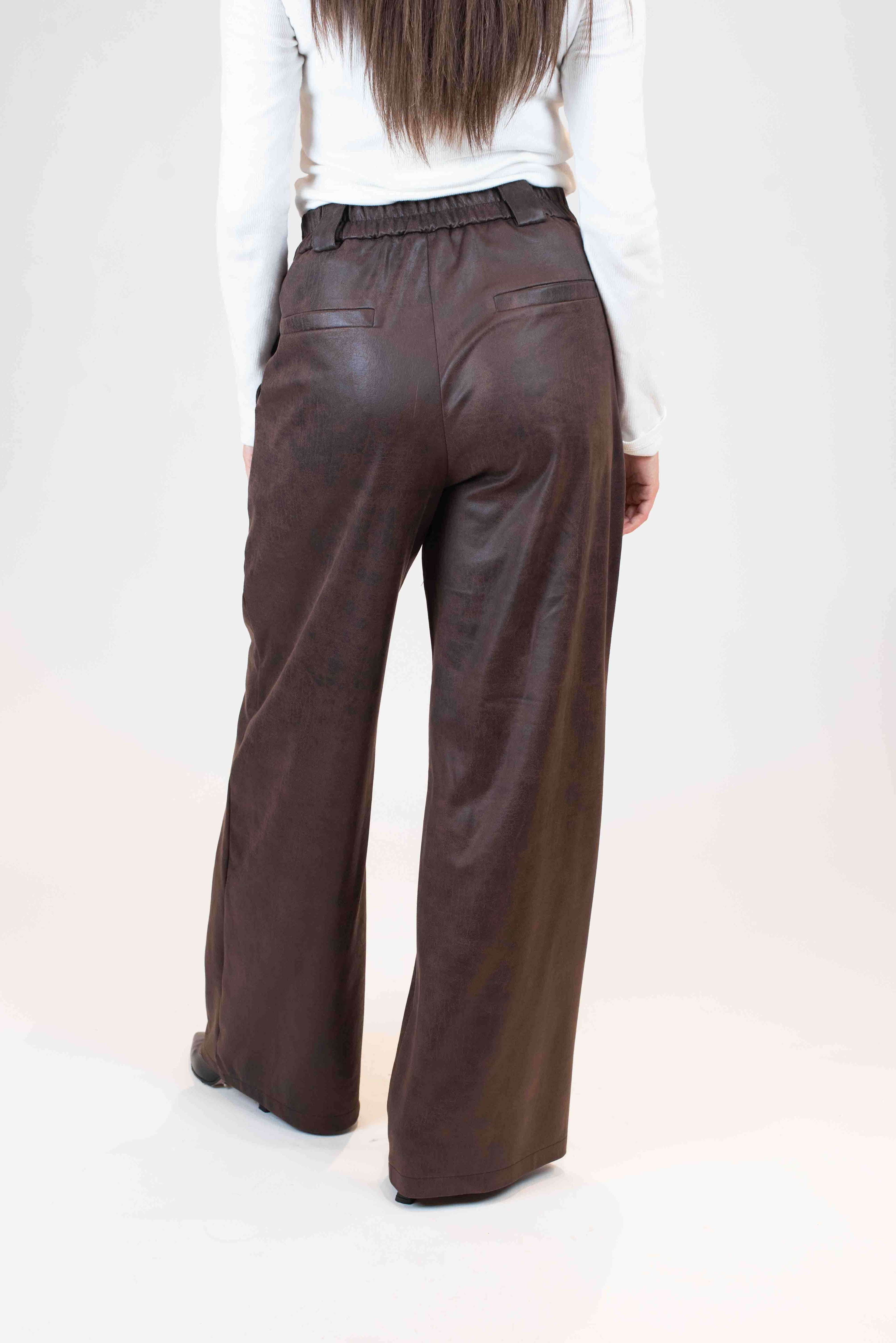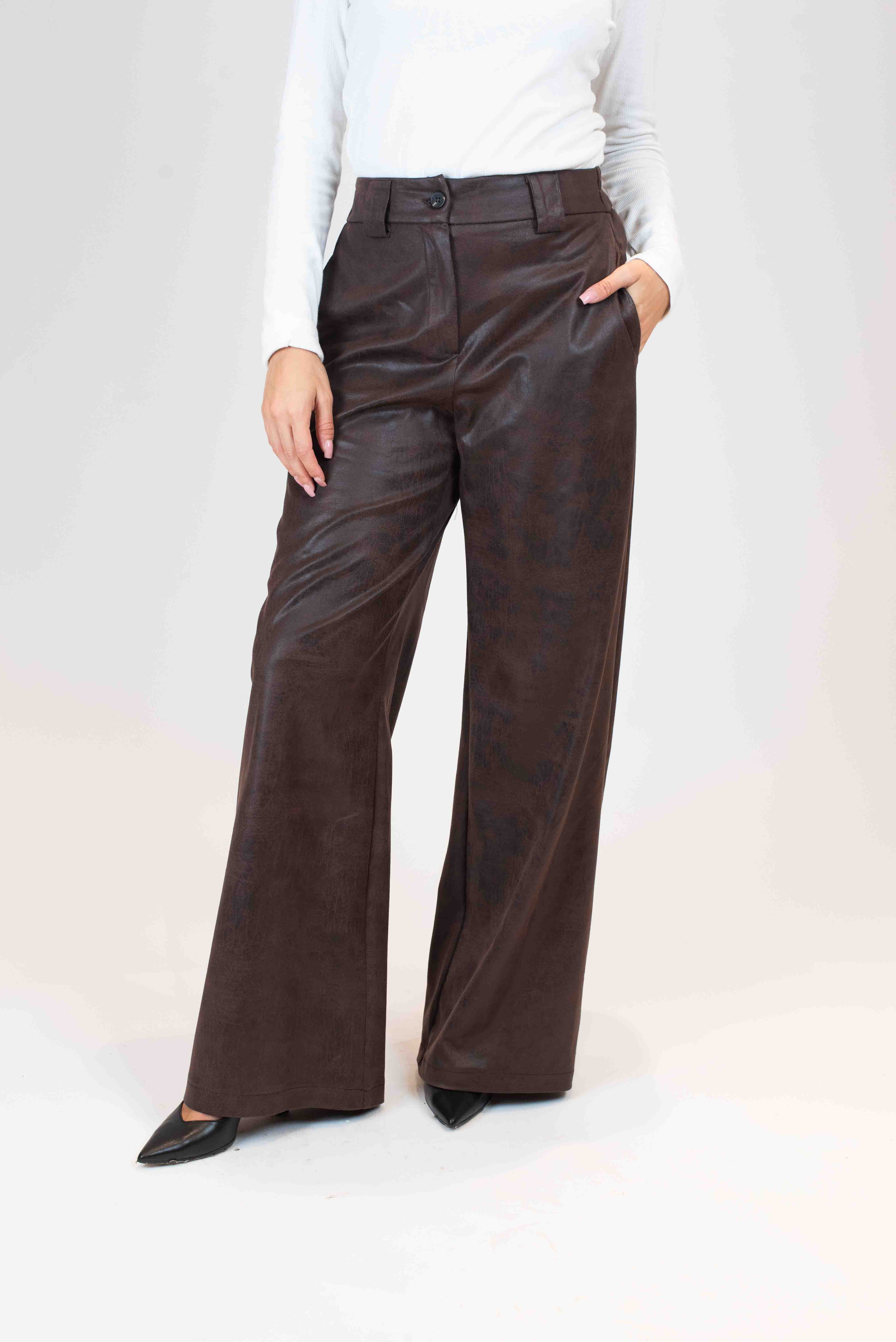 Pantalone palazzo ecopelle invecchiata con elastico in vita e tasca a filo.