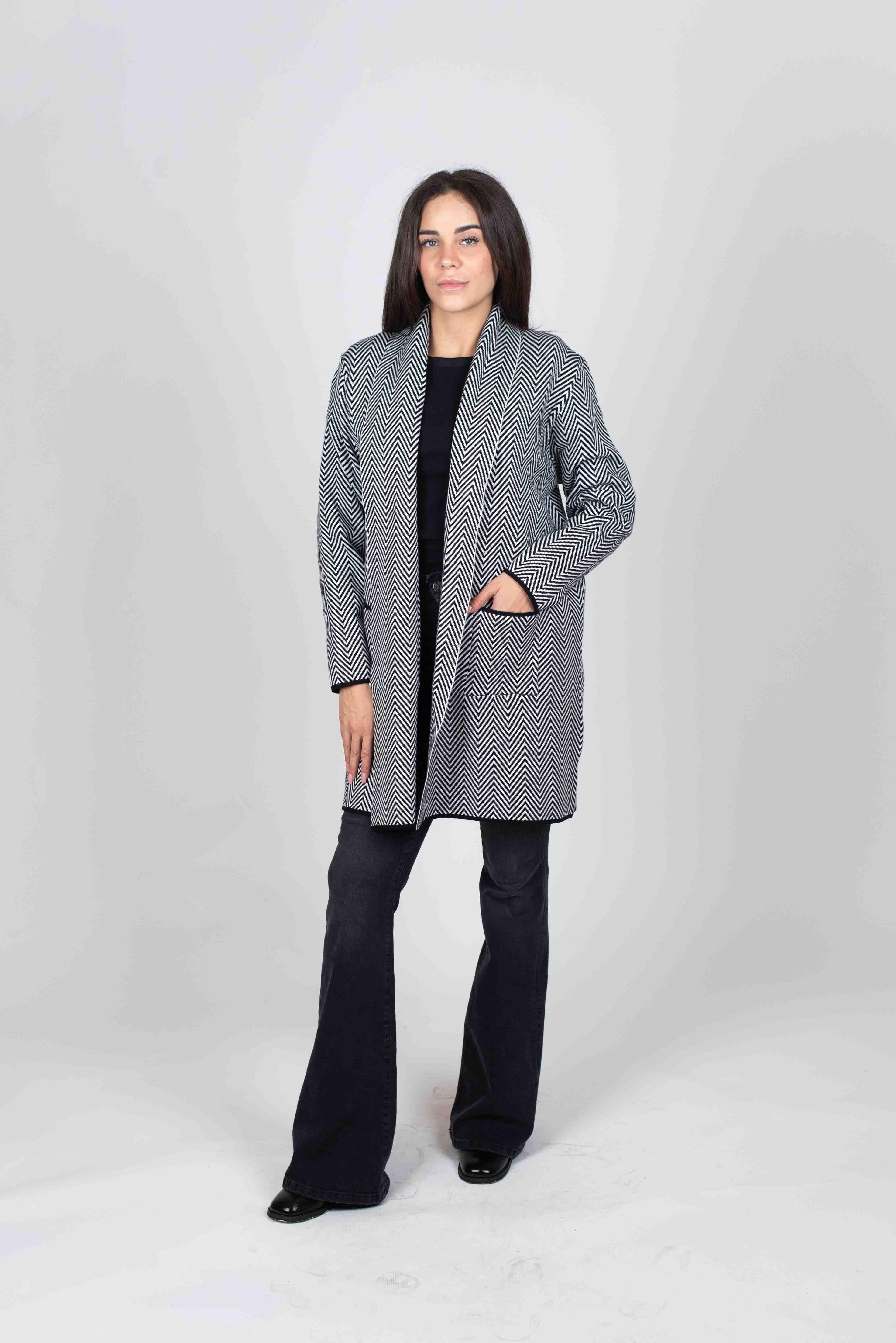 Cardigan lungo fantasia spiga con tasche frontali.