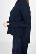 Maglia over con riga centrale asimmetrica piu' lunga dietro con spacchi laterali e sul polsino.