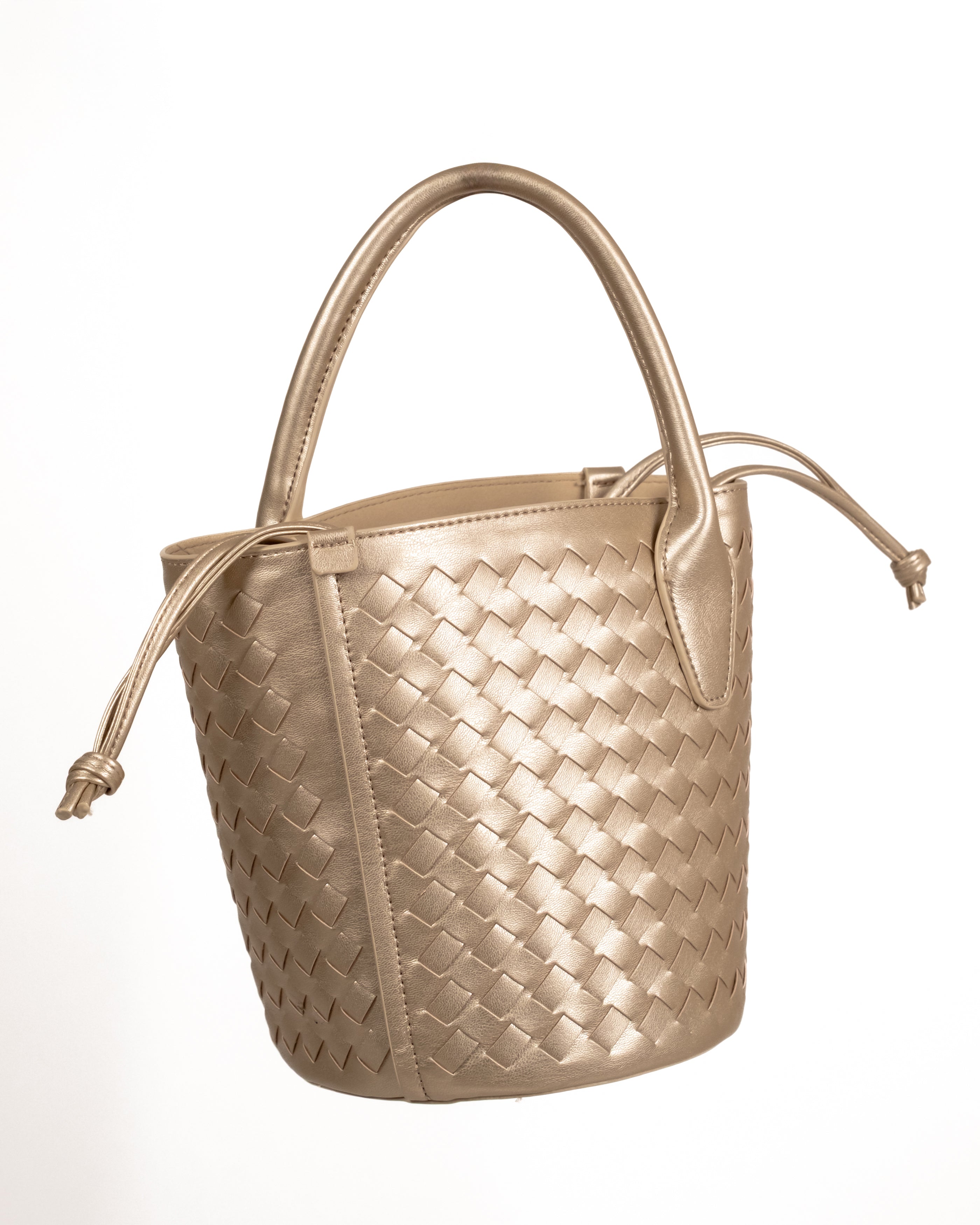 Borsa intrecciata con pochette interna e tracolla removibile.