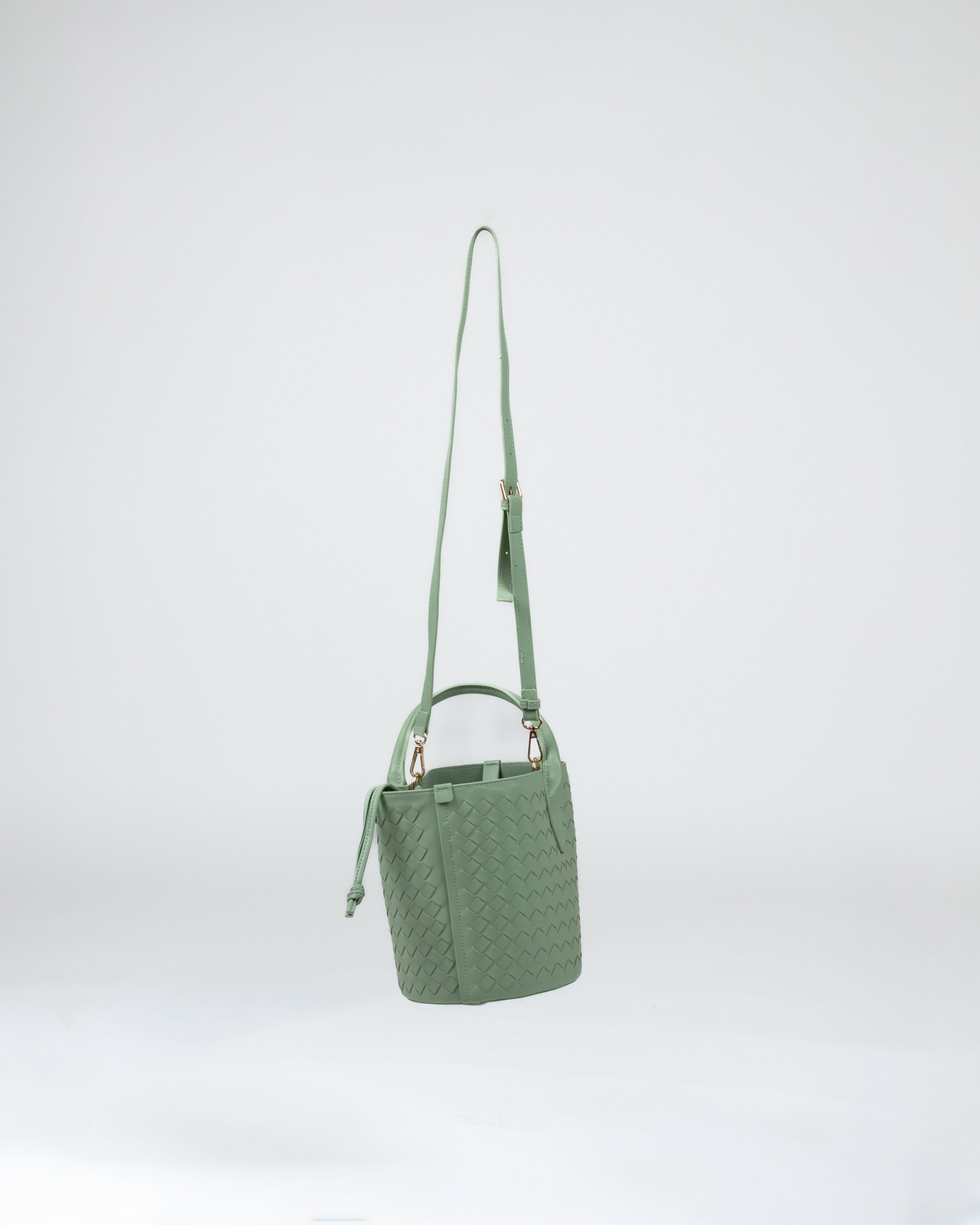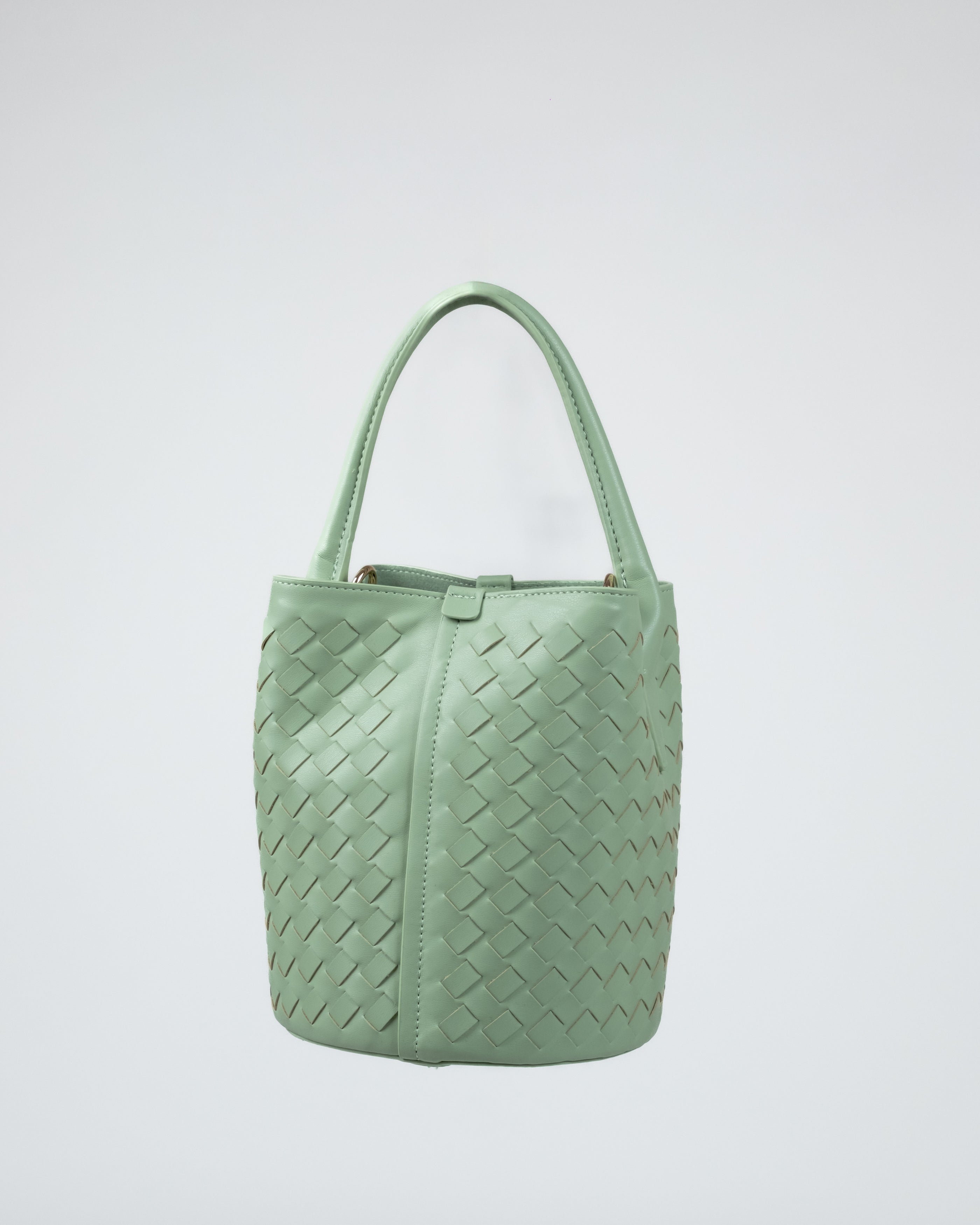 Borsa intrecciata con pochette interna e tracolla removibile.