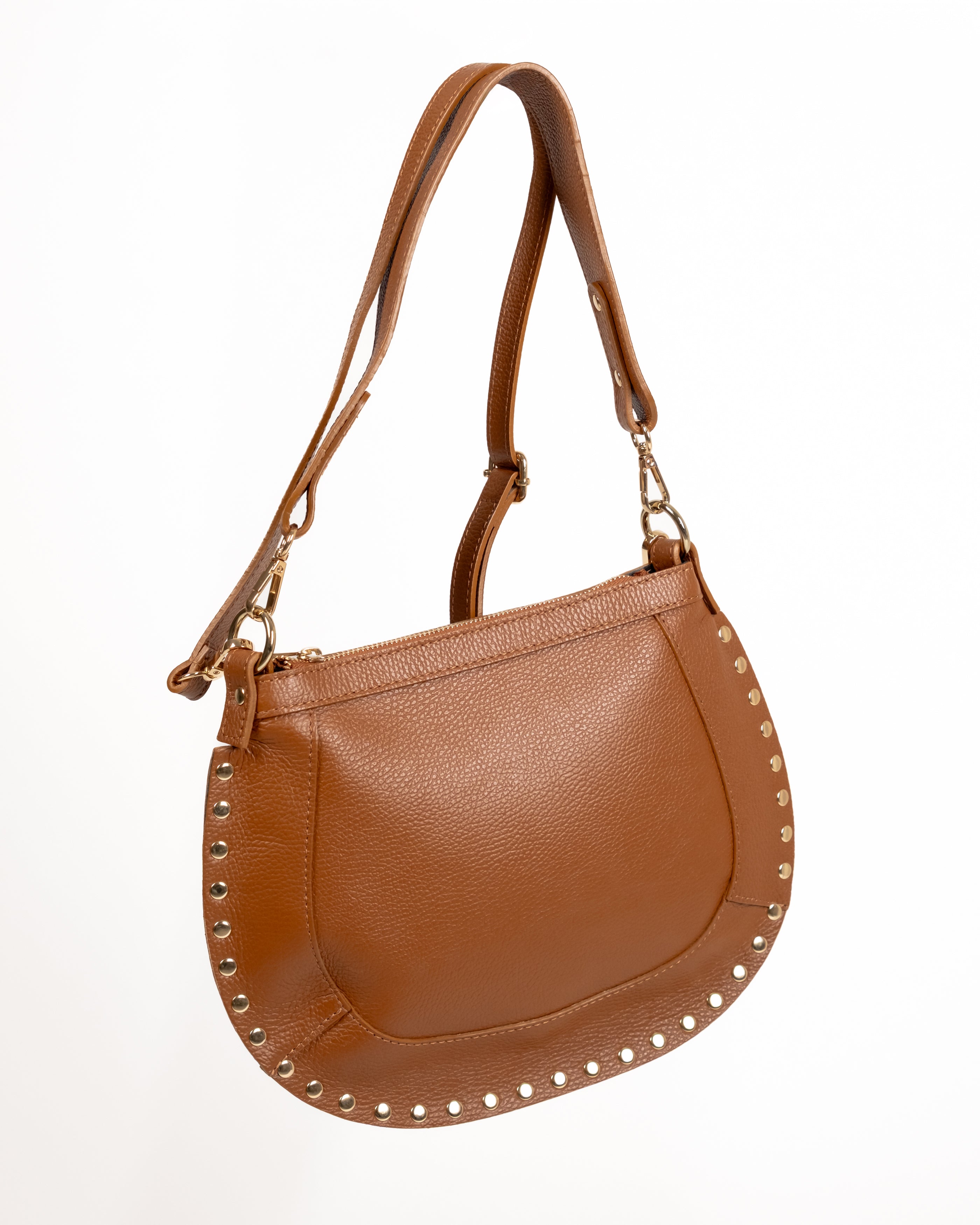 Borsa martellata con tracolla e borchie dorate.