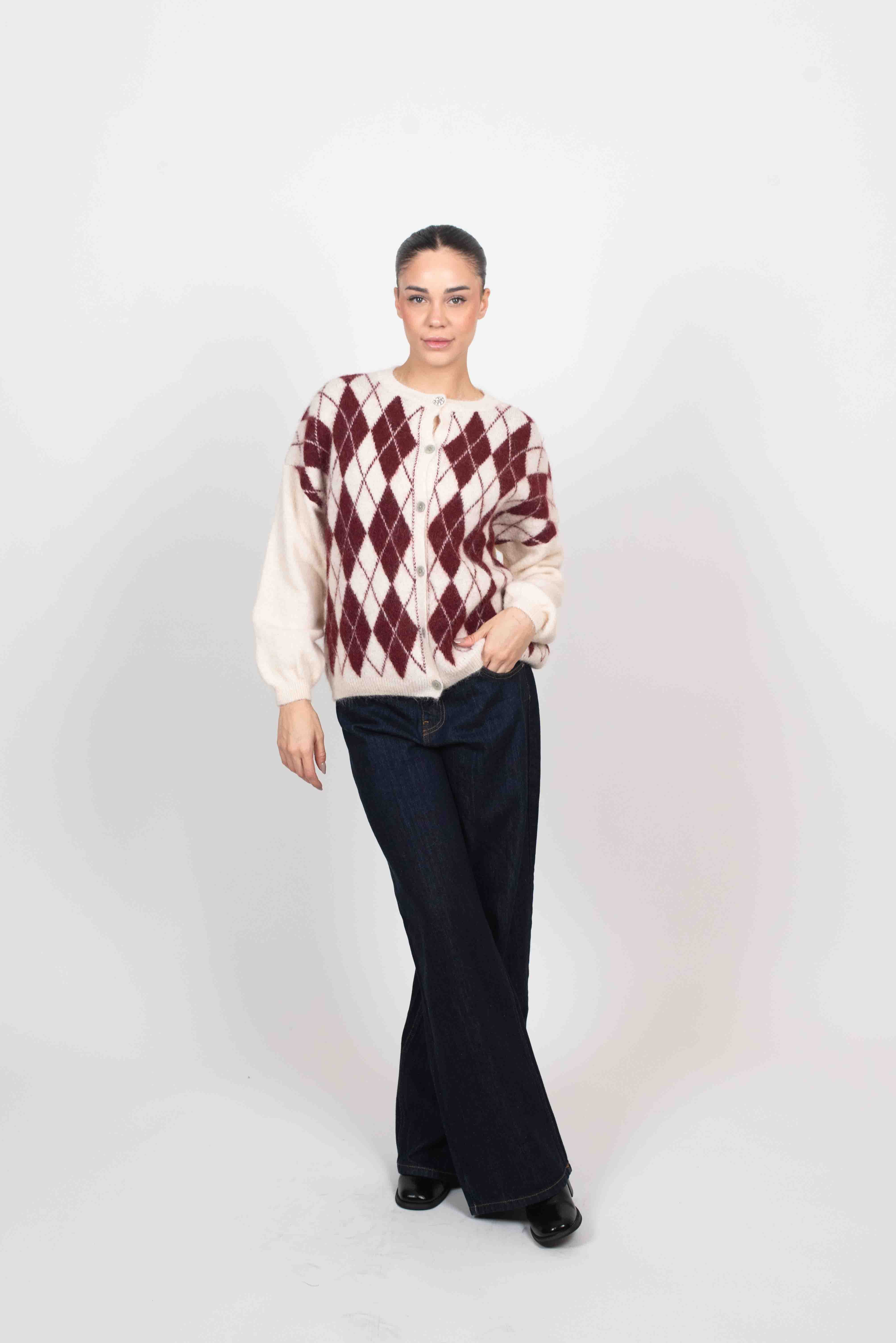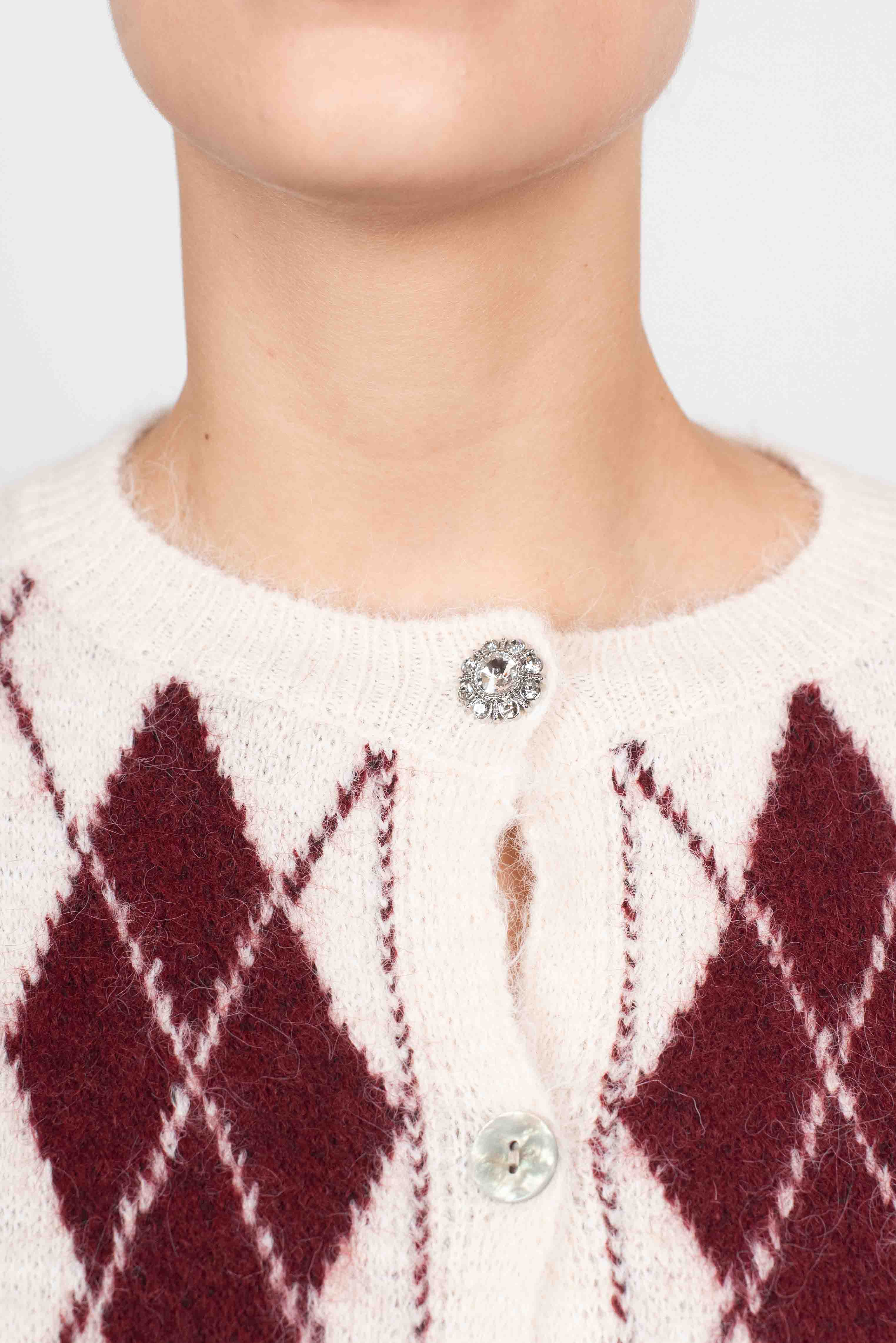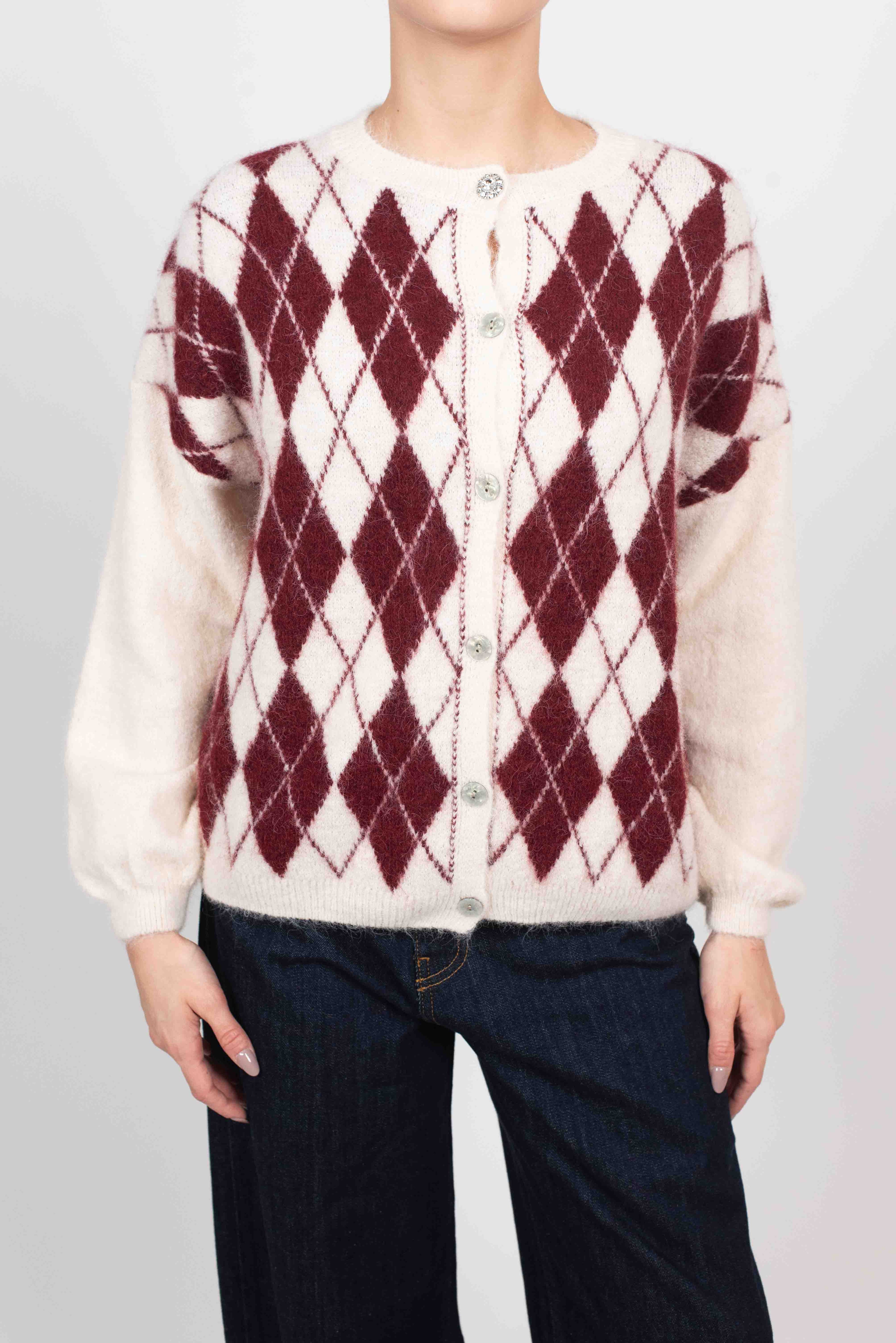 Cardigan rombi con bottoni gioiello.