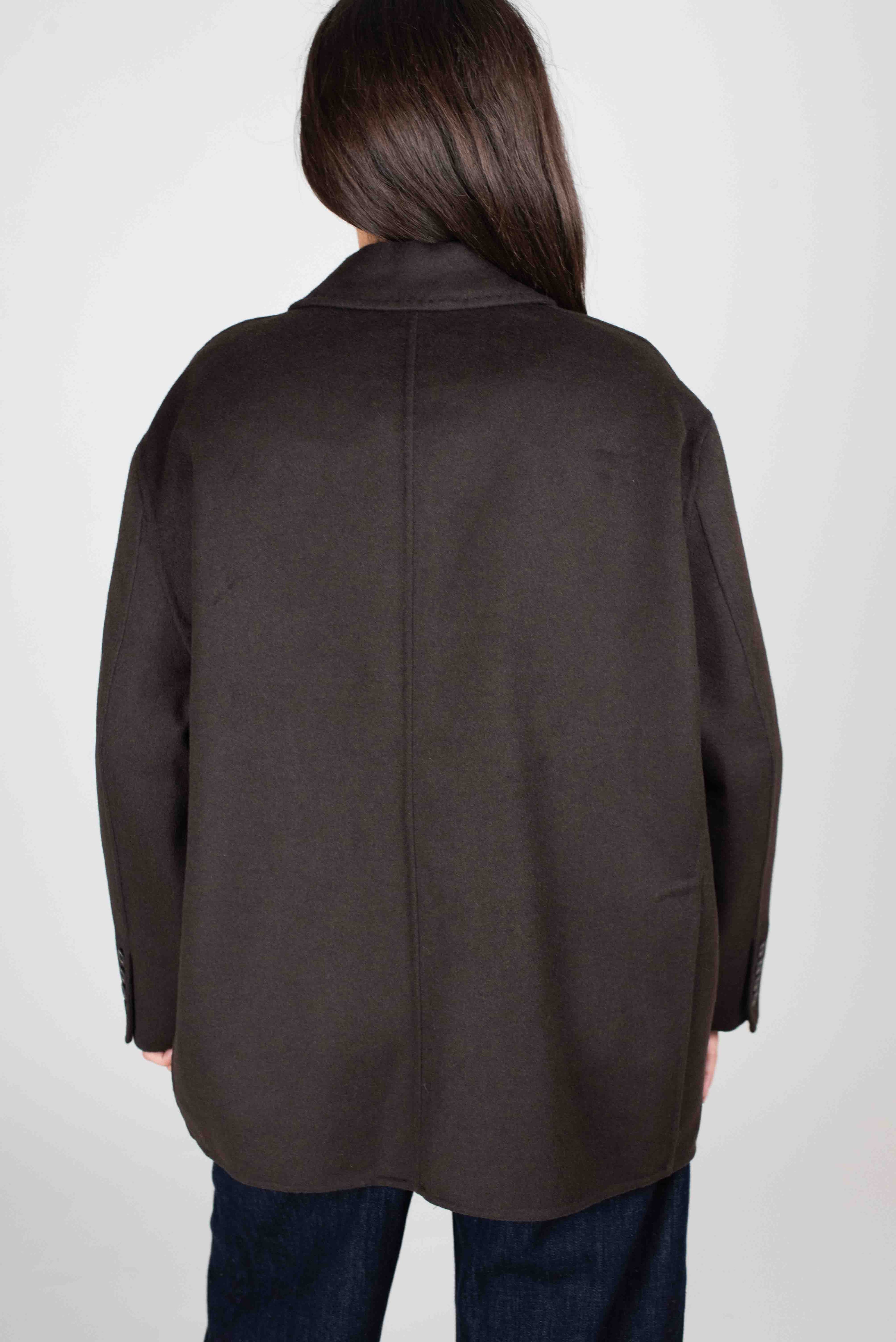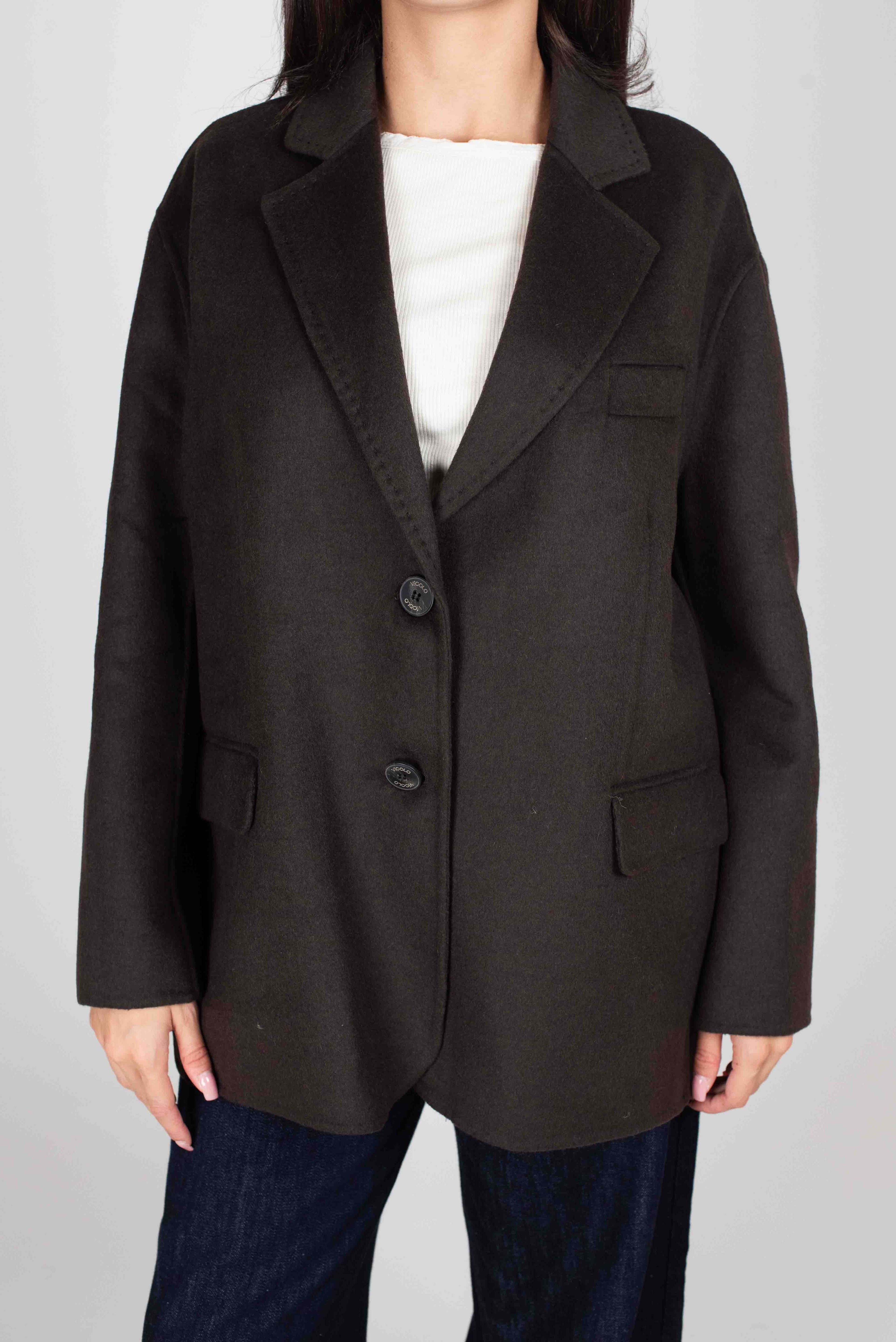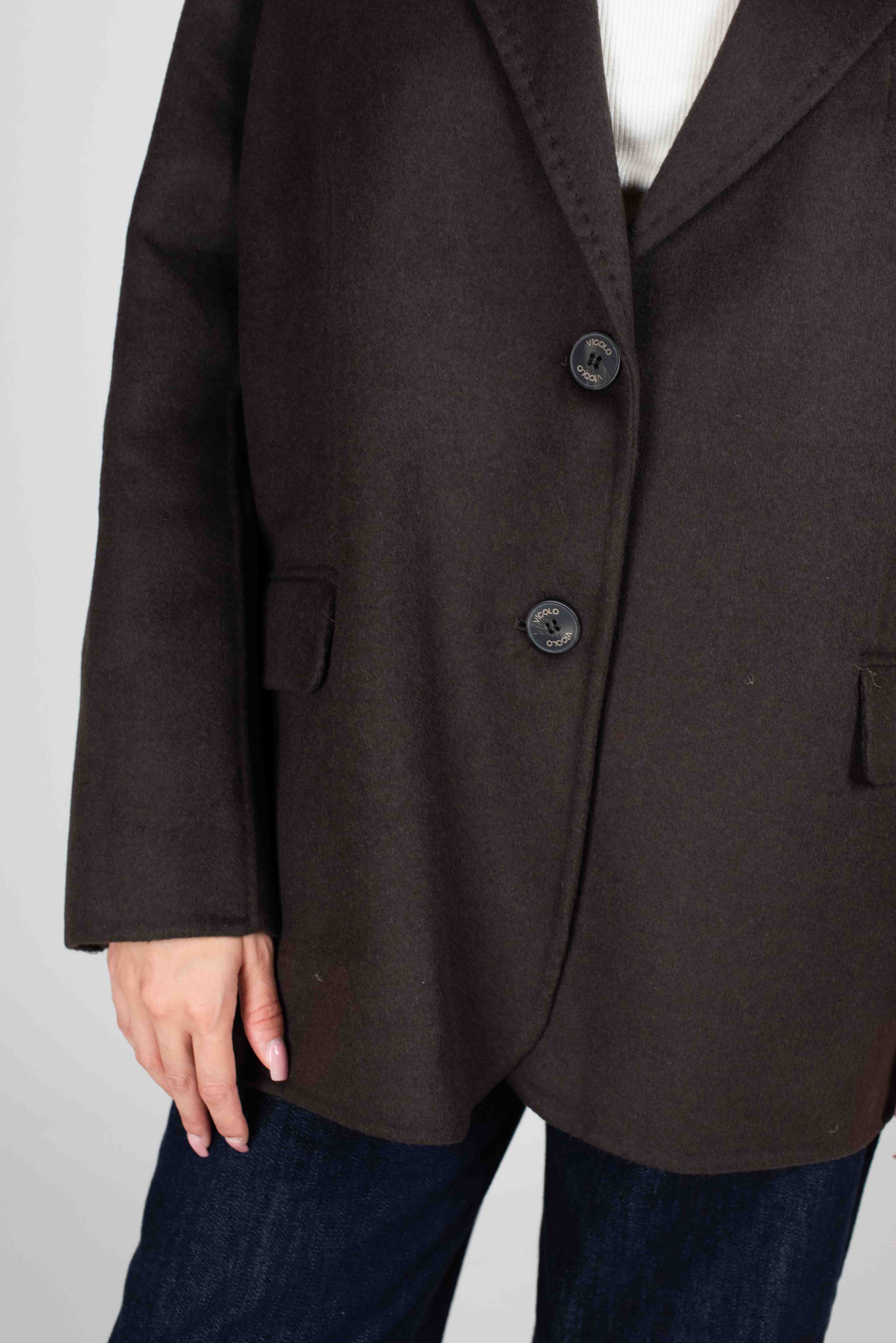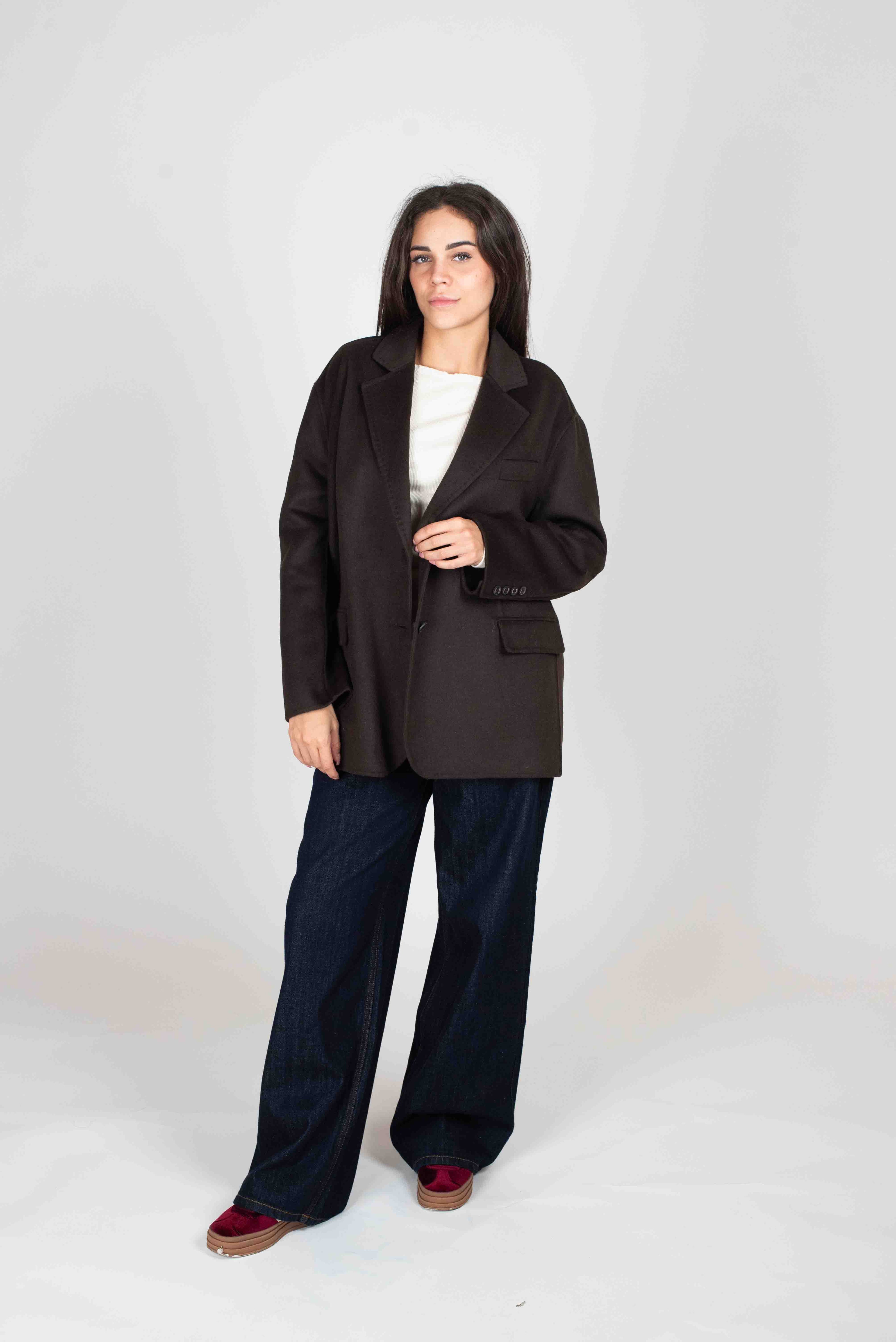 Cappotto giacca over and made con due bottoni tasche a pattina e spacchi dietro.