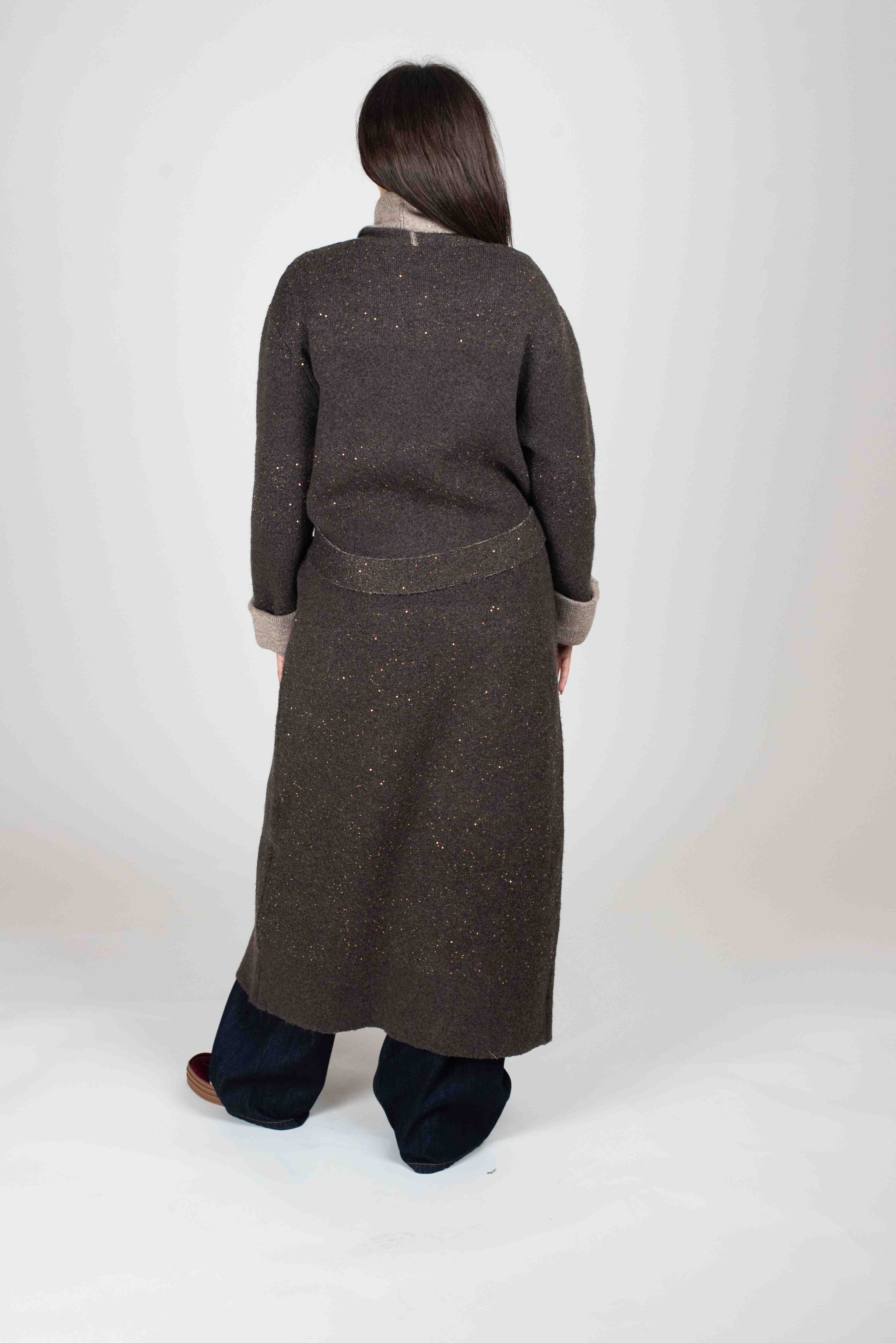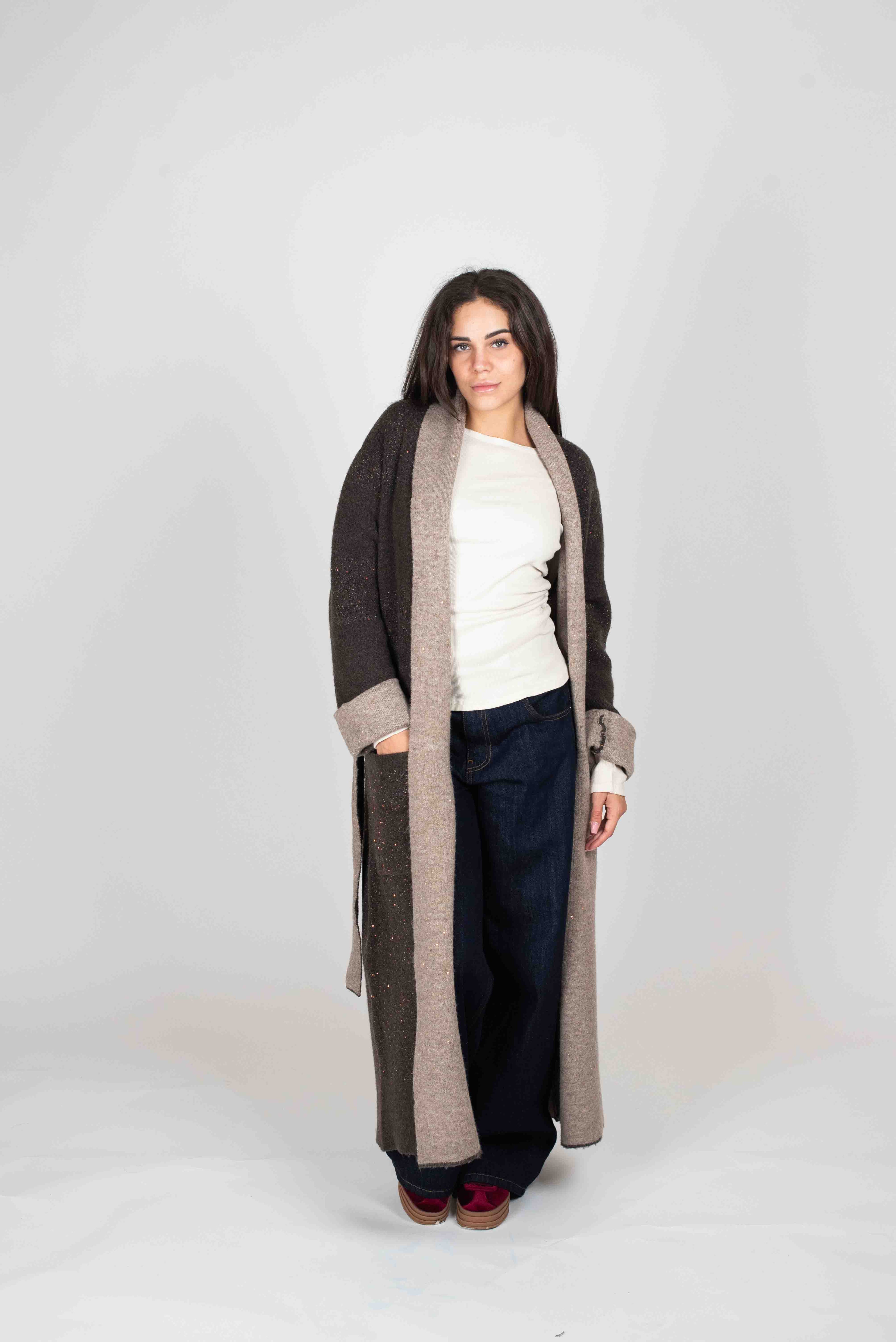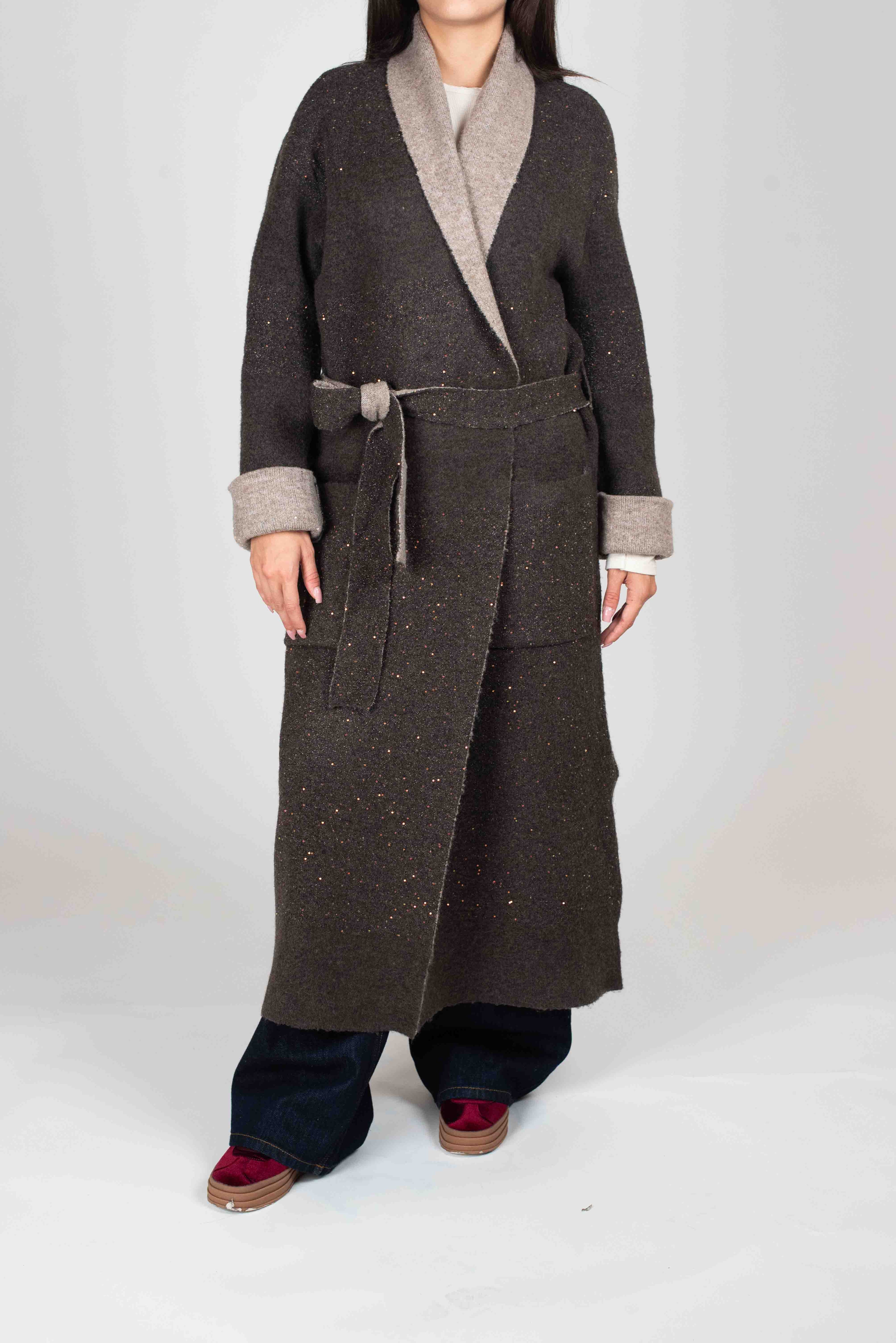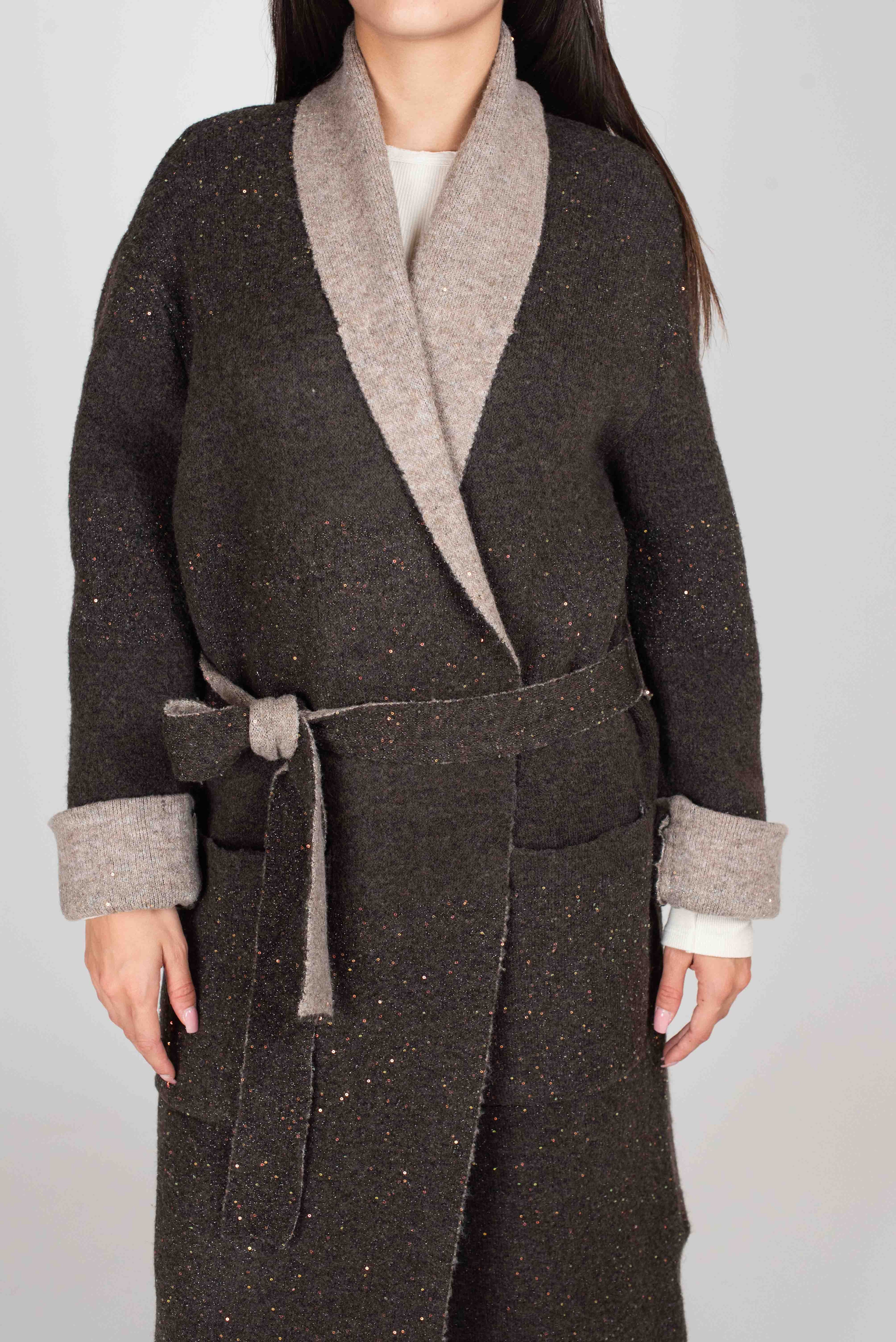 Cappotto lungo in maglia colore interno a contrasto con cinta e micropaillettes.
