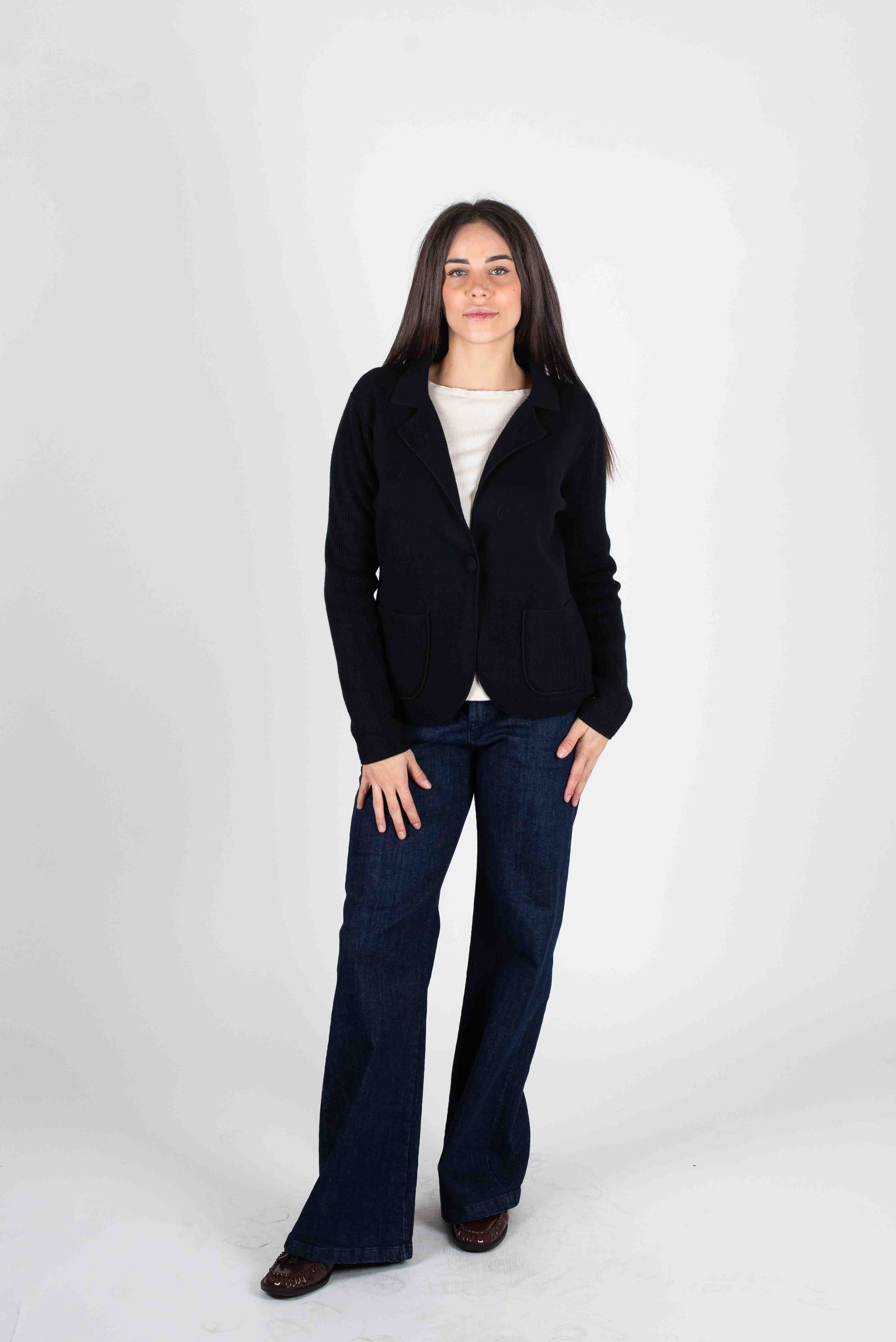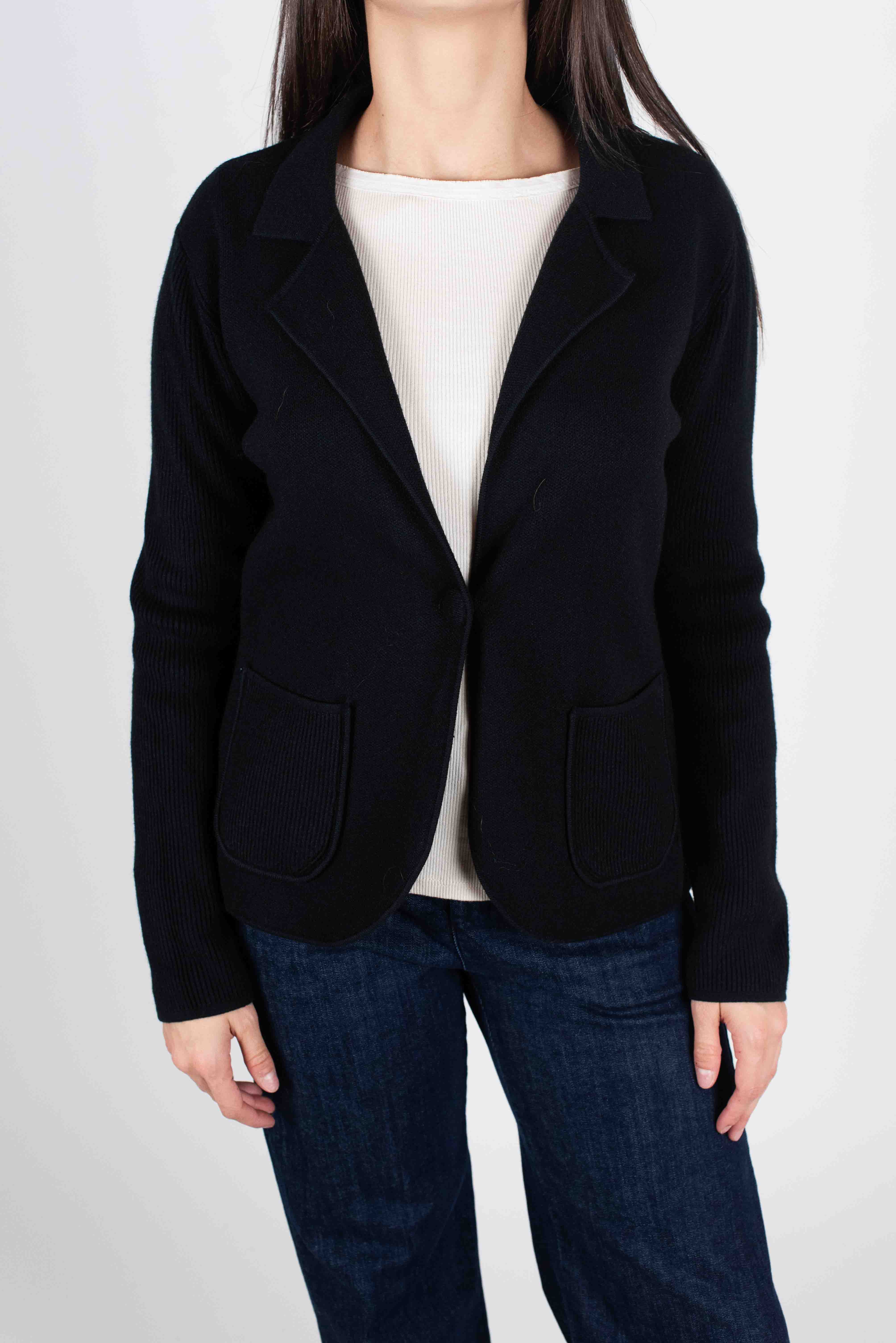 Giacca maglia a un bottone con maniche e tasche frontali a costine.