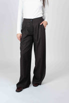 Pantalone palazzo quadri con pence  e con elastico  in vita dietro.