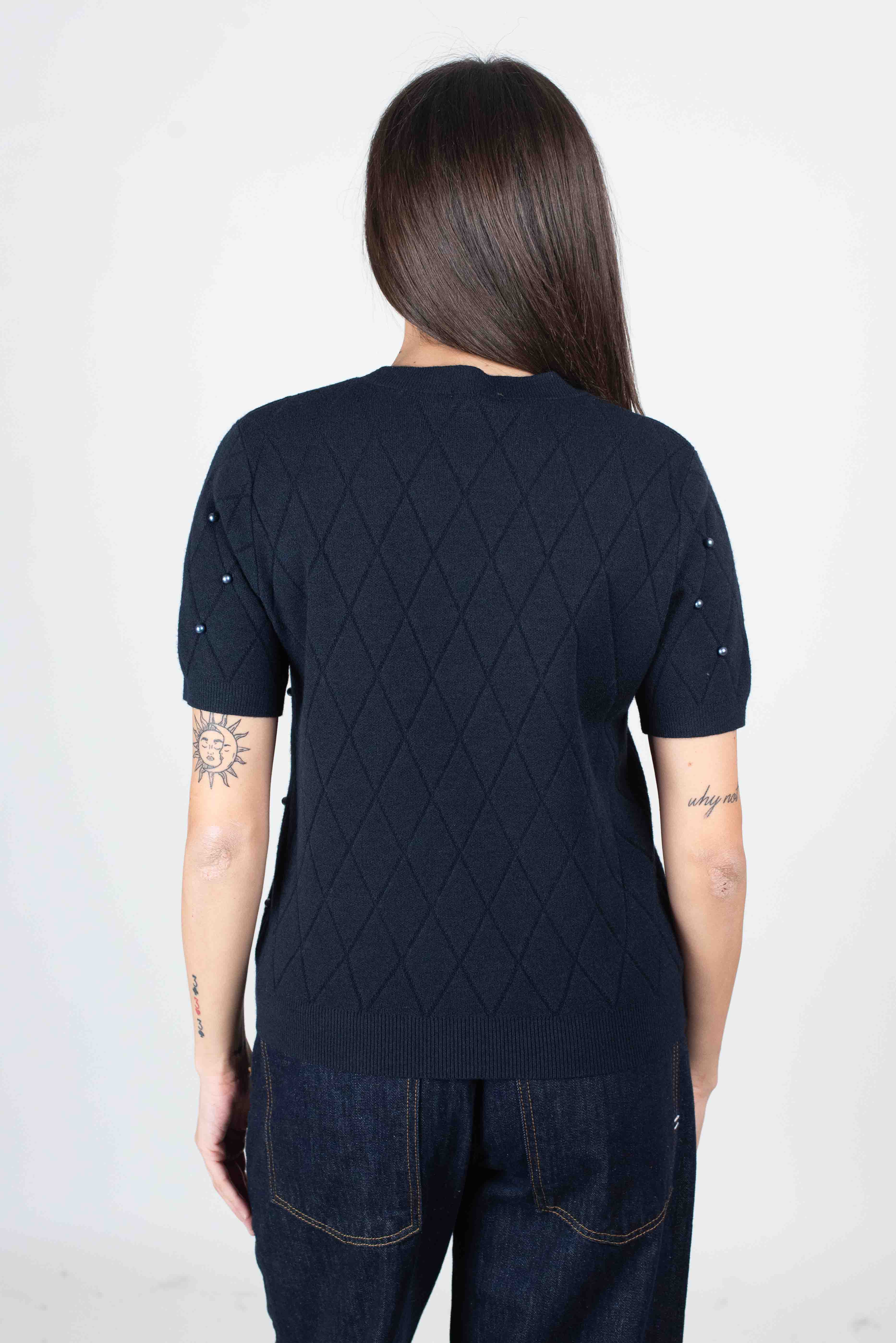 Maglia girocollo manica corta con ricamo e perle applicate.