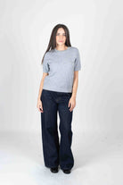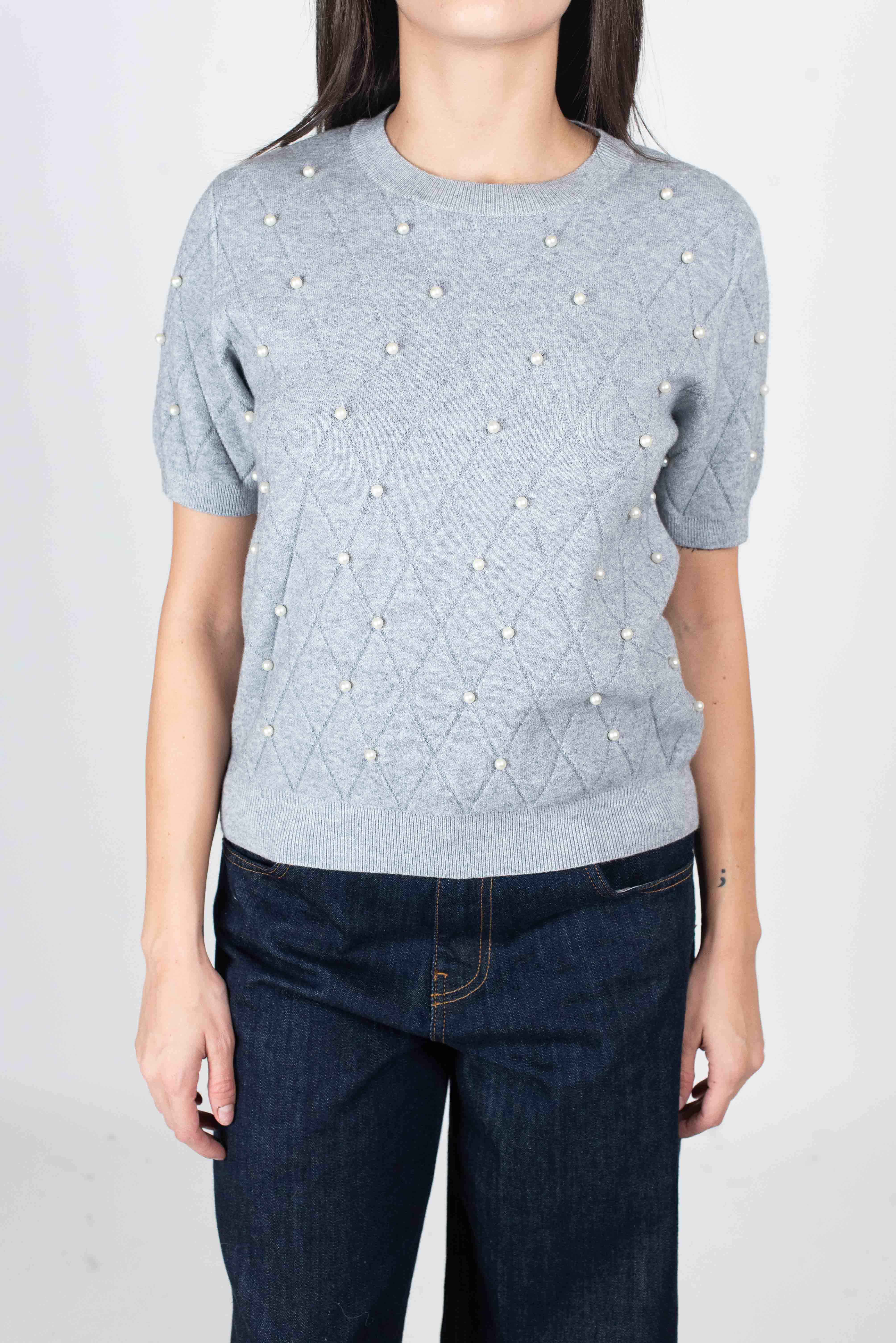 Maglia girocollo manica corta con ricamo e perle applicate.