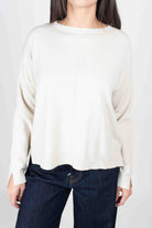 Maglia over con riga centrale asimmetrica piu' lunga dietro con spacchi laterali e sul polsino.