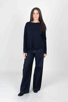 Maglia over con riga centrale asimmetrica piu' lunga dietro con spacchi laterali e sul polsino.