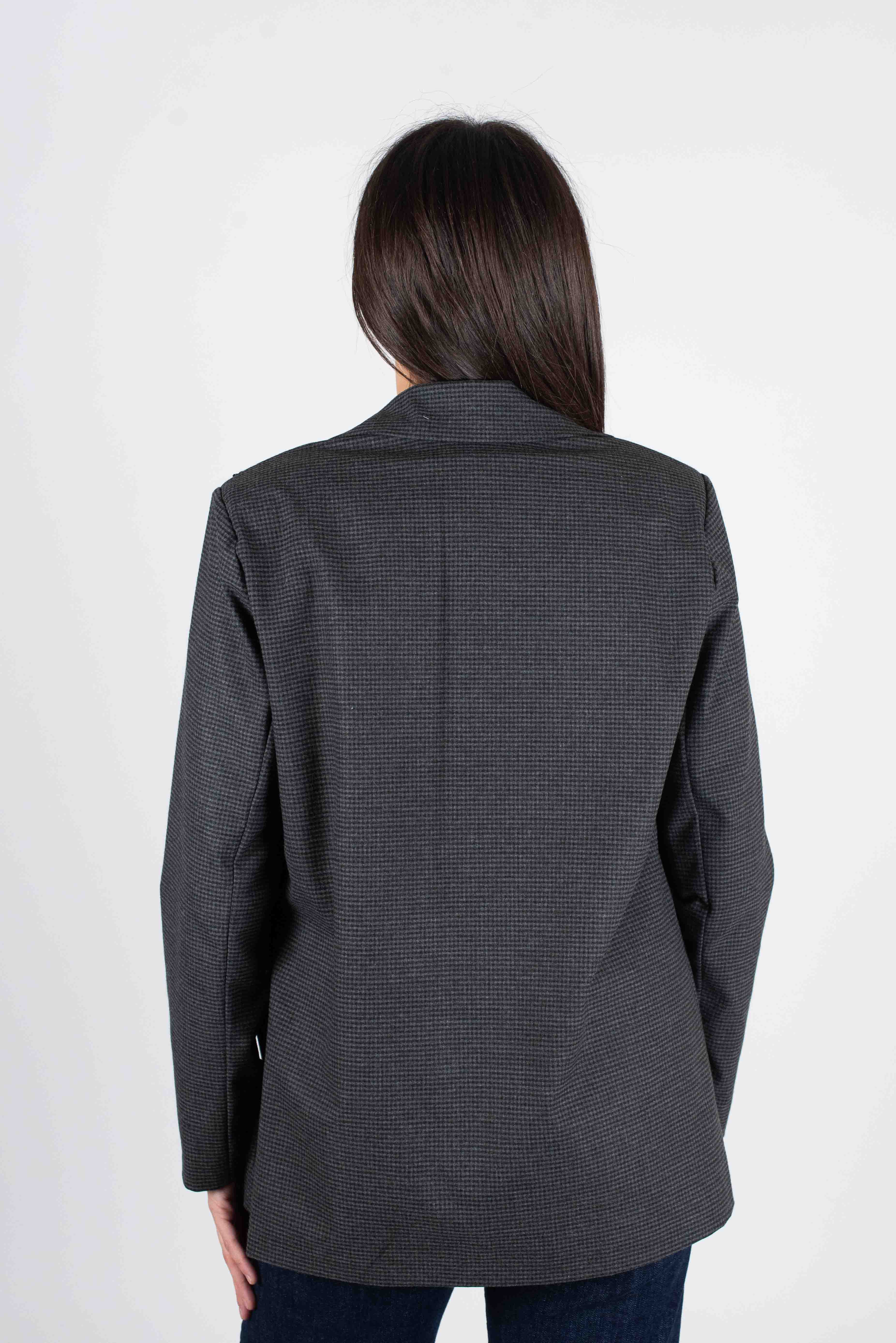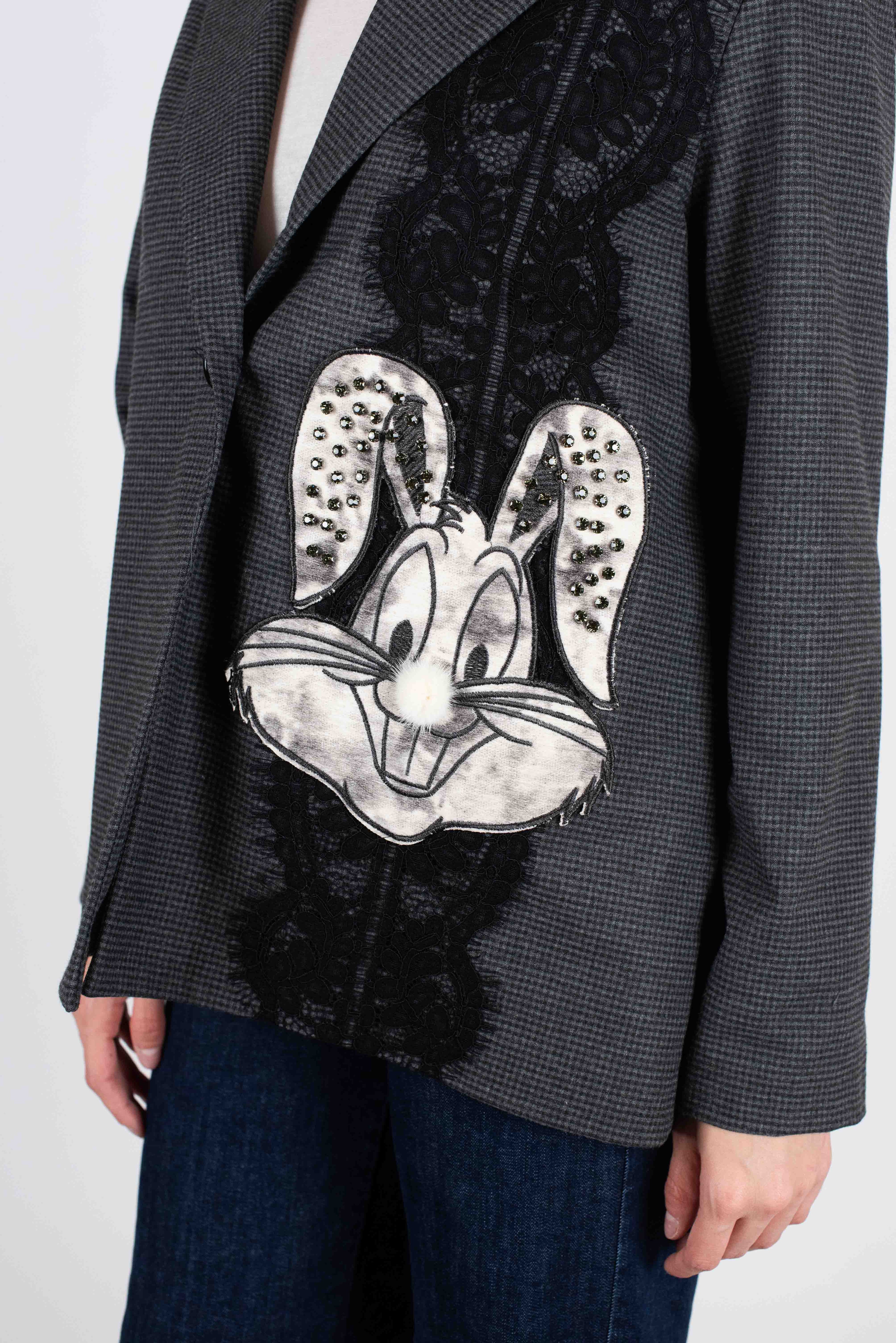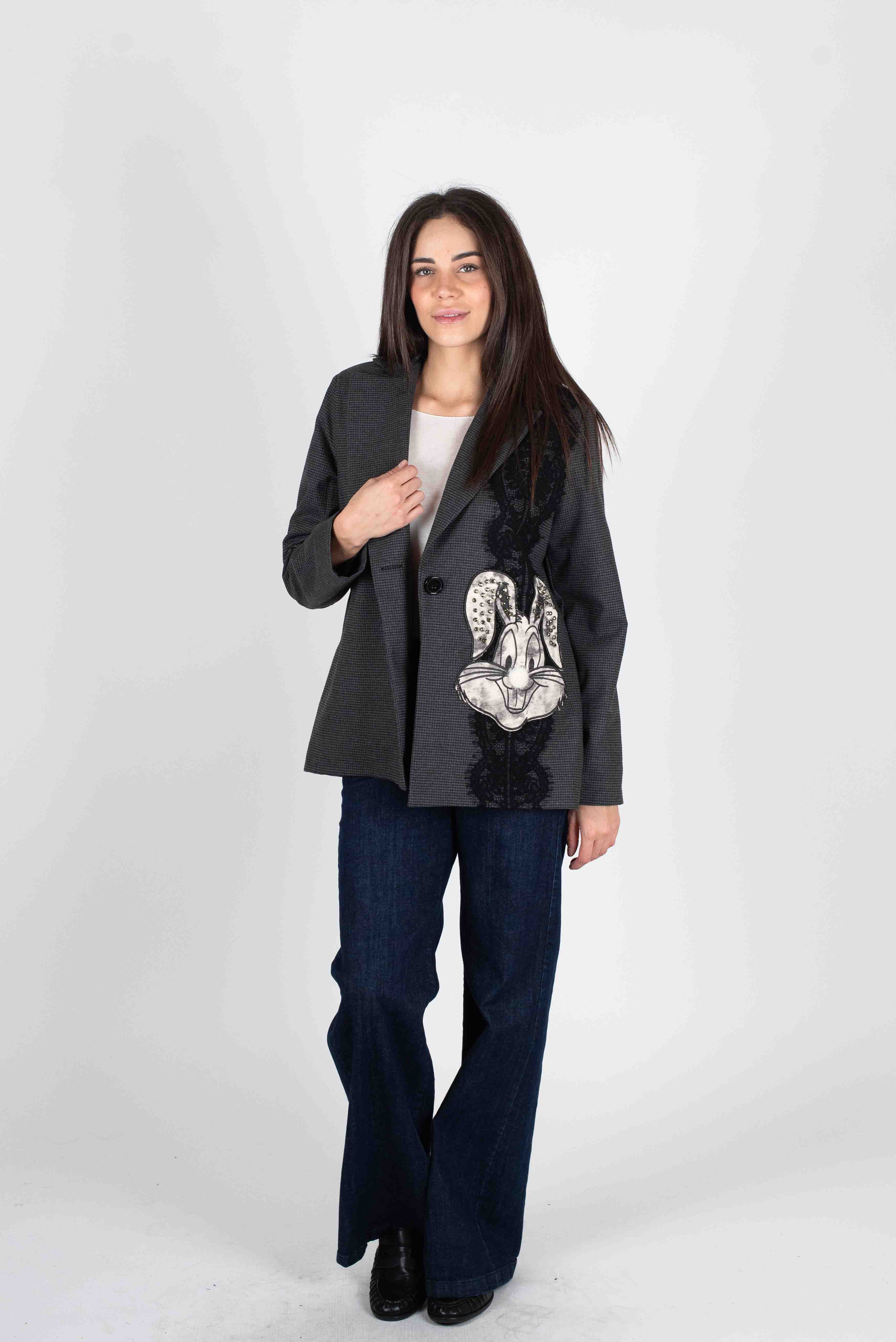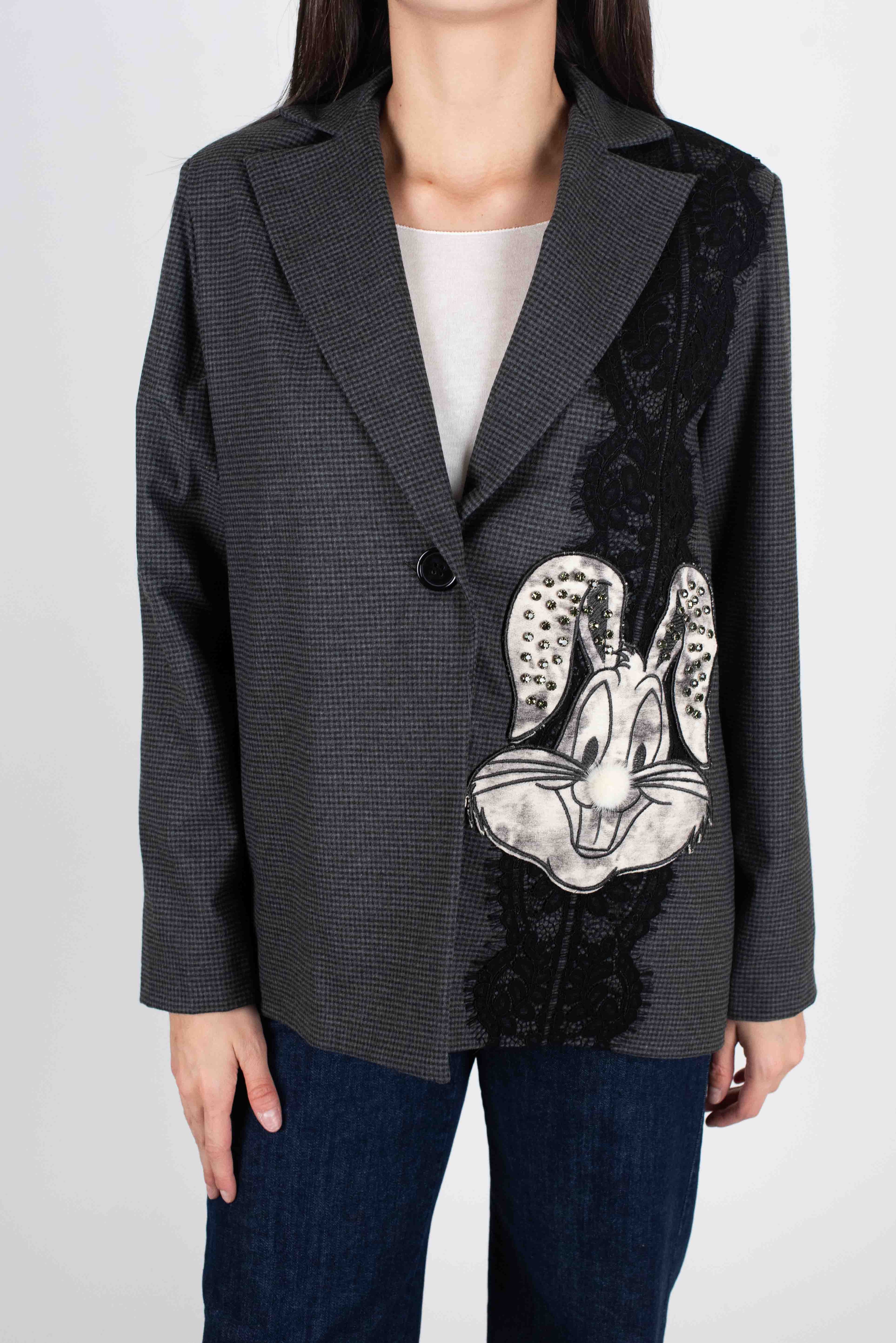 Giacca pied de poule con un bottone e ricamo in pizzo con patch applicato.