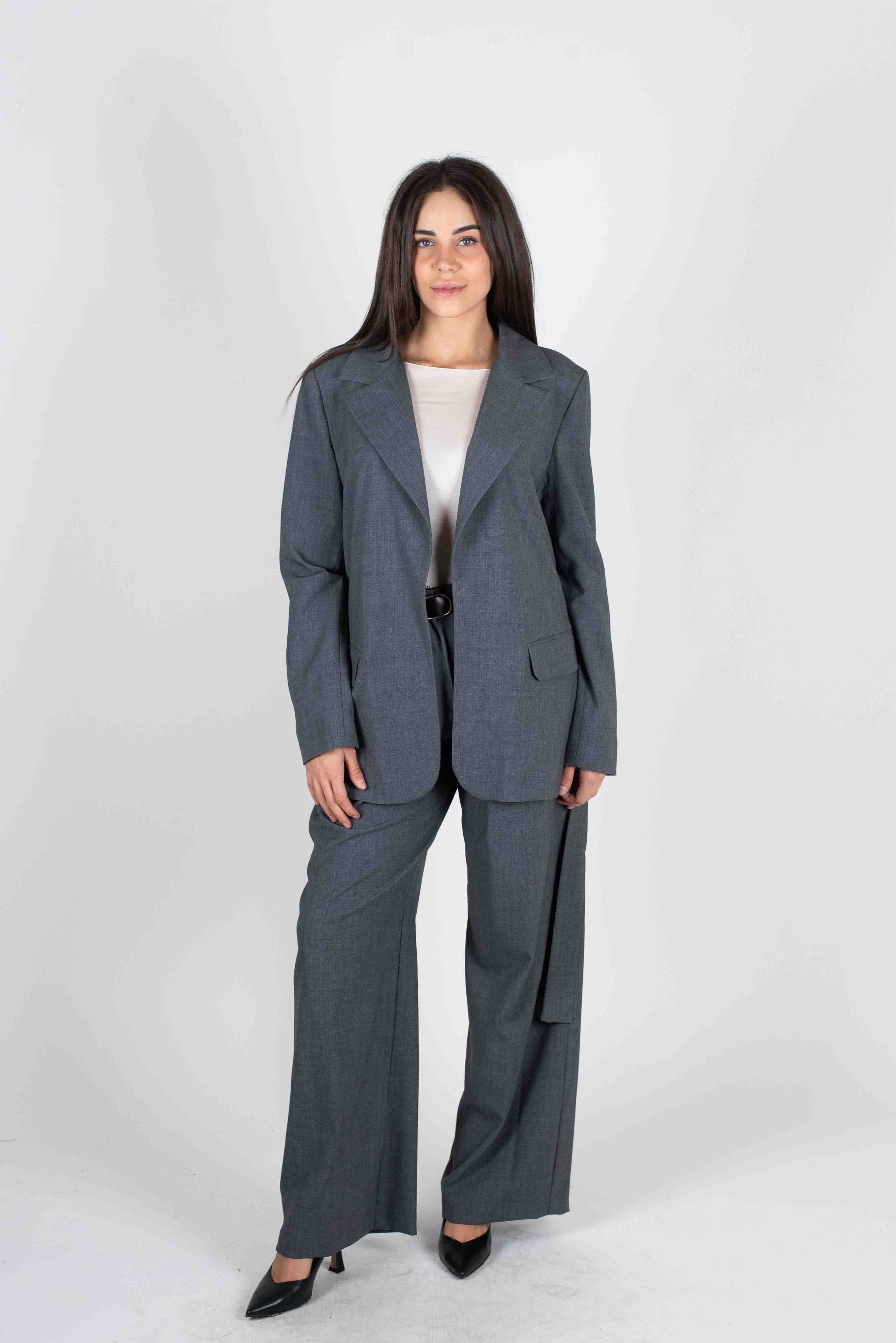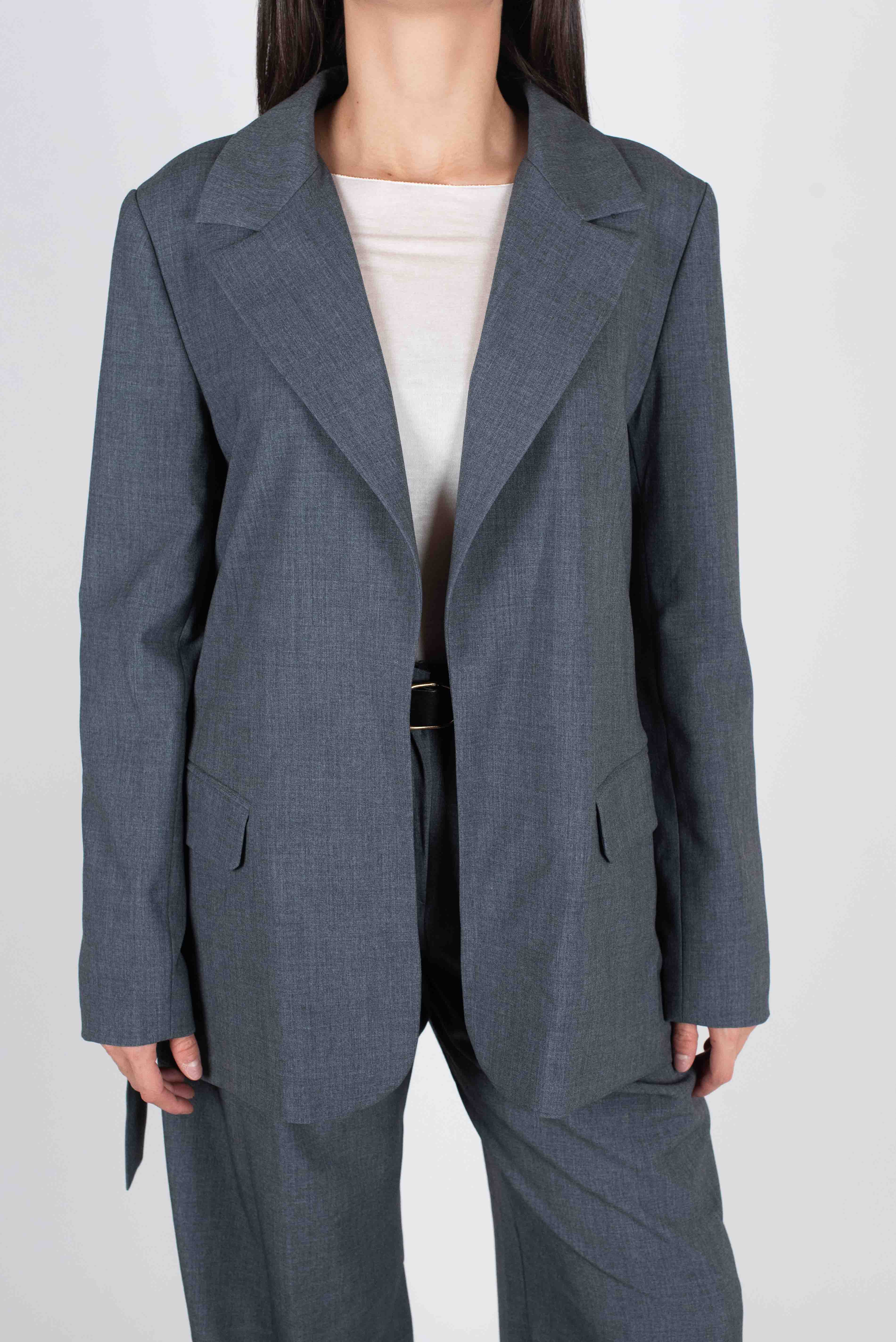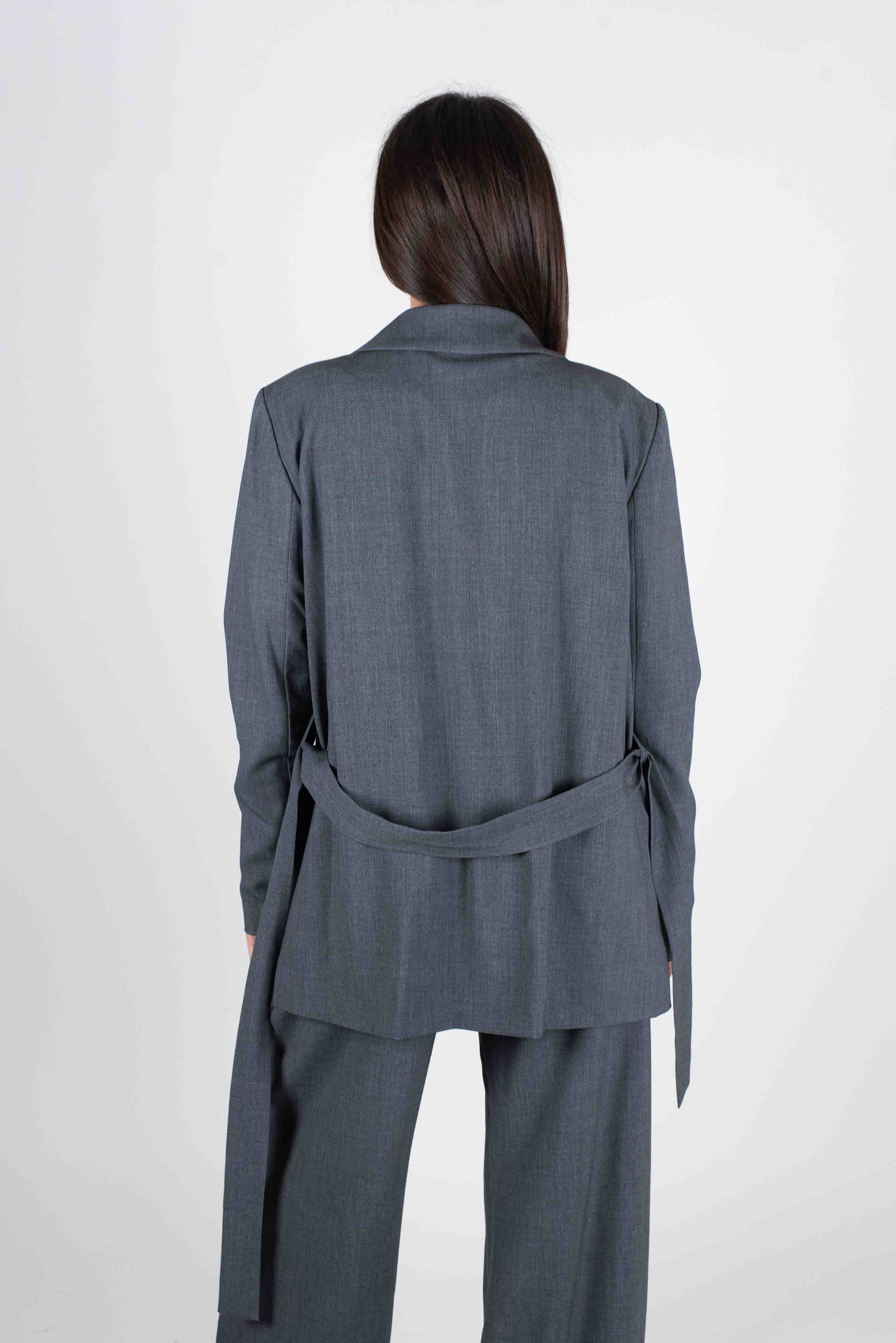 Giacca senza bottoni chiusura con fusciacca e tasche a toppa.