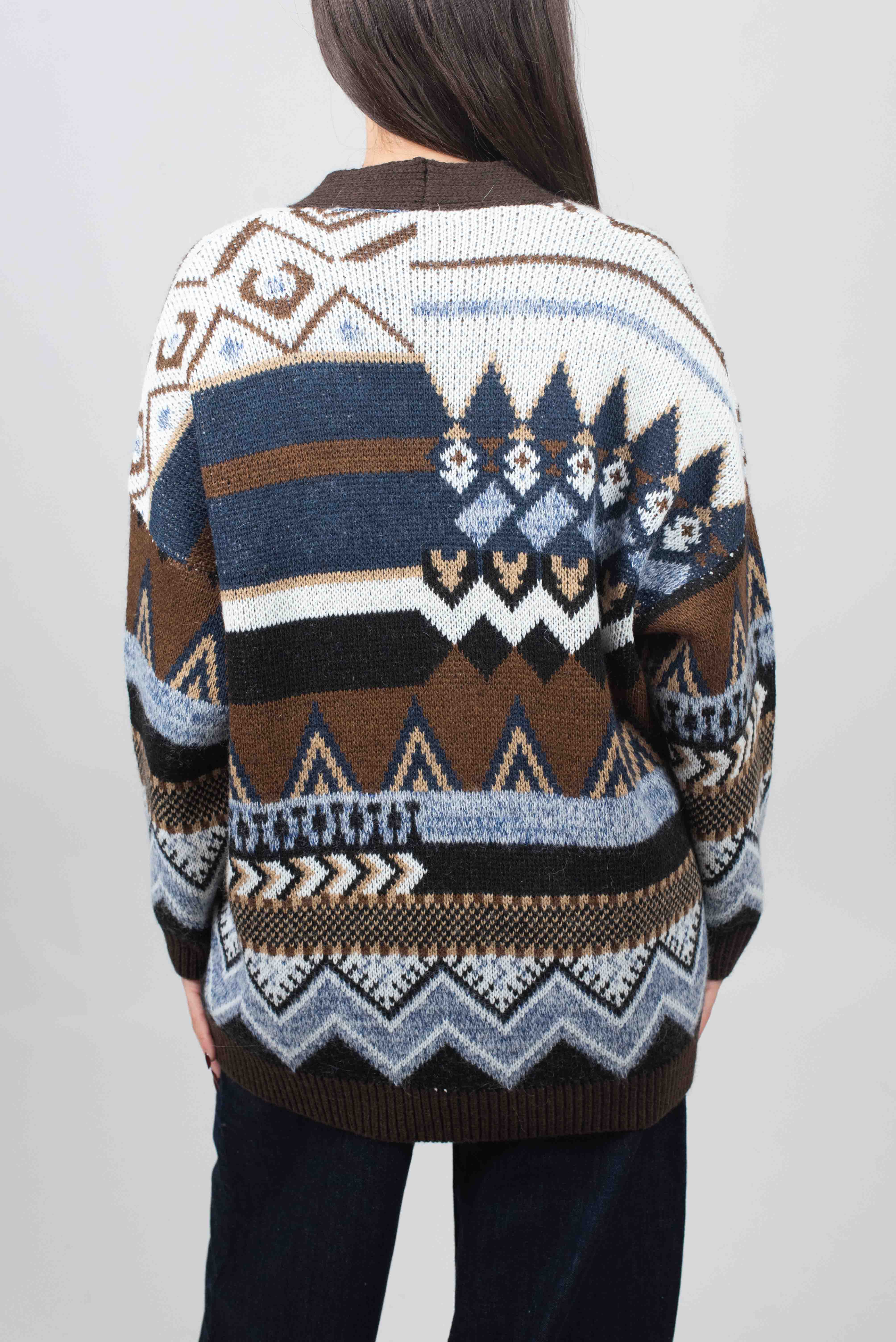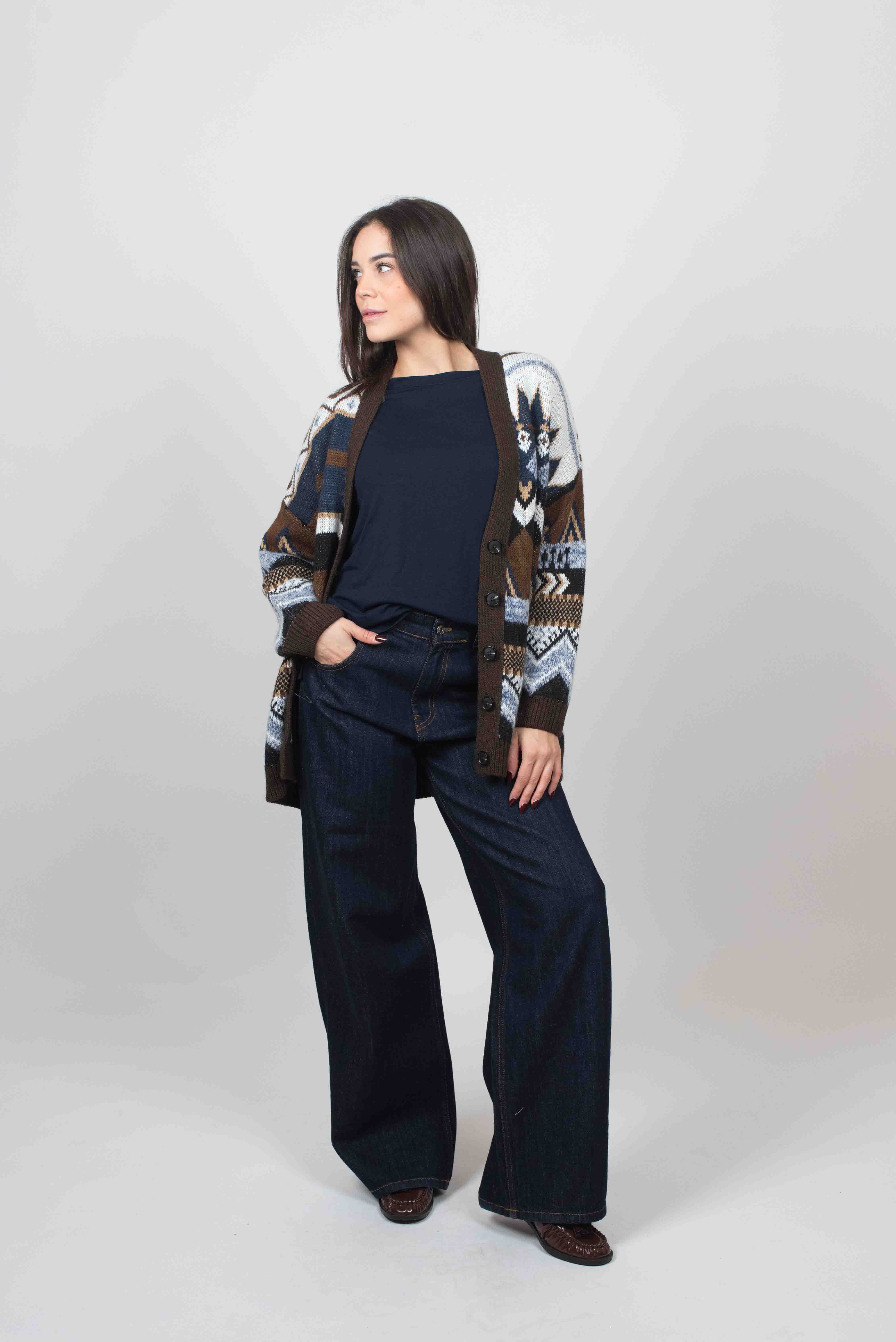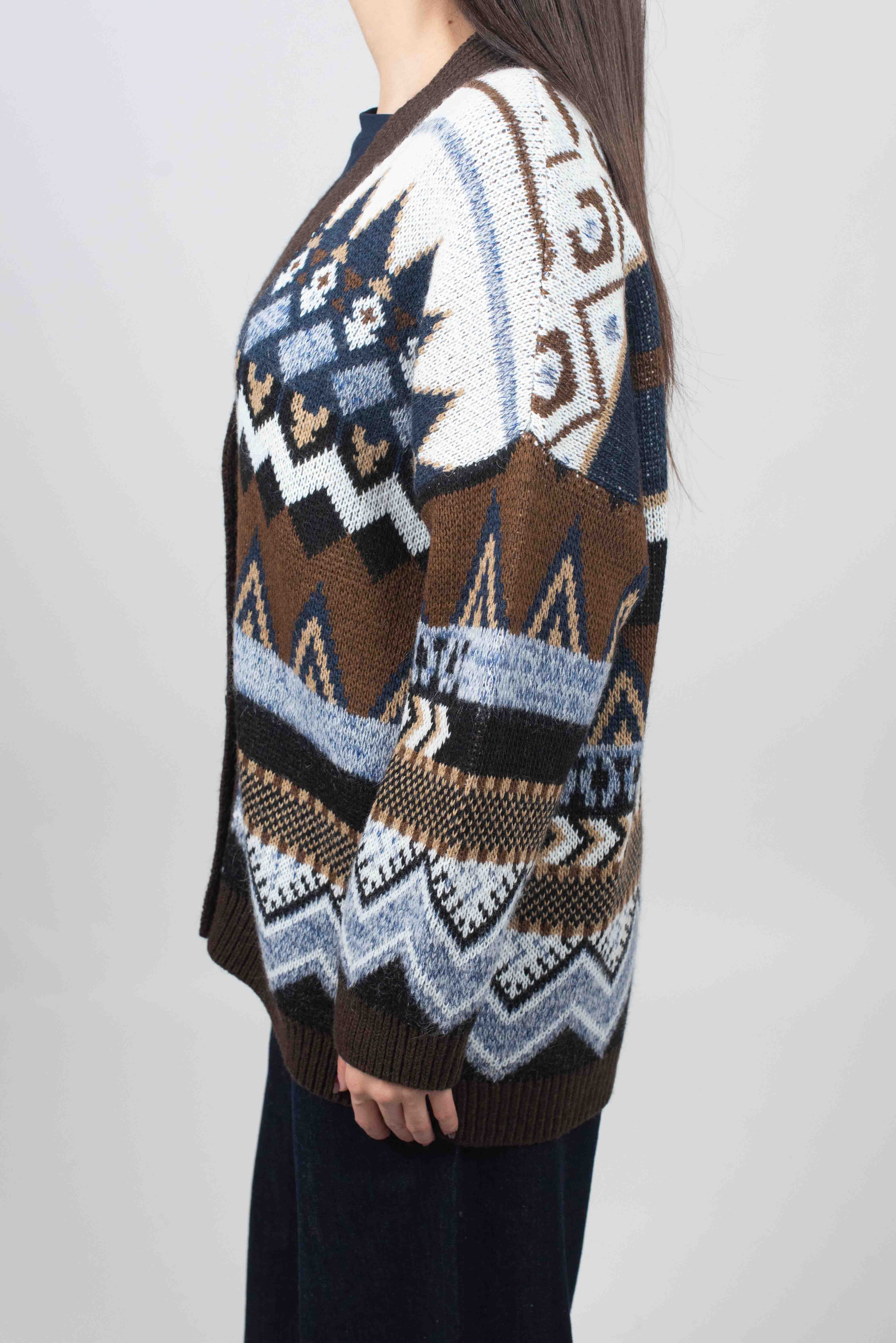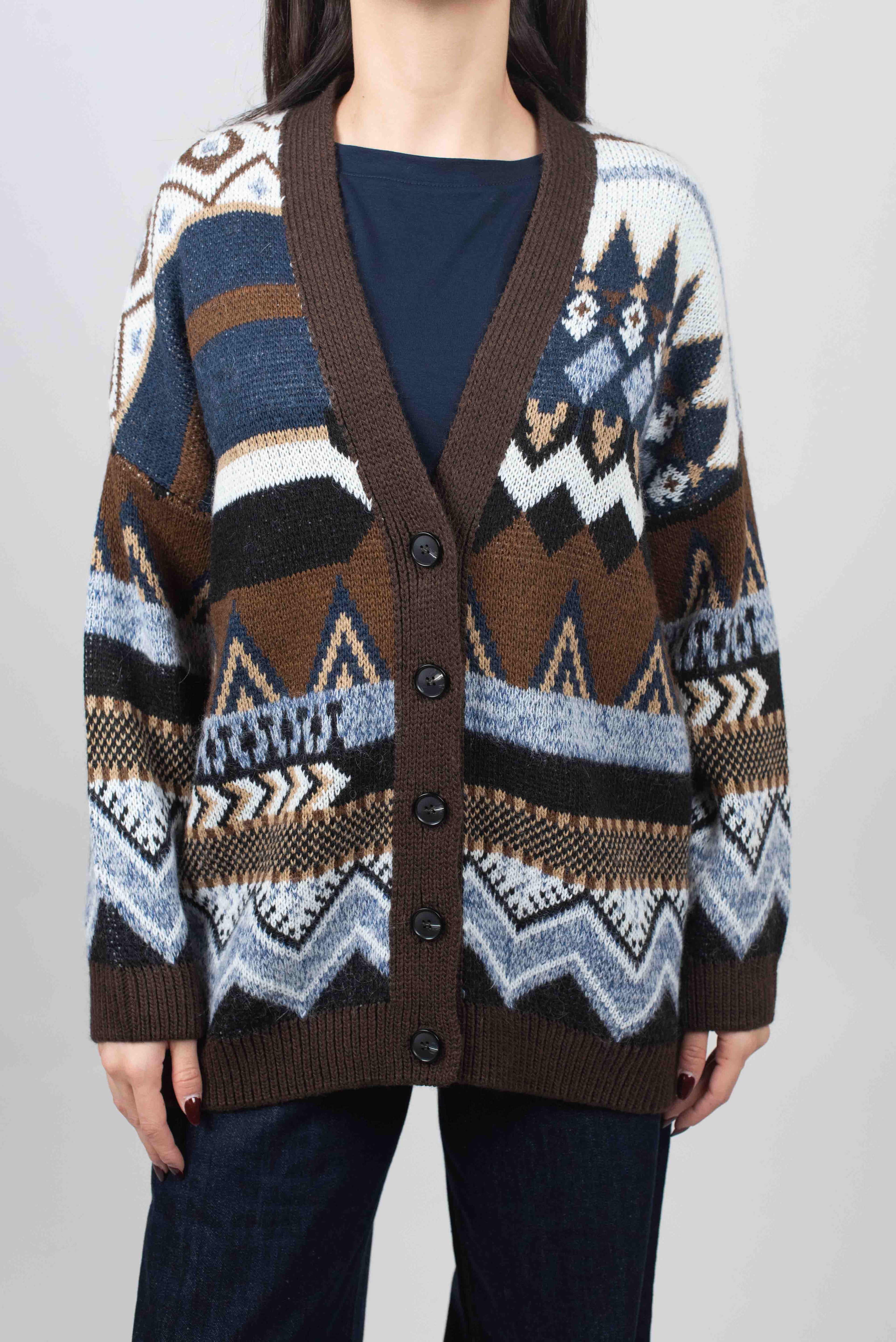 Cardigan 5 bottoni con fantasia geometrica.