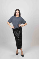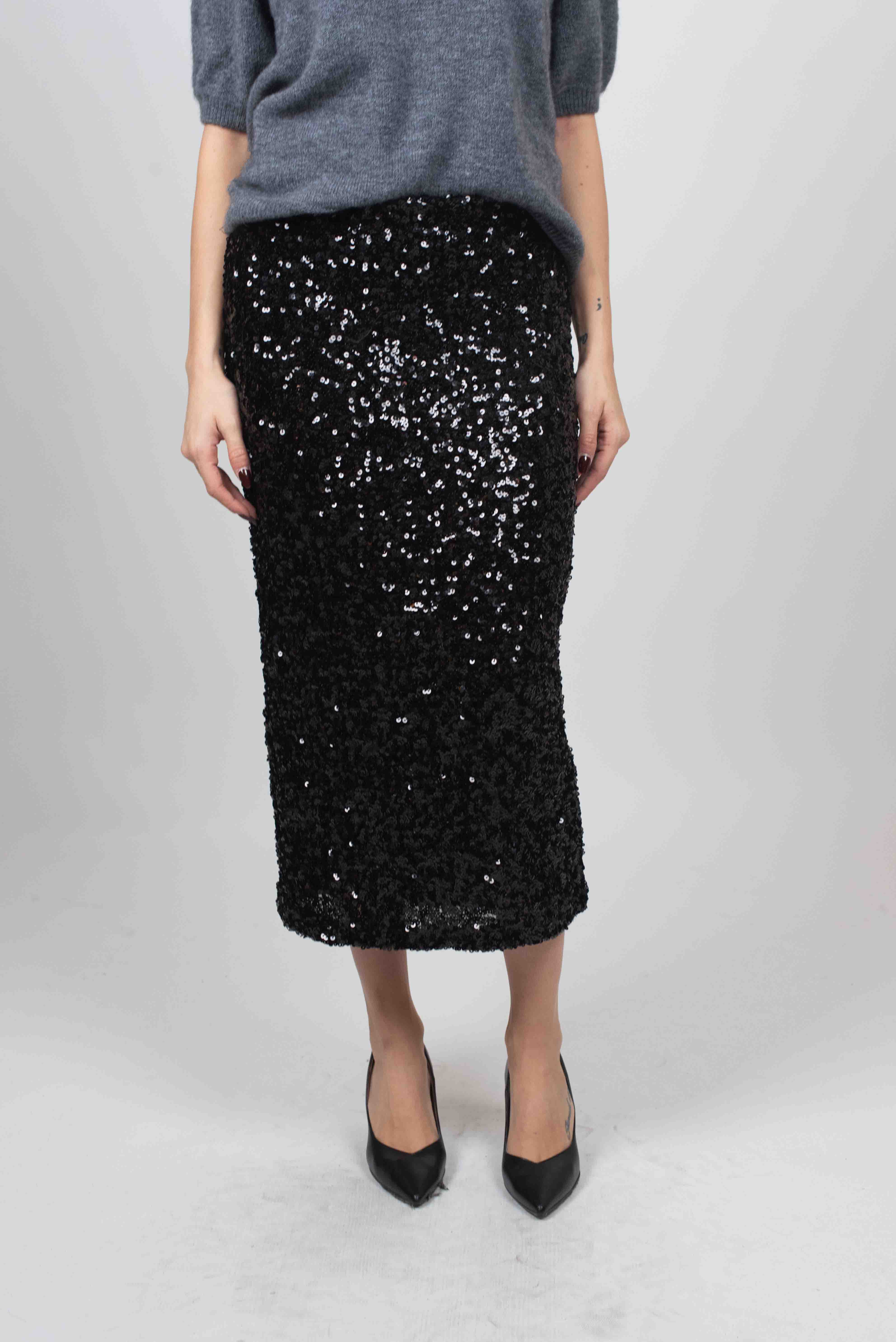 Gonna midi con paillettes spacco dietro e tessuto elasticizzato.