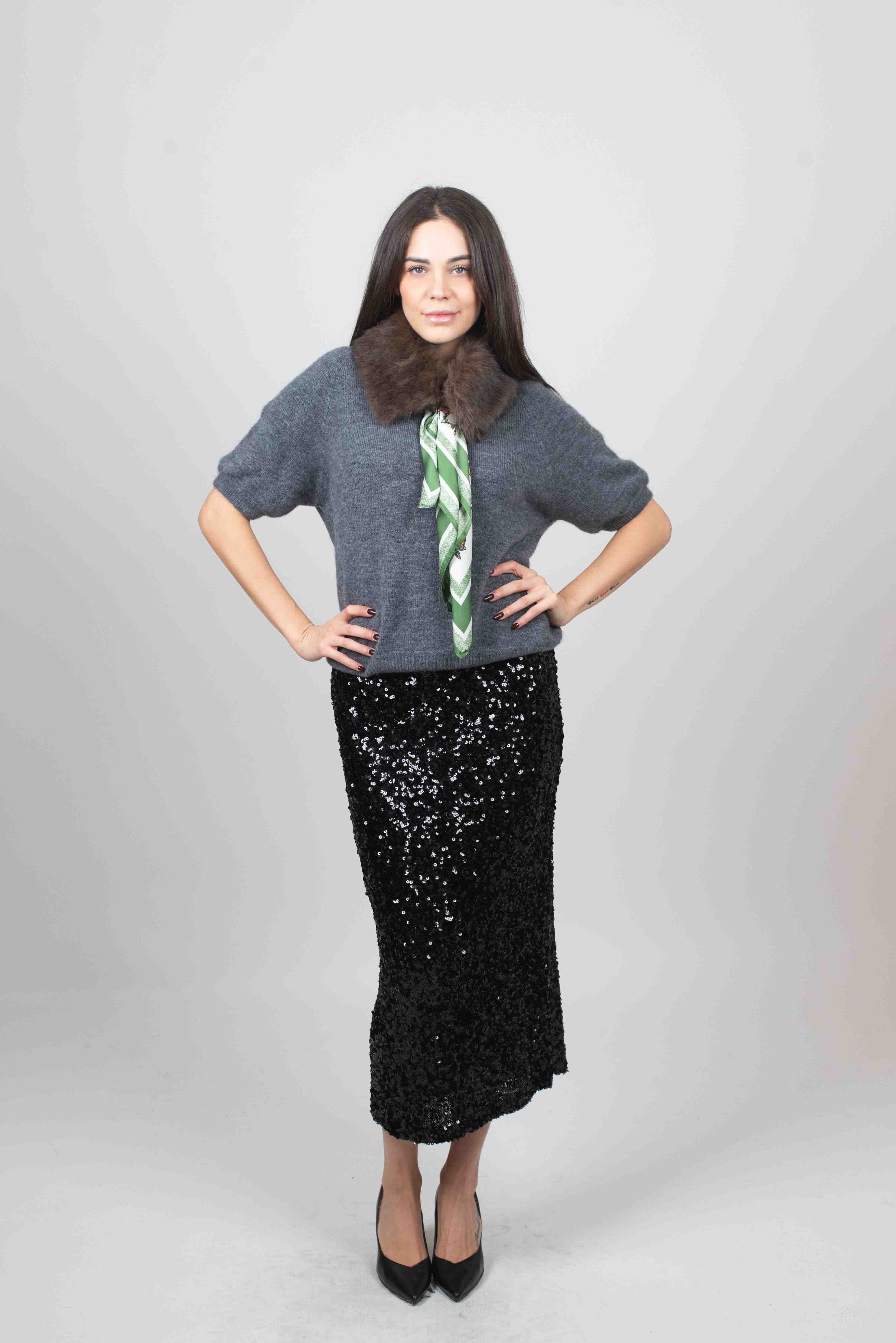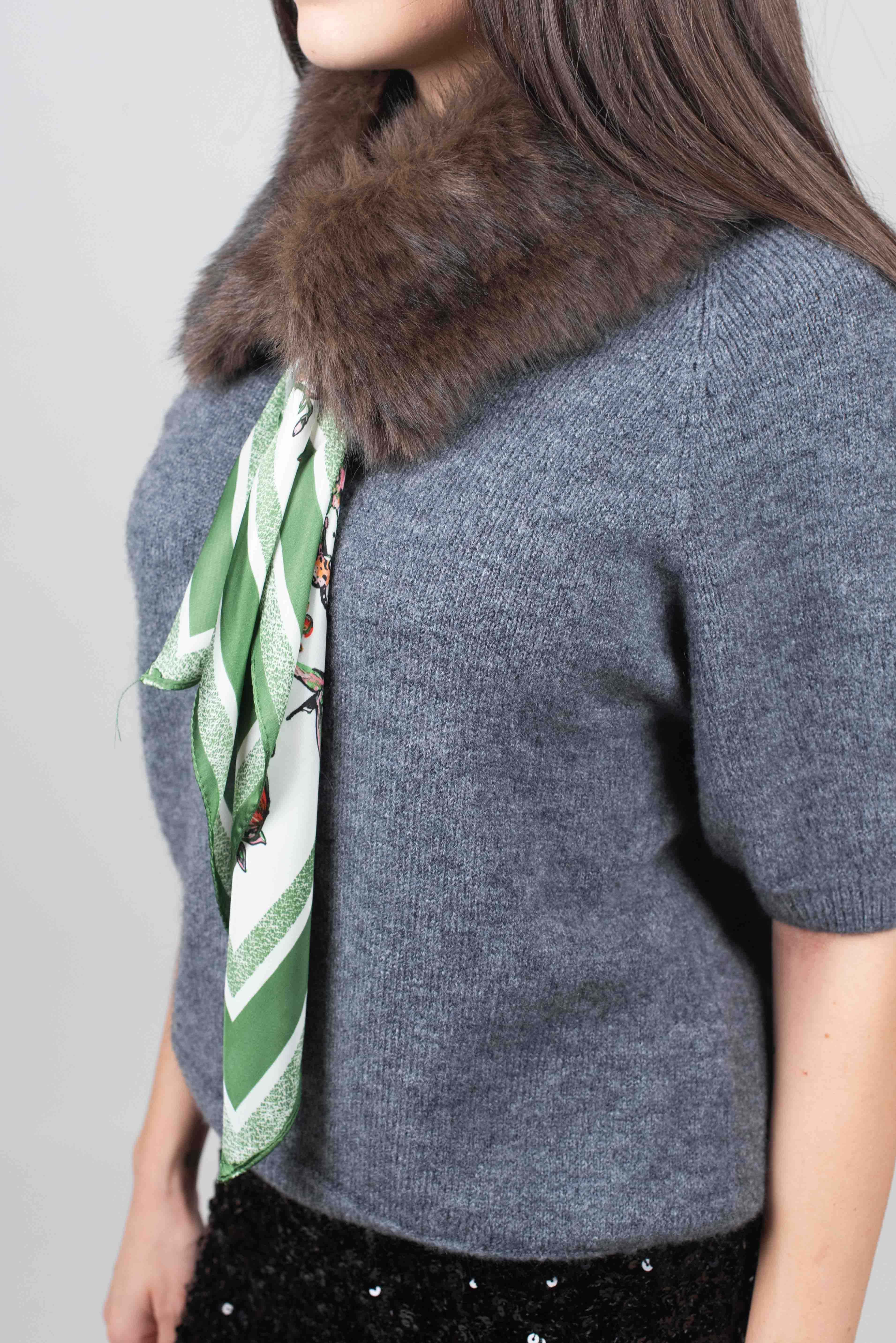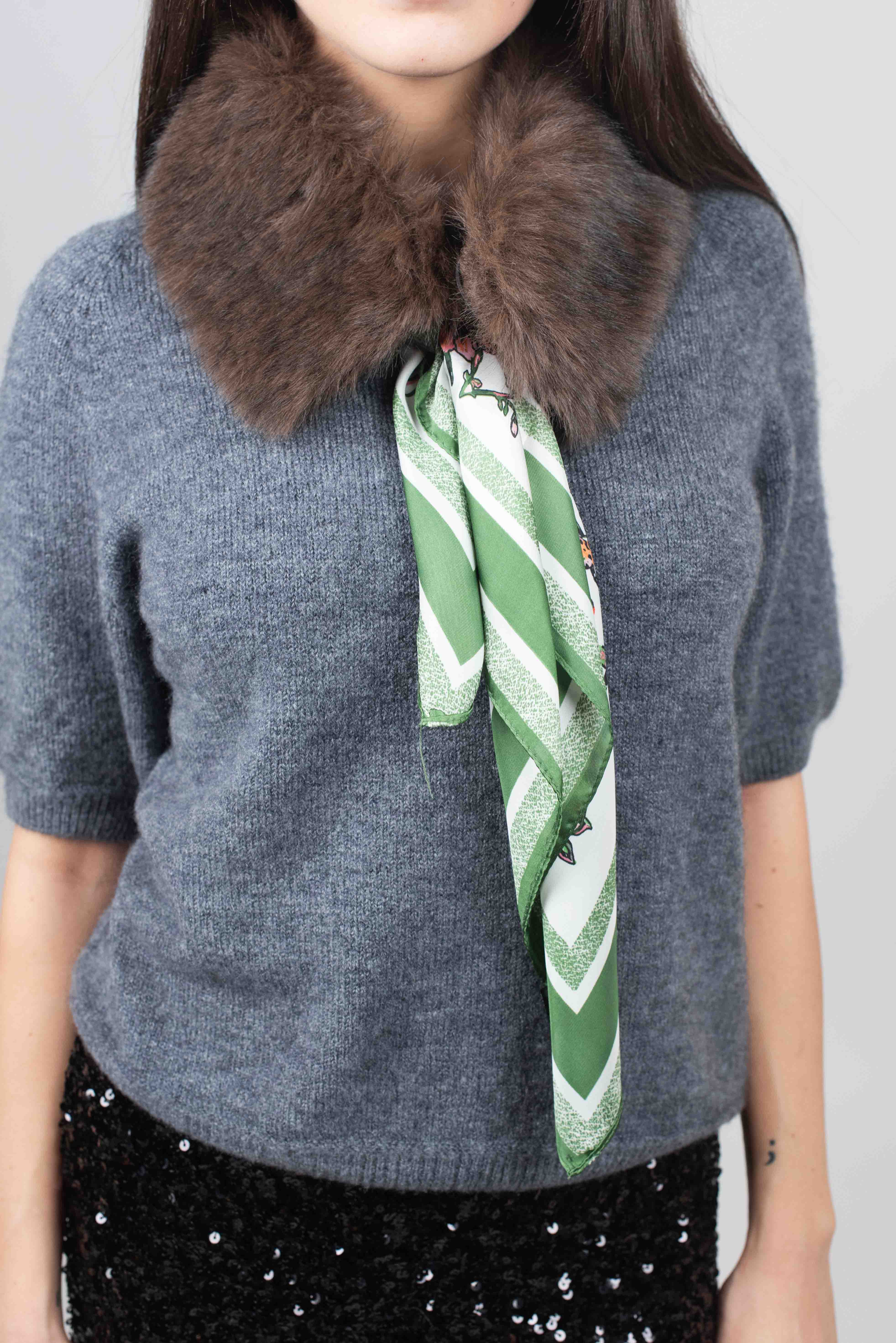 Collo in ecopelliccia con foulard fantasia in contrasto.
