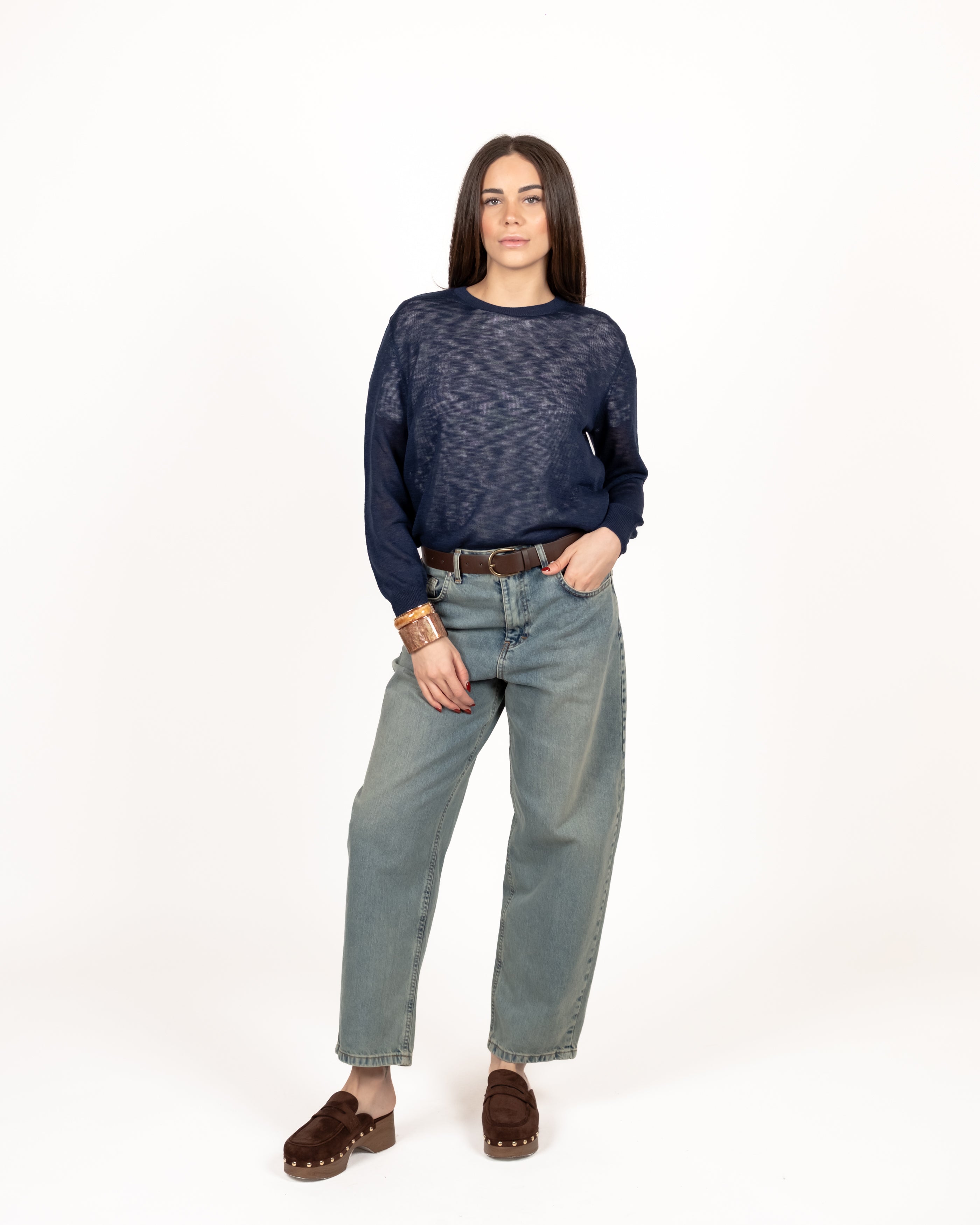 Maglia rasata girocollo con maniche lunghe.