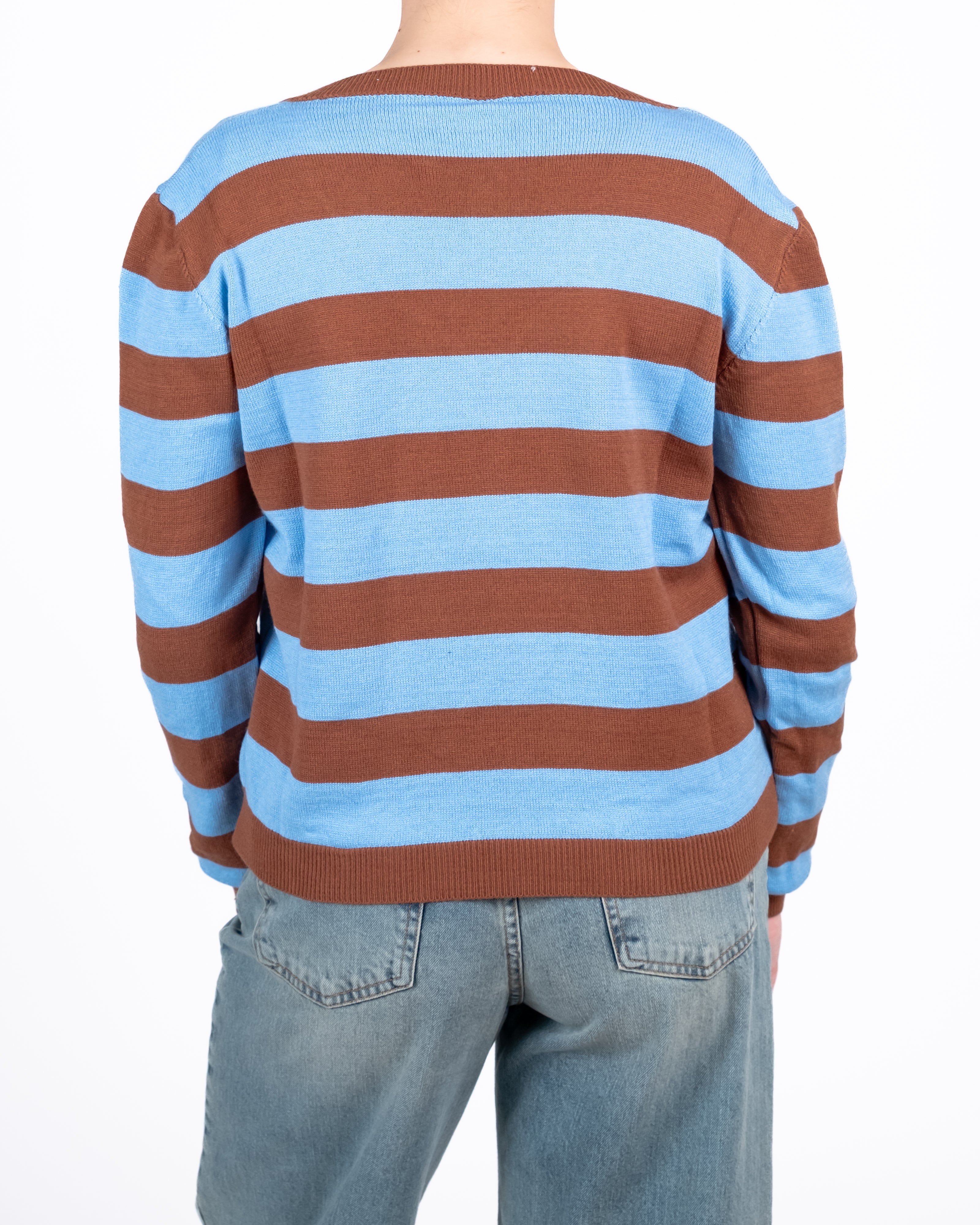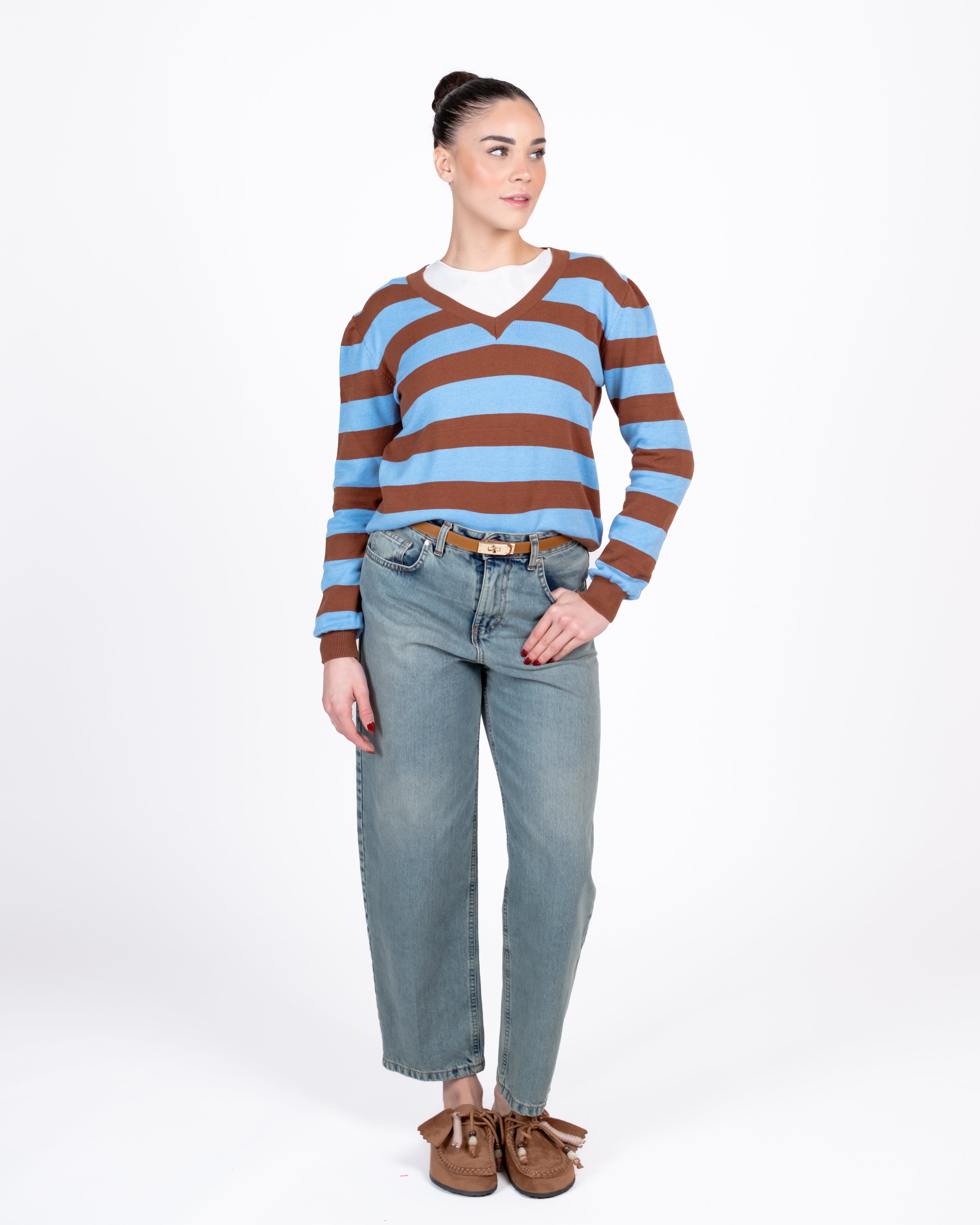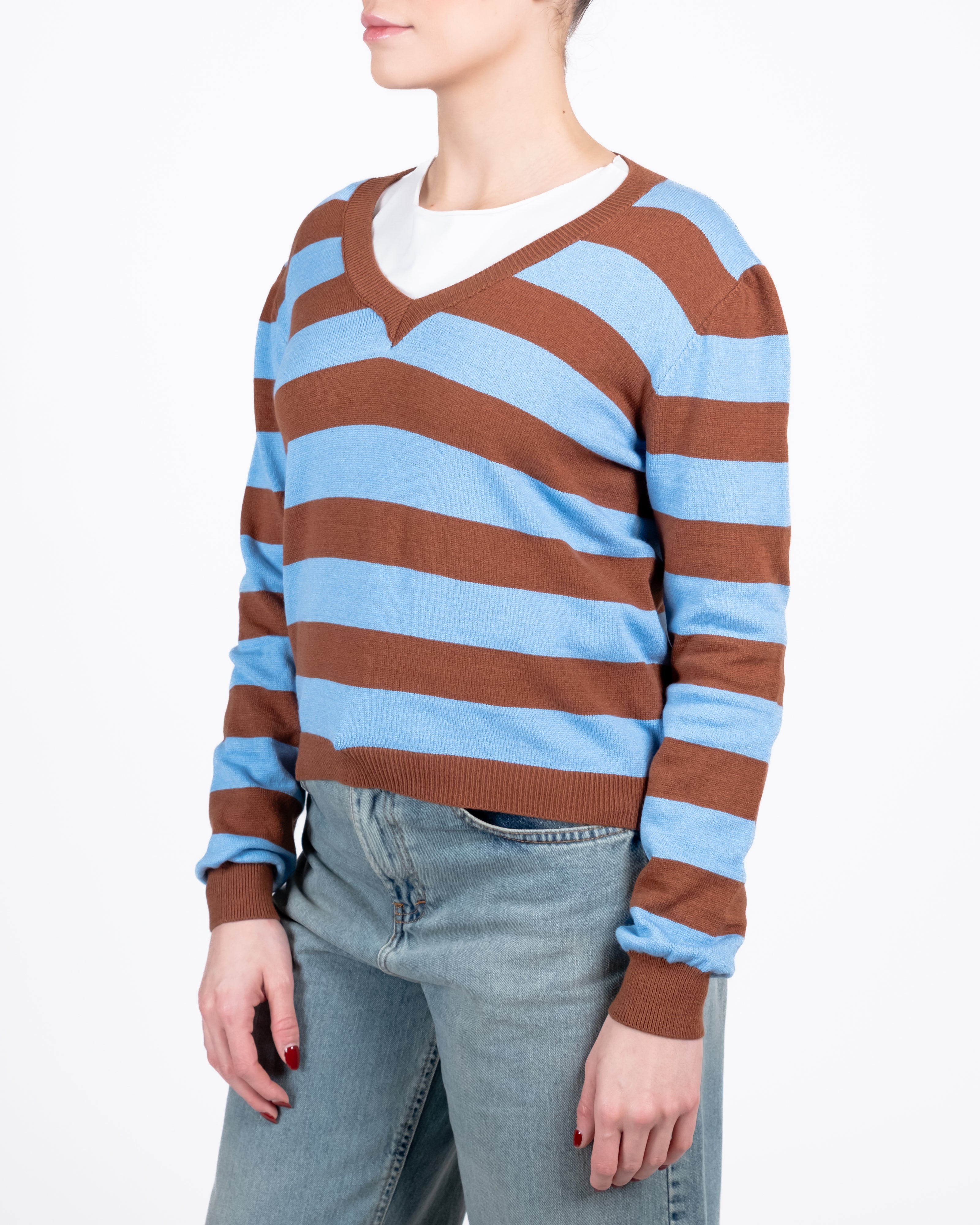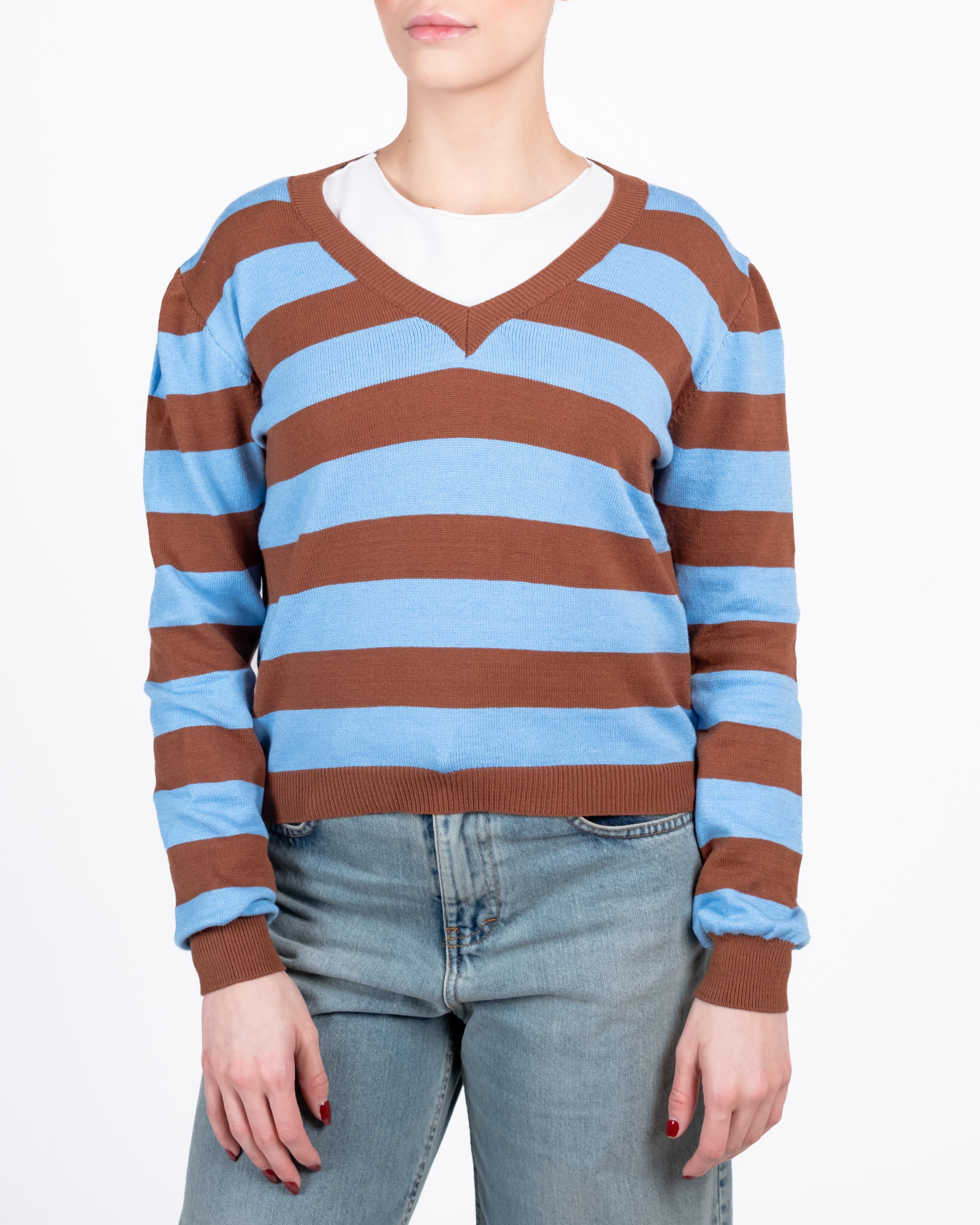 Tensione In Maglia Righe Collo V - CUOIO/CELESTE