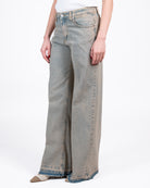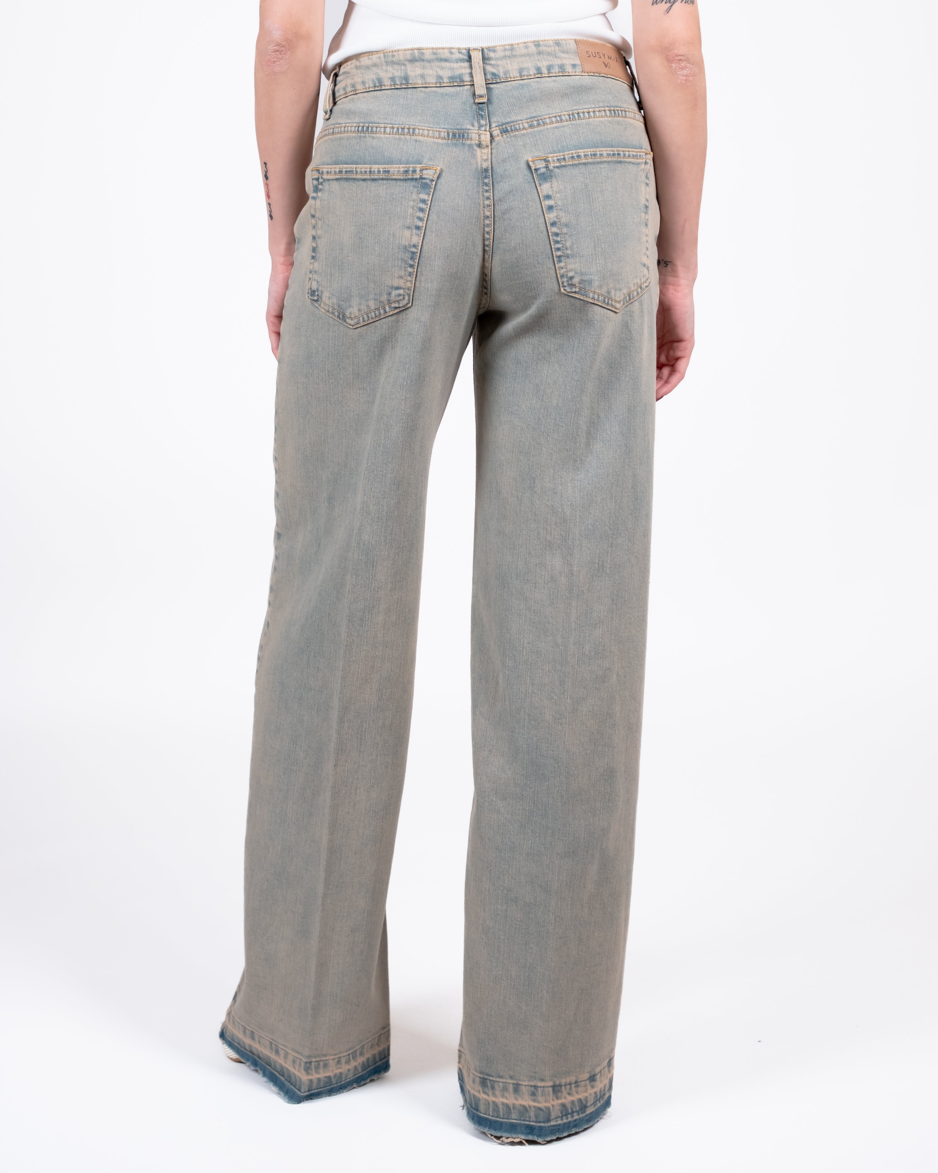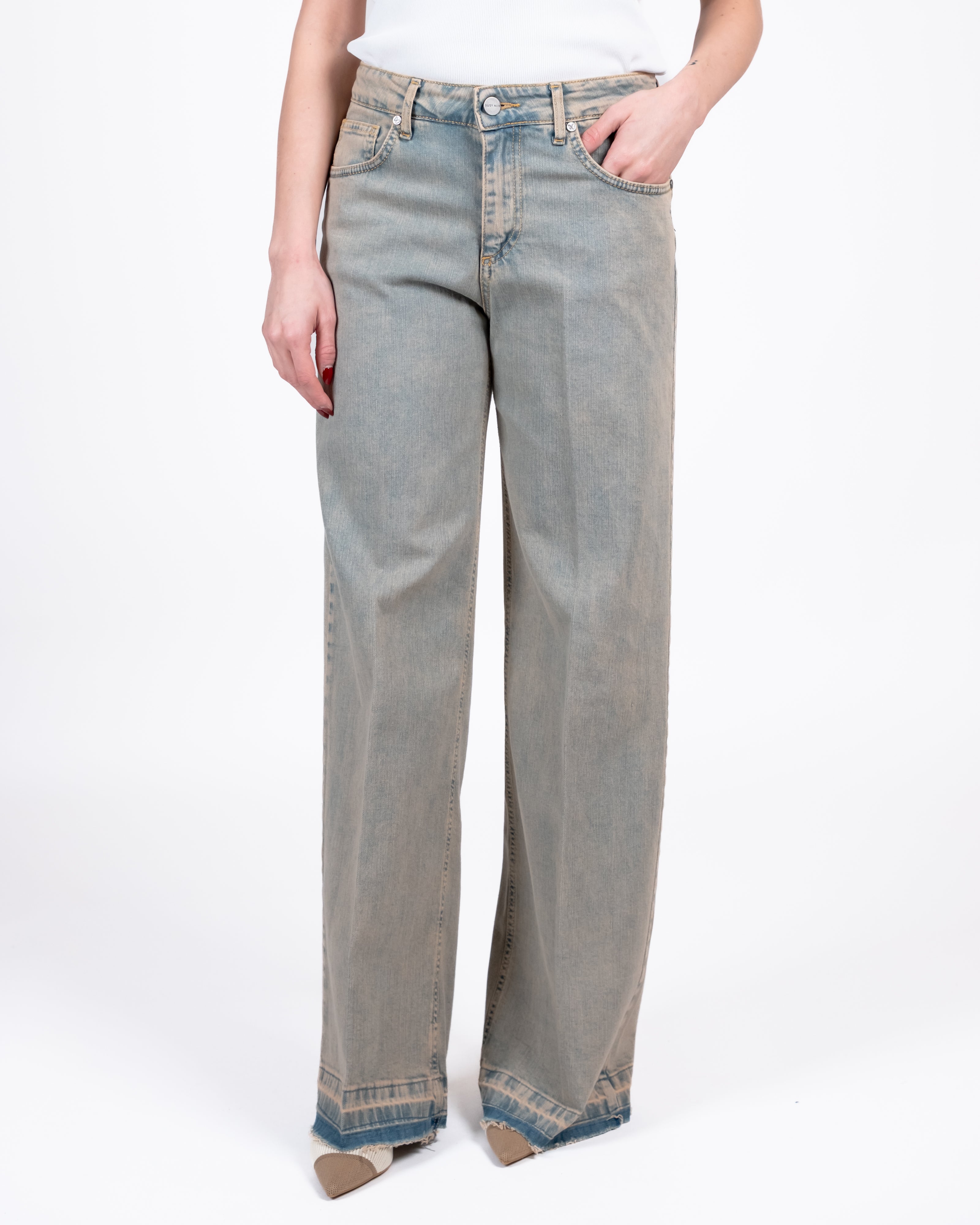 Jeans palazzo elasticizzato lavaggio con orlo vivo.