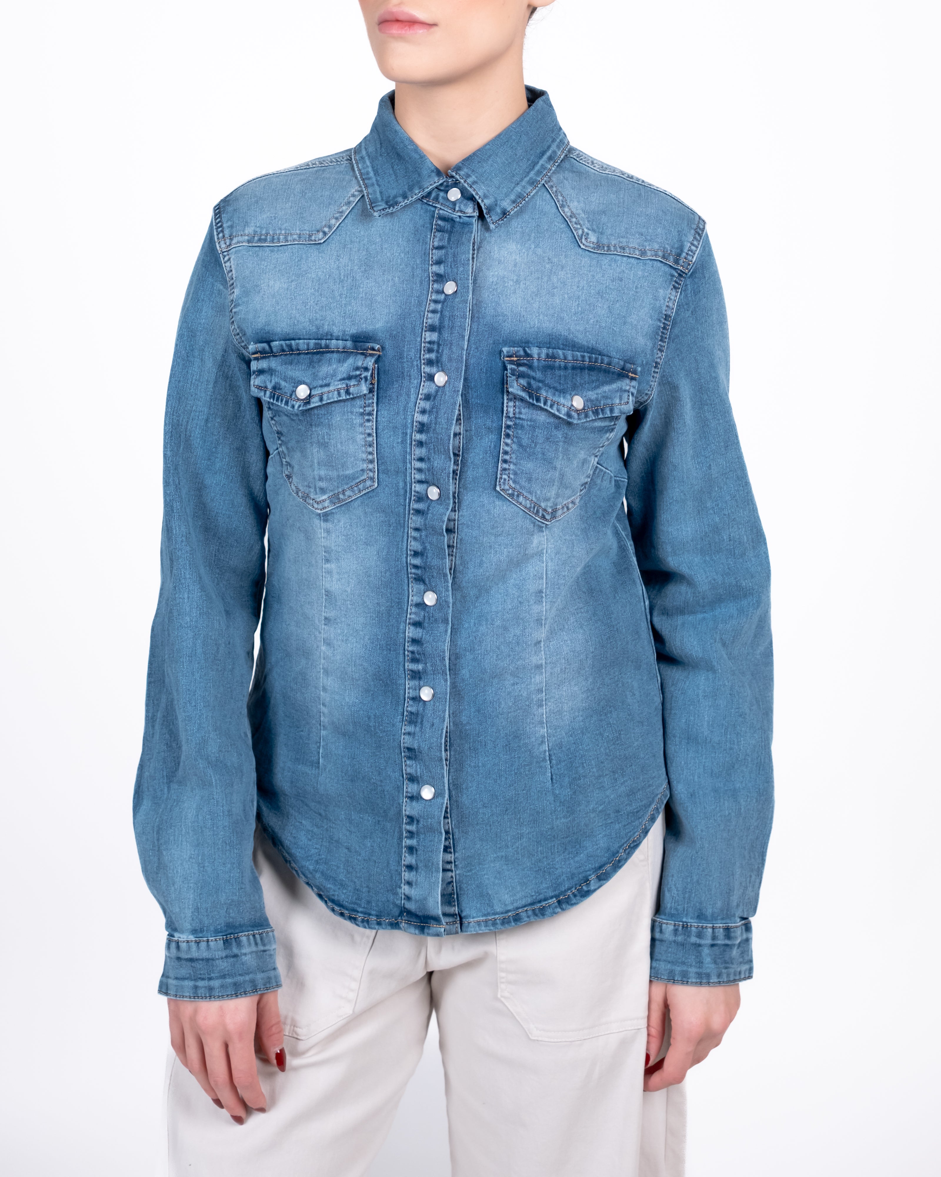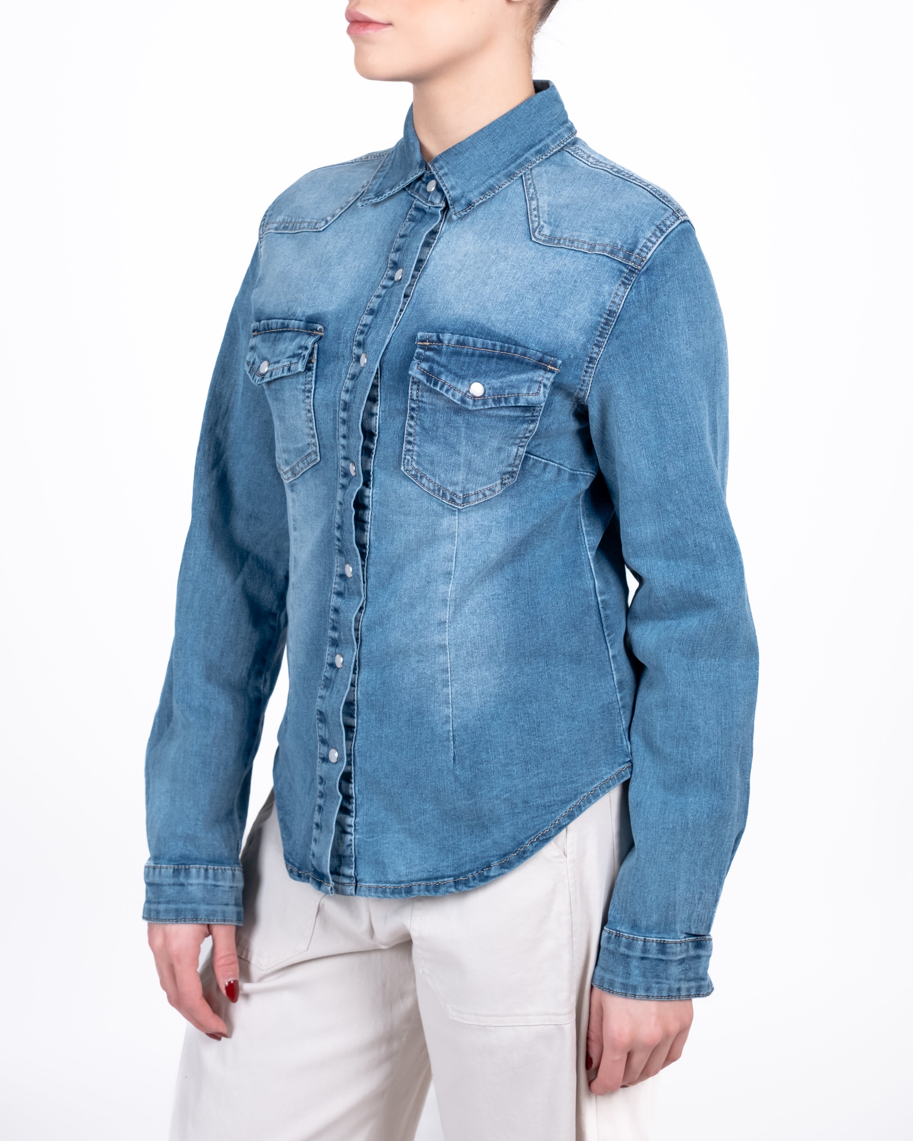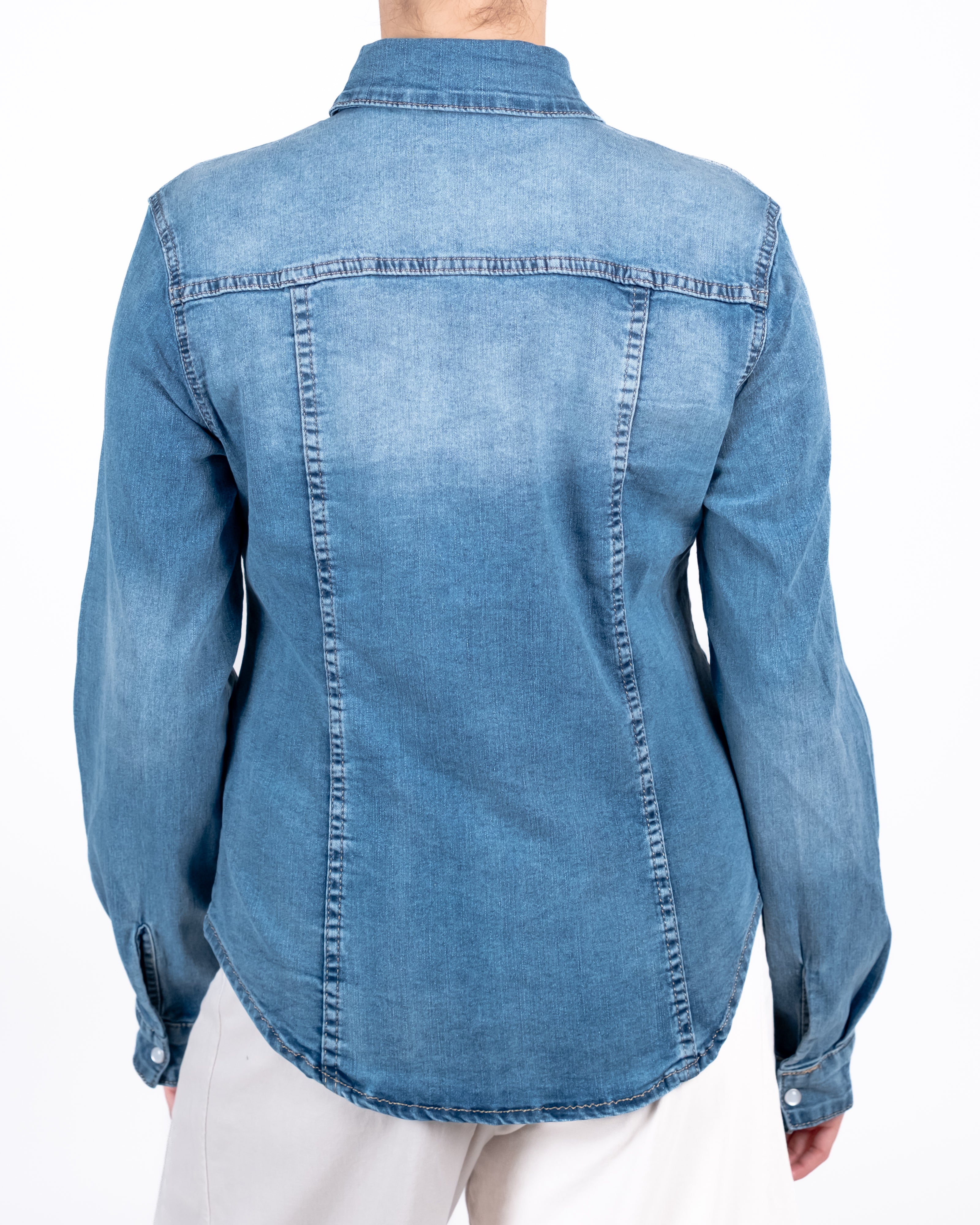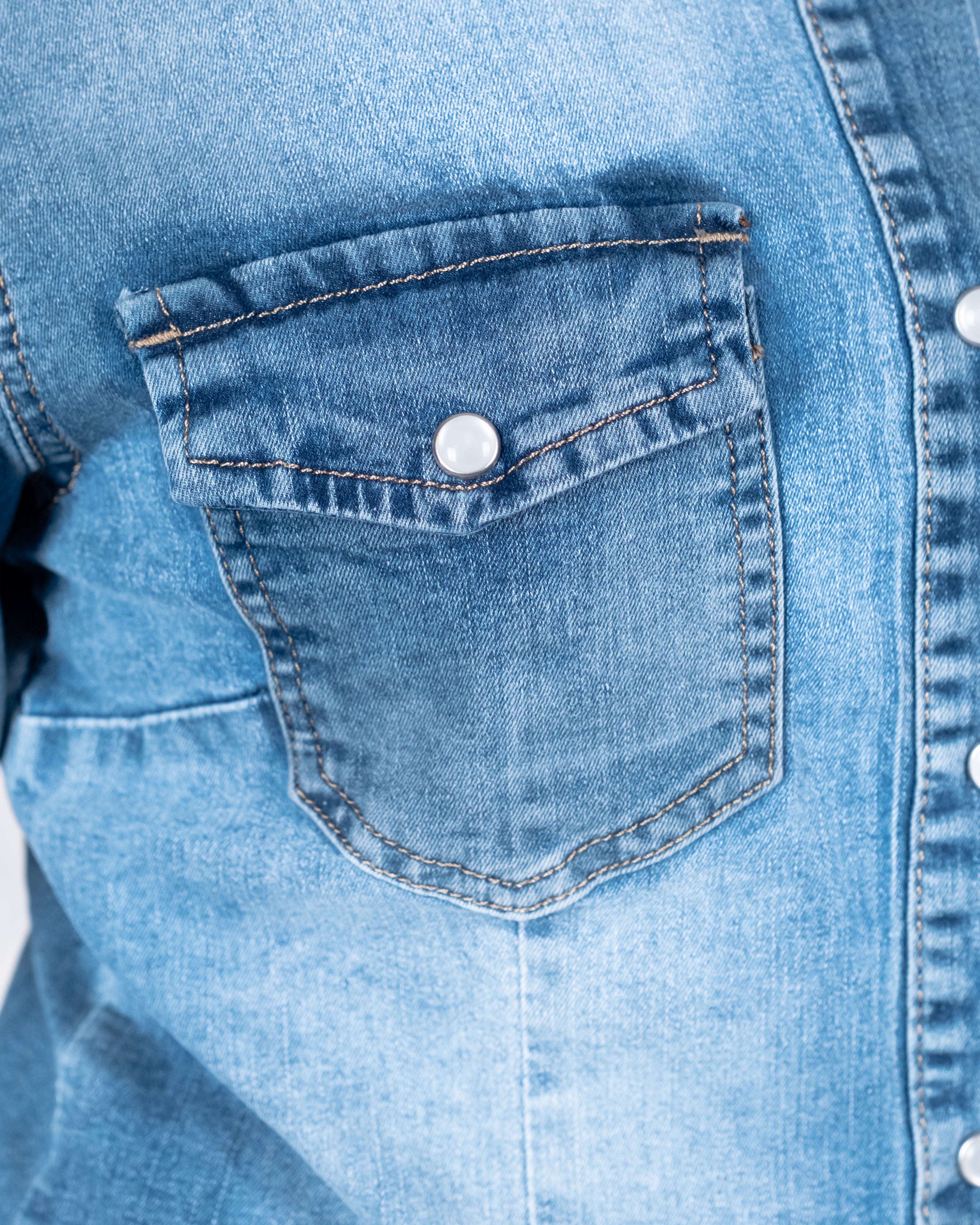 Camicia jeans elasticizzata con tasche e bottoni in madreperla.
