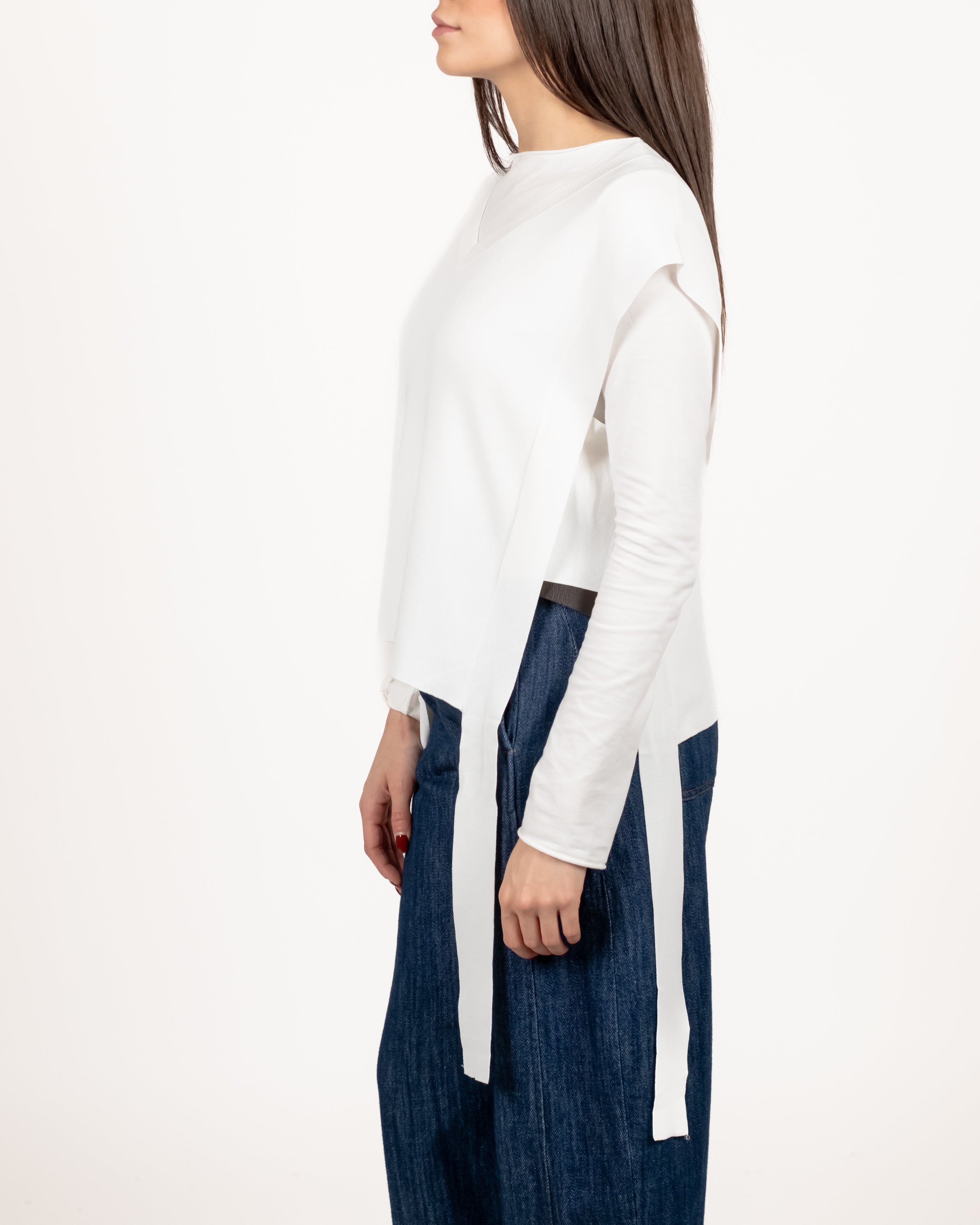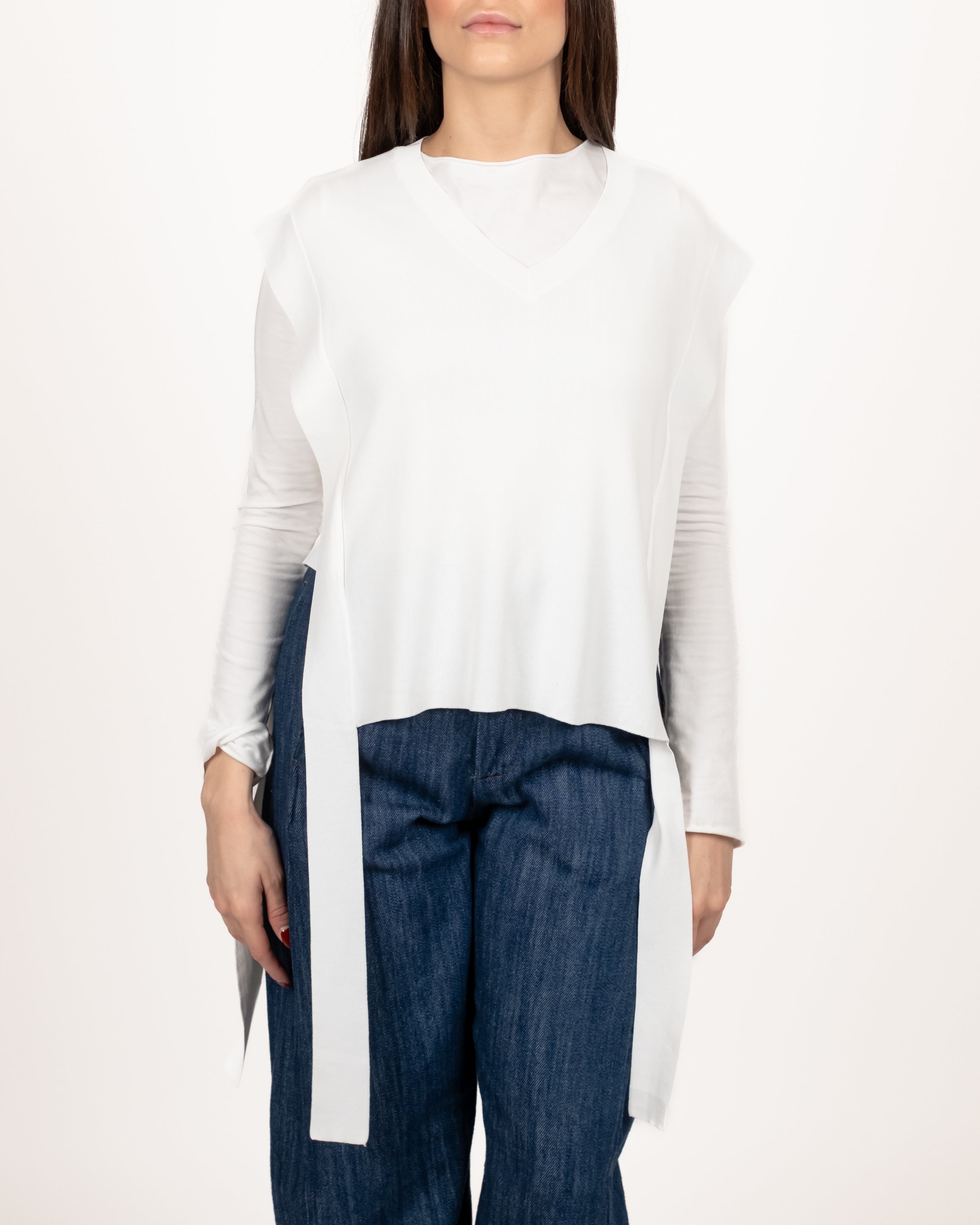 Gilet a V con lacci laterali.