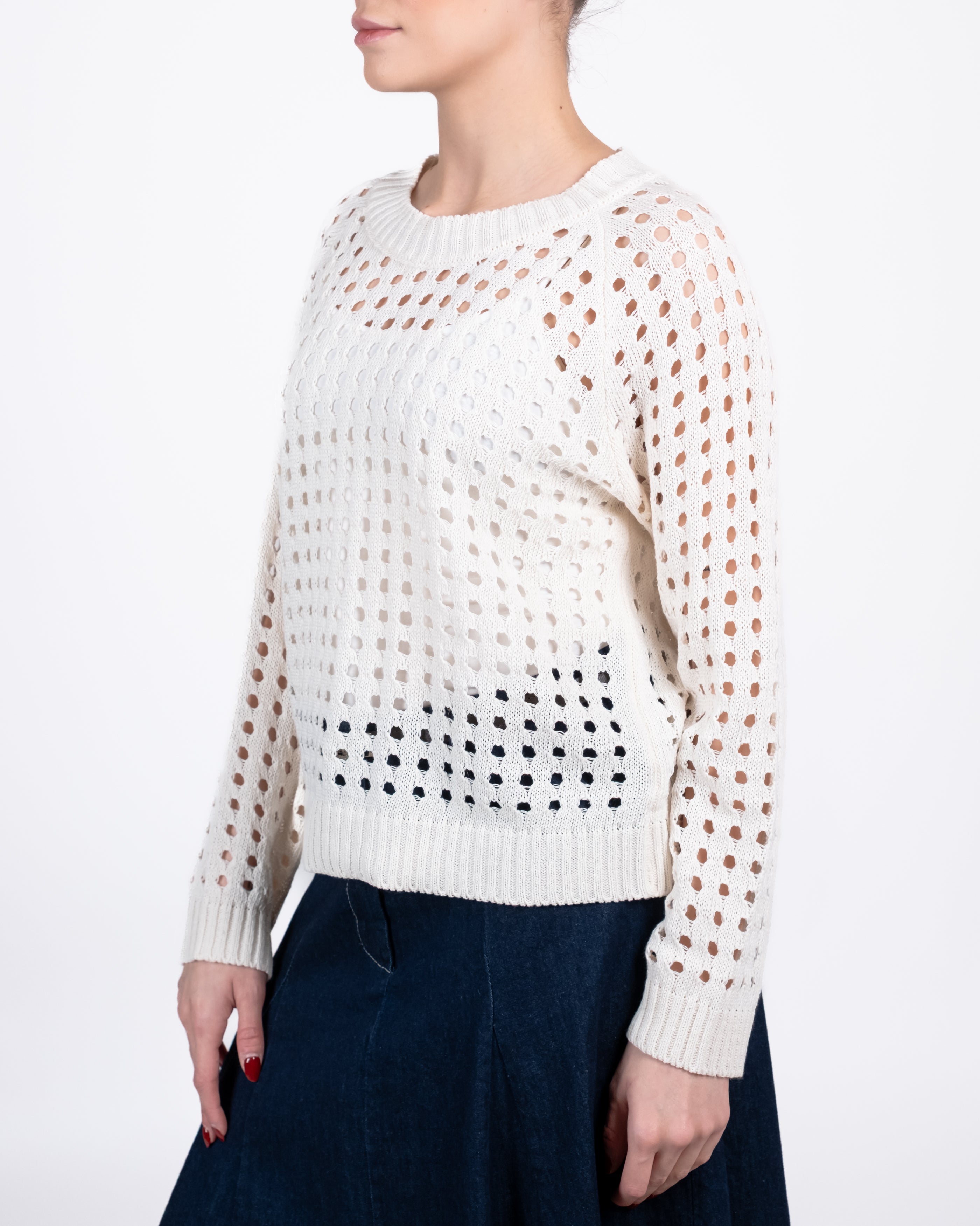 Maglia girocollo traforata con cannolè in vita e polsino.