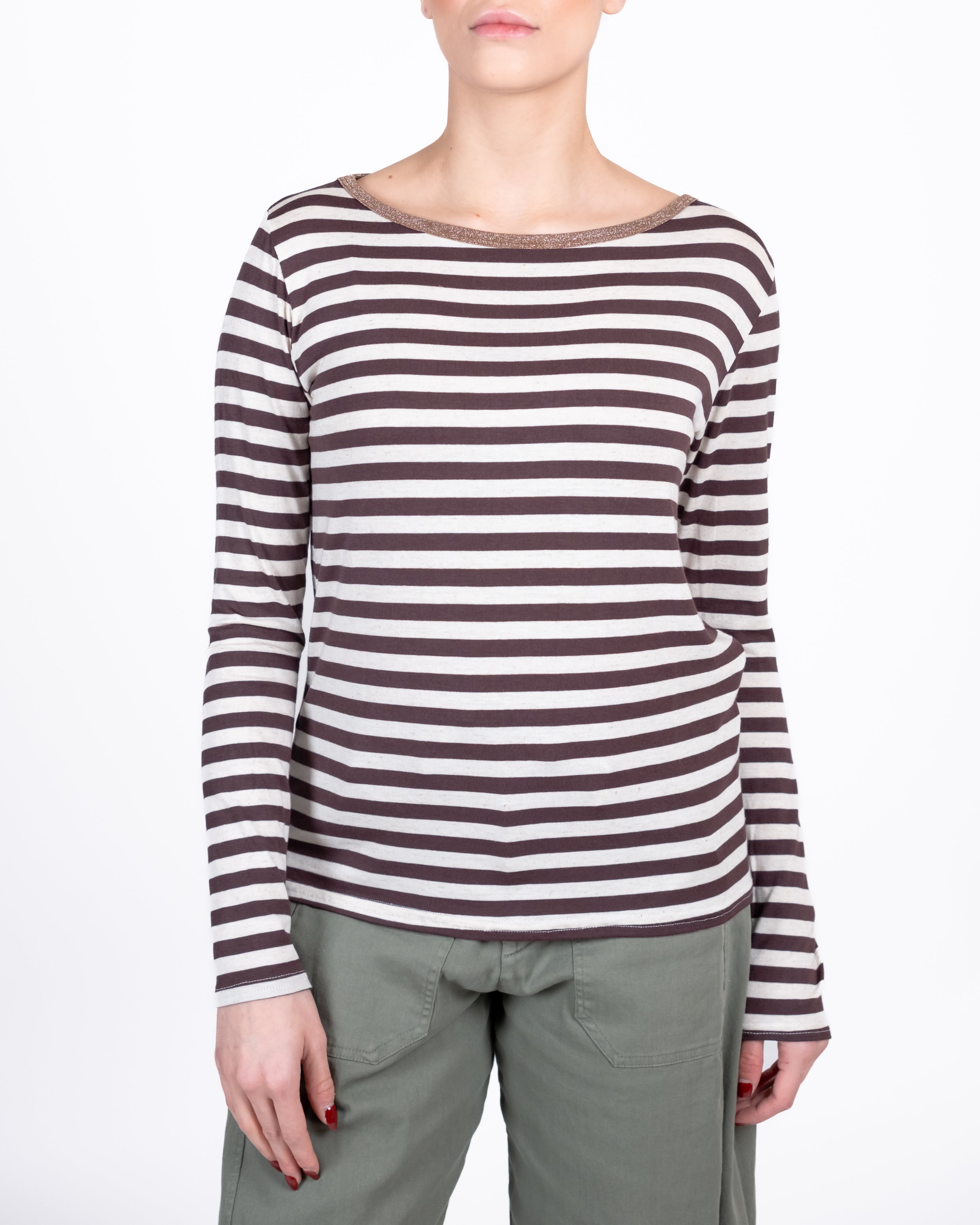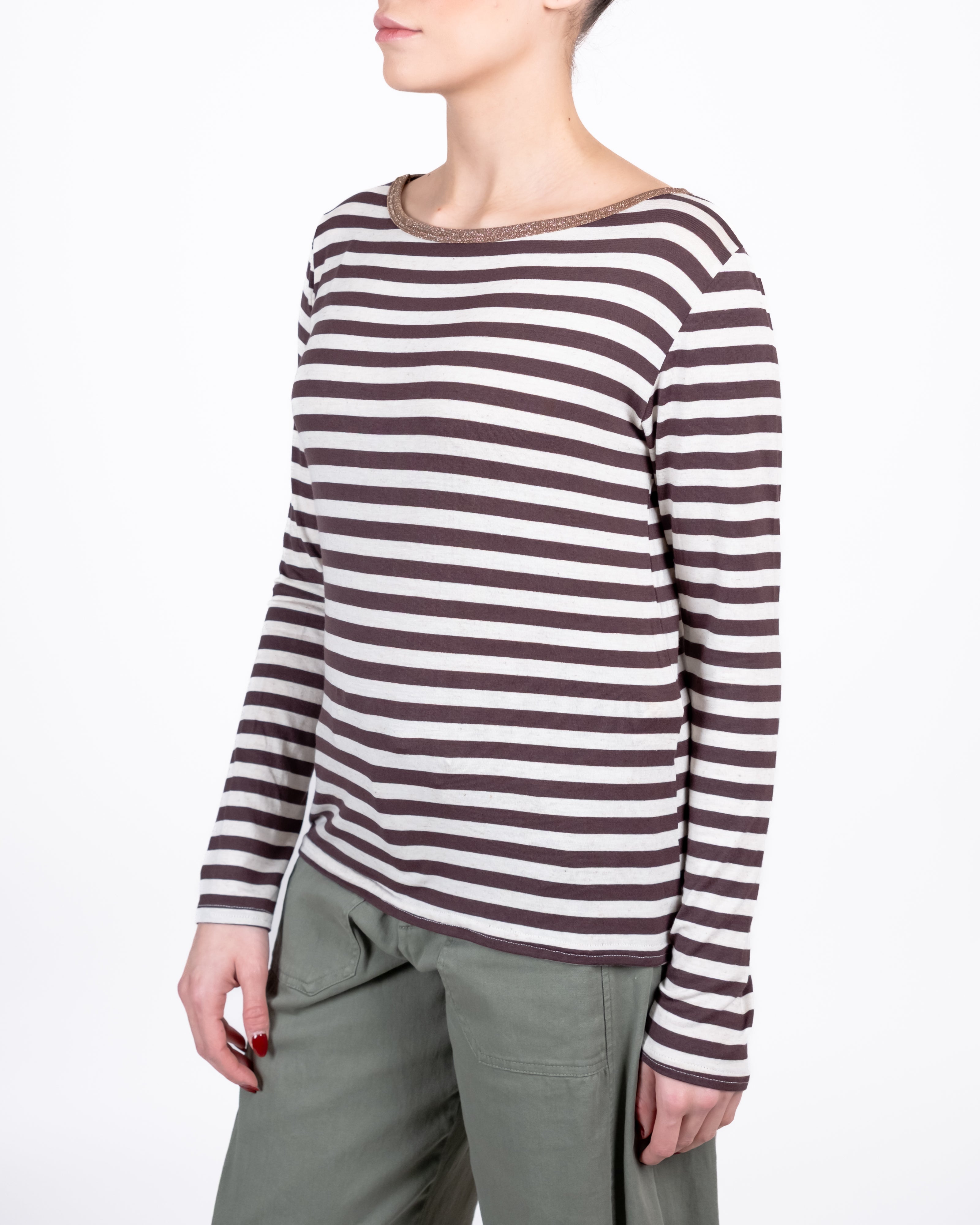Maglia misto lino a righe con collo in lurex.