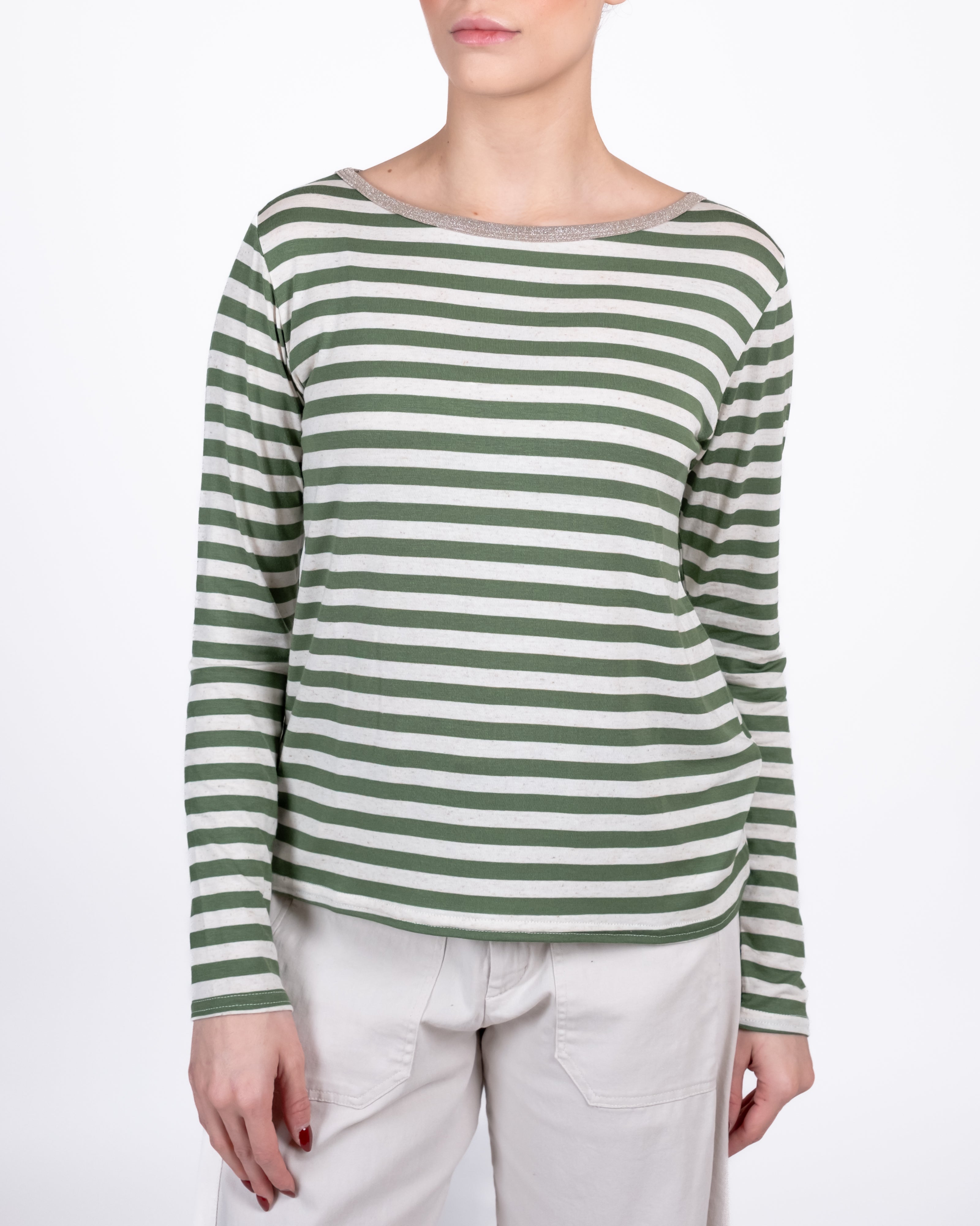 Maglia misto lino a righe con collo in lurex.