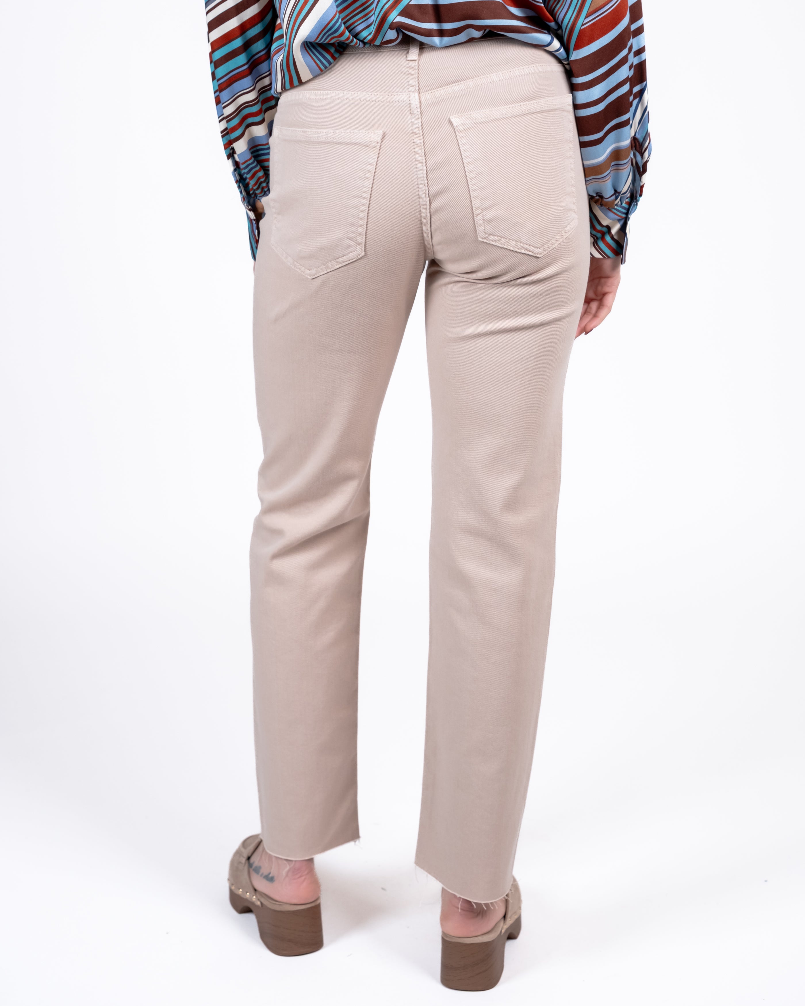 Pantalone 5 tasche elasticizzato con gamba dritta e orlo tagliato a vivo.