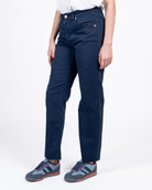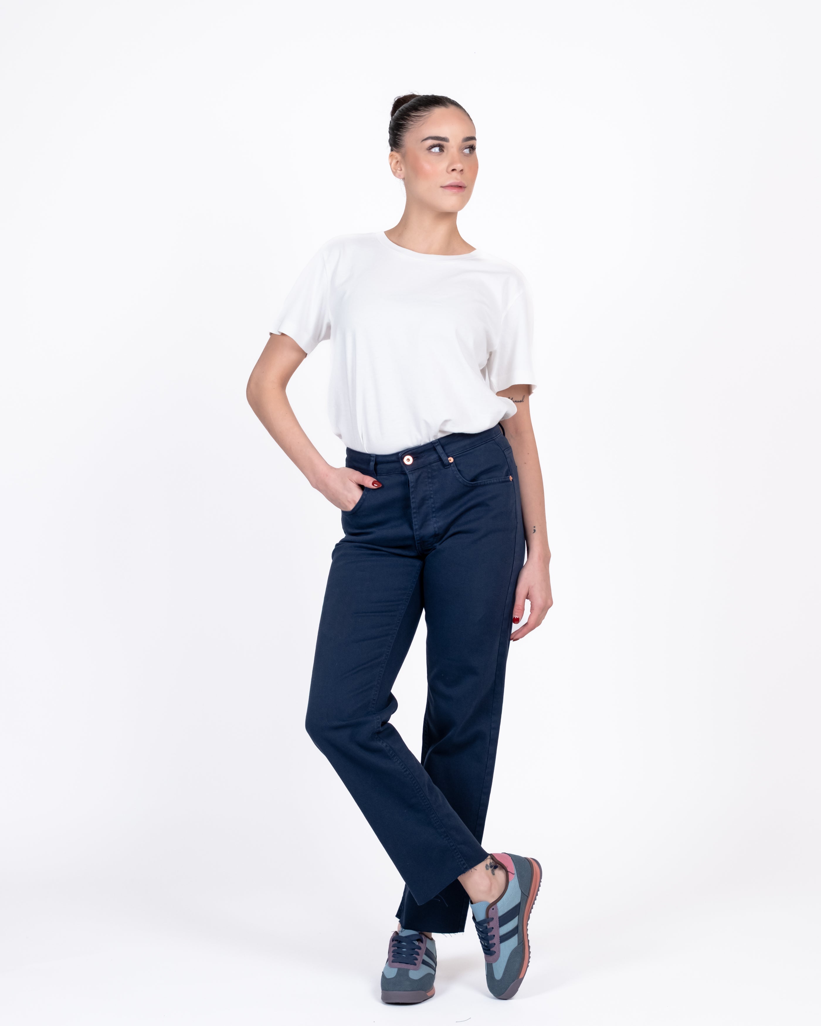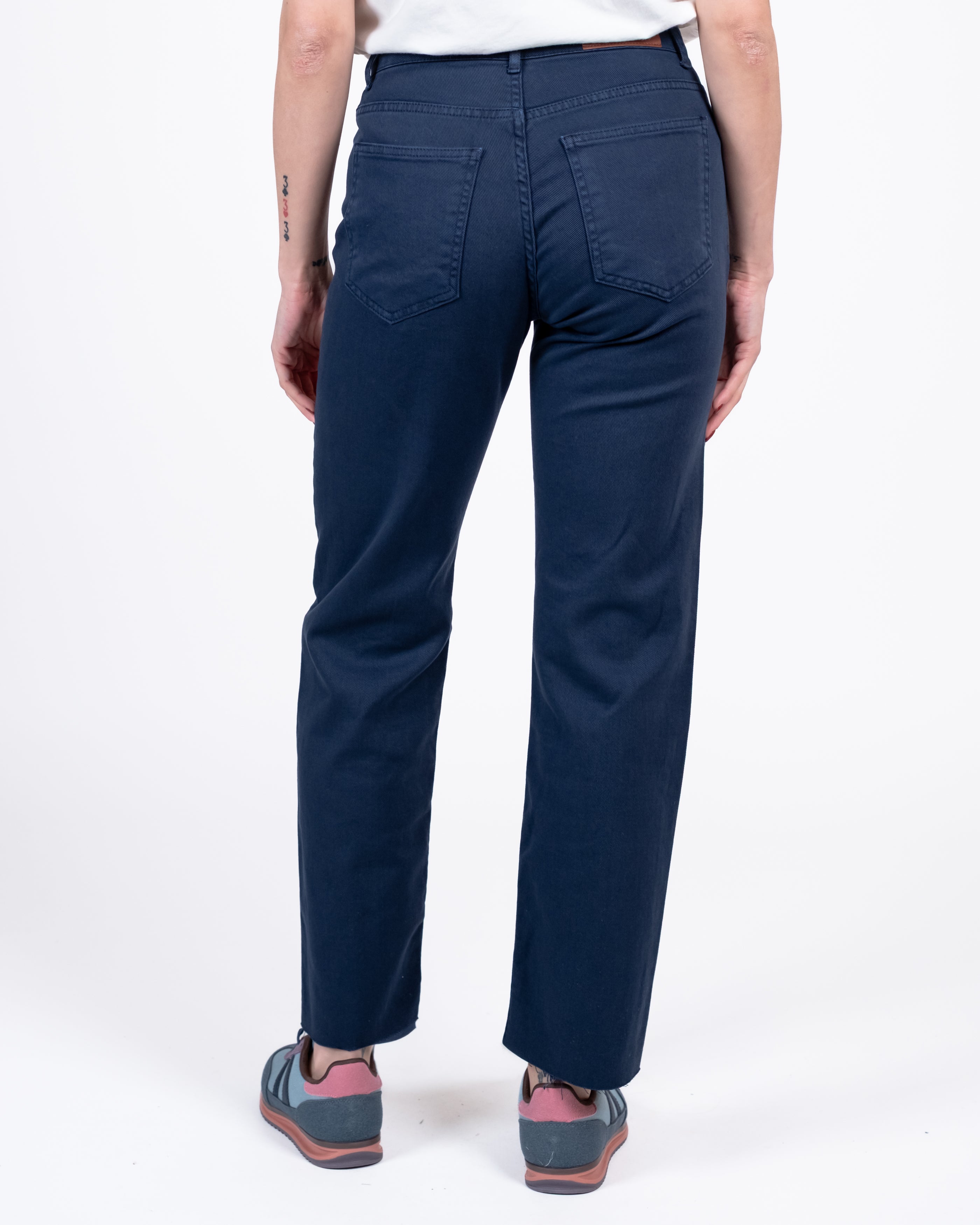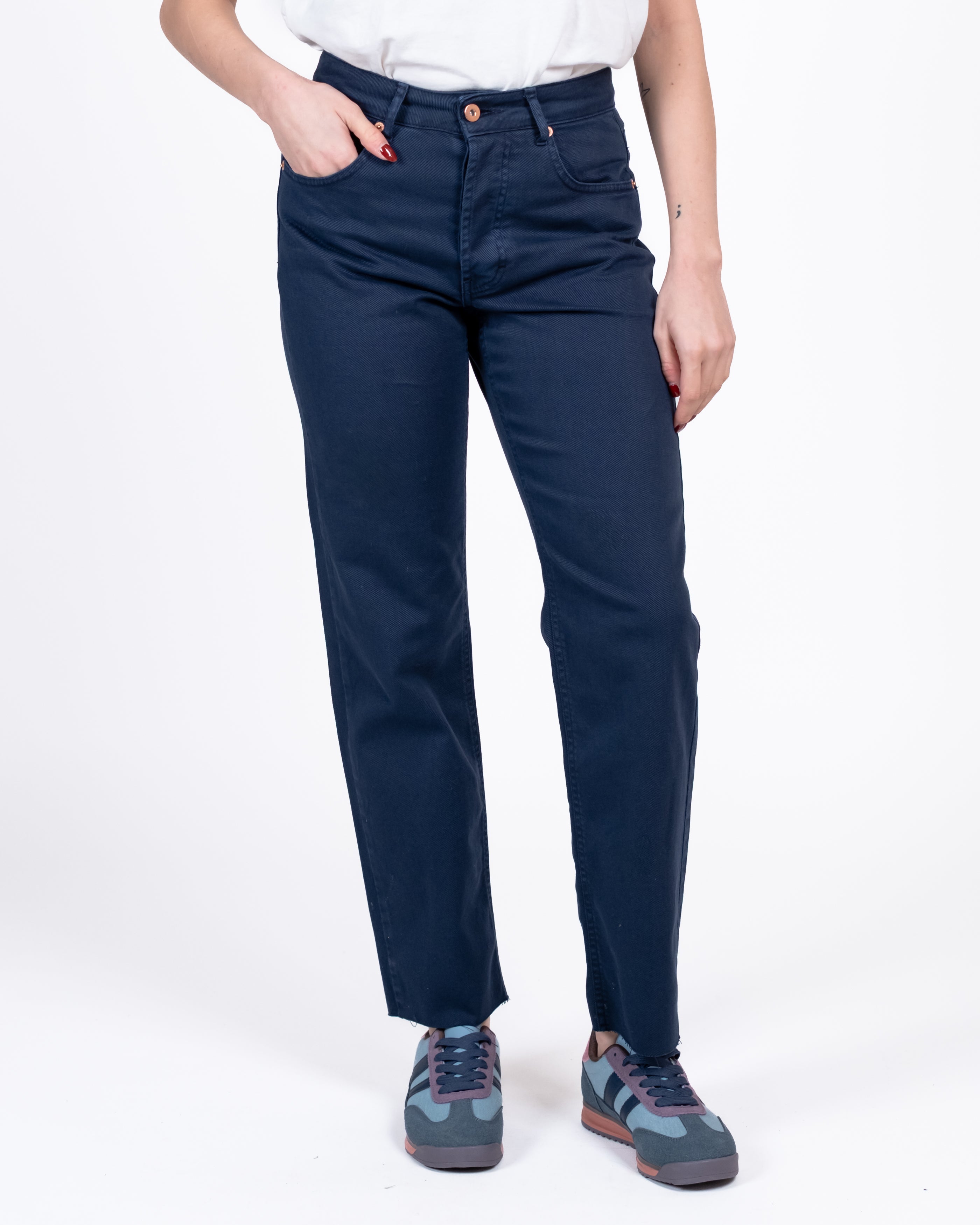 Pantalone 5 tasche elasticizzato con gamba dritta e orlo tagliato a vivo.