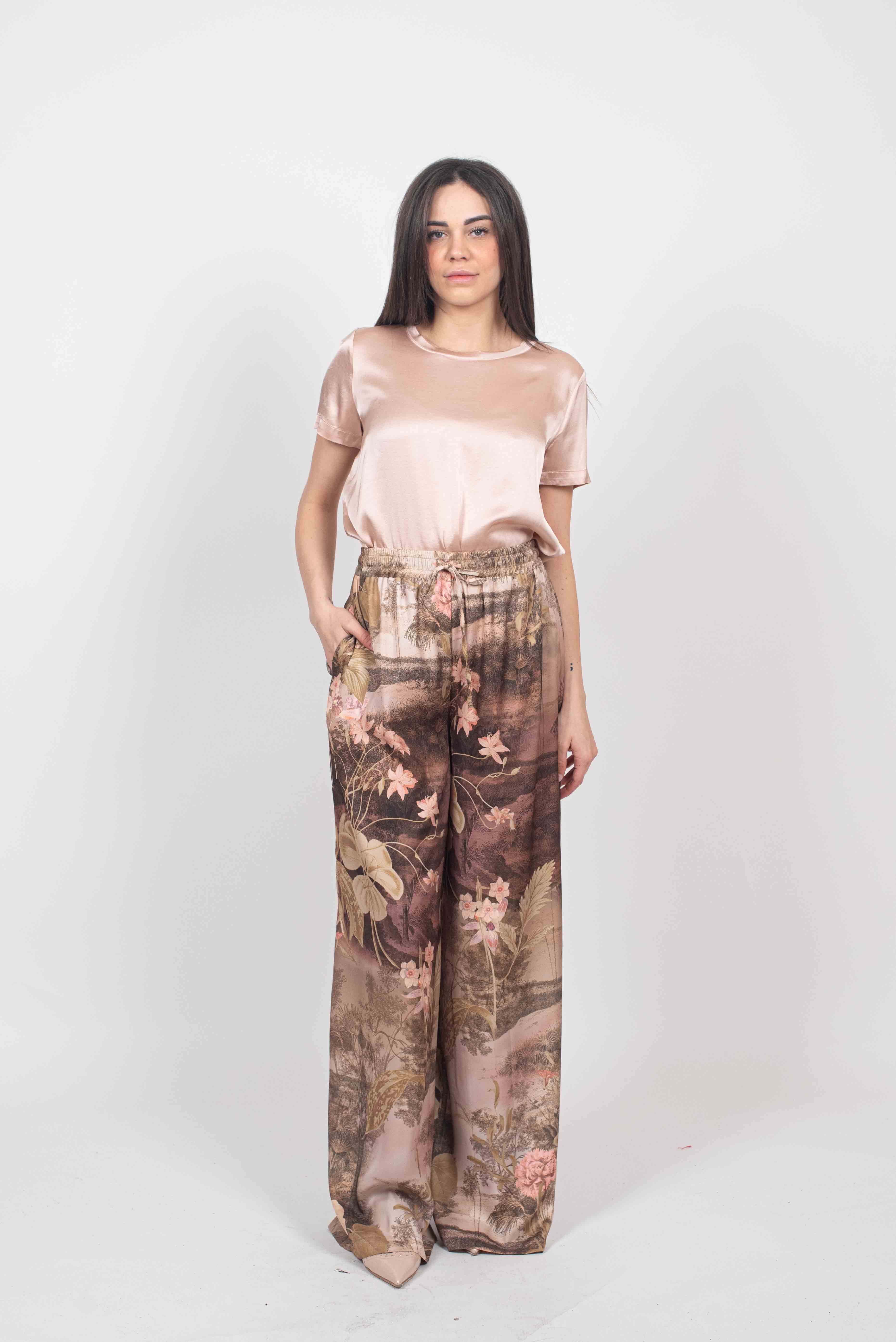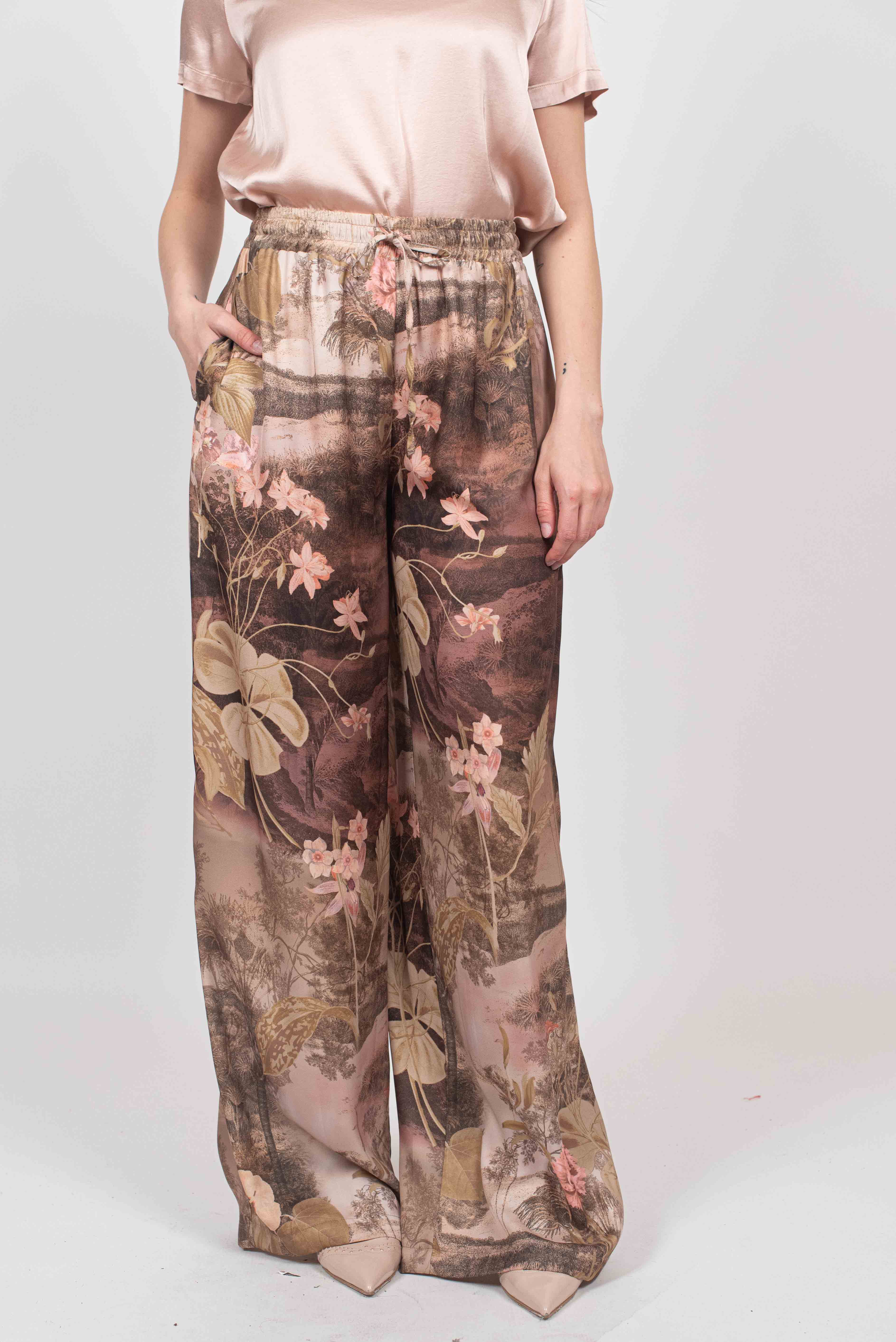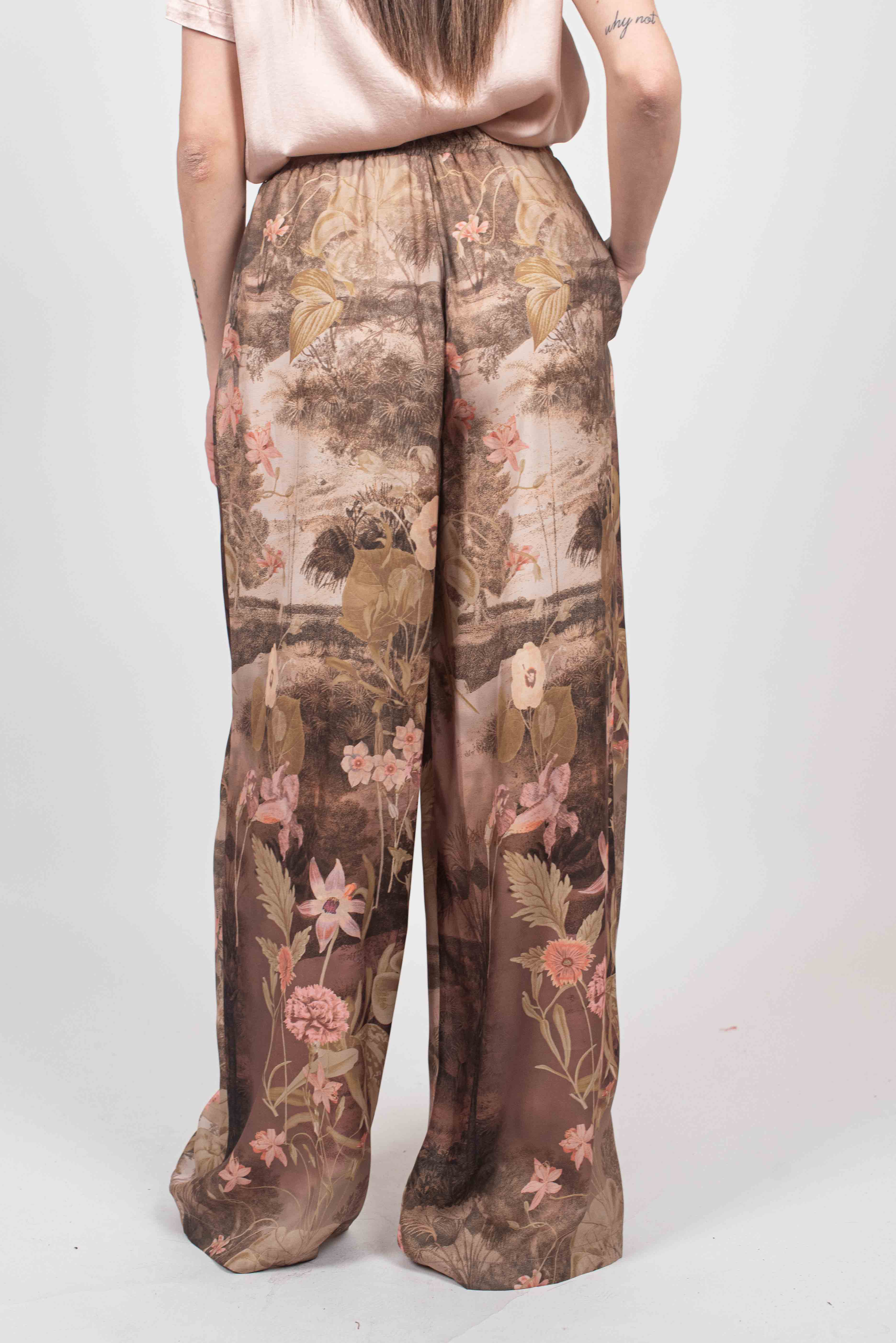 Pantalone palazzo fantasia floreale con coulisse in vita.