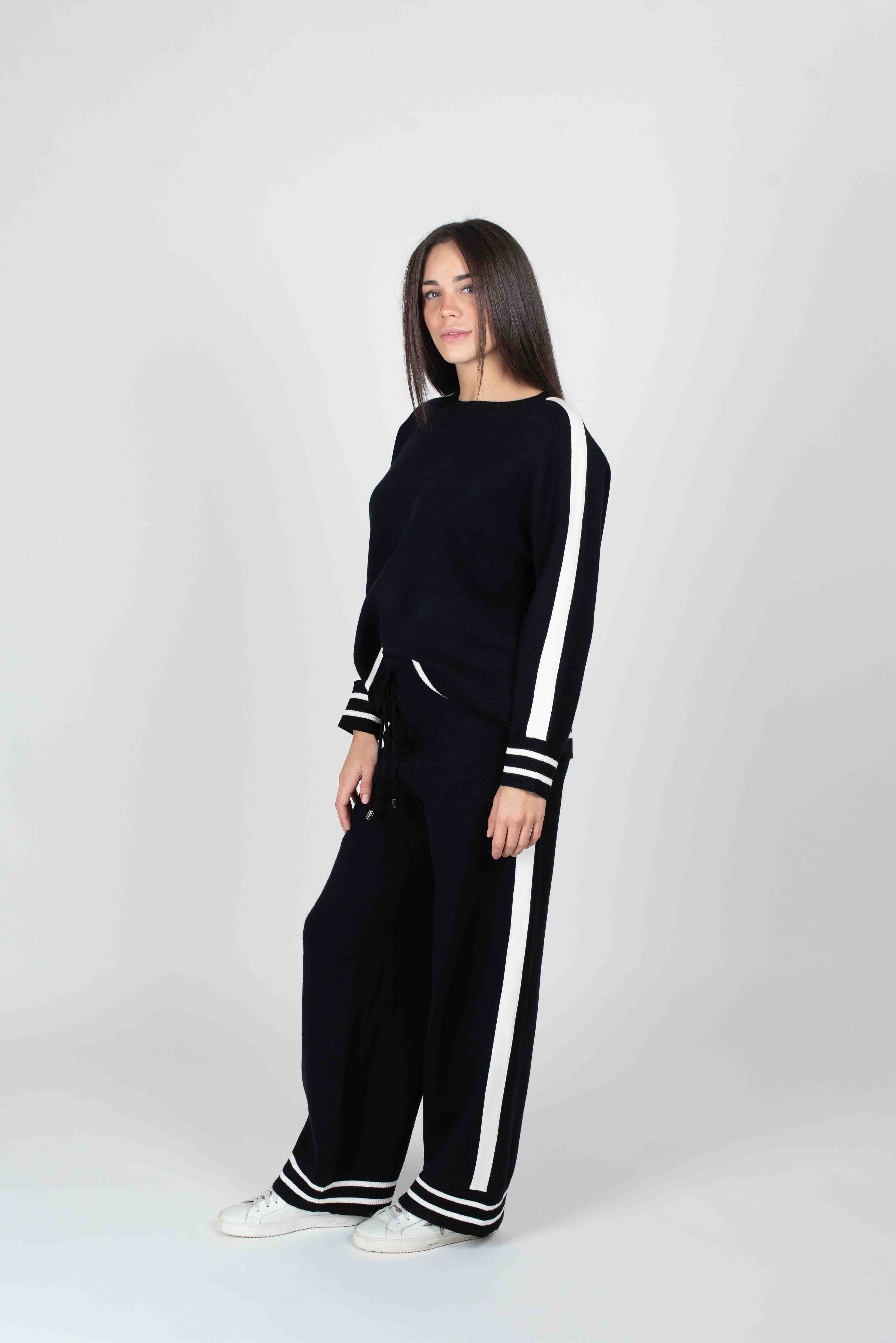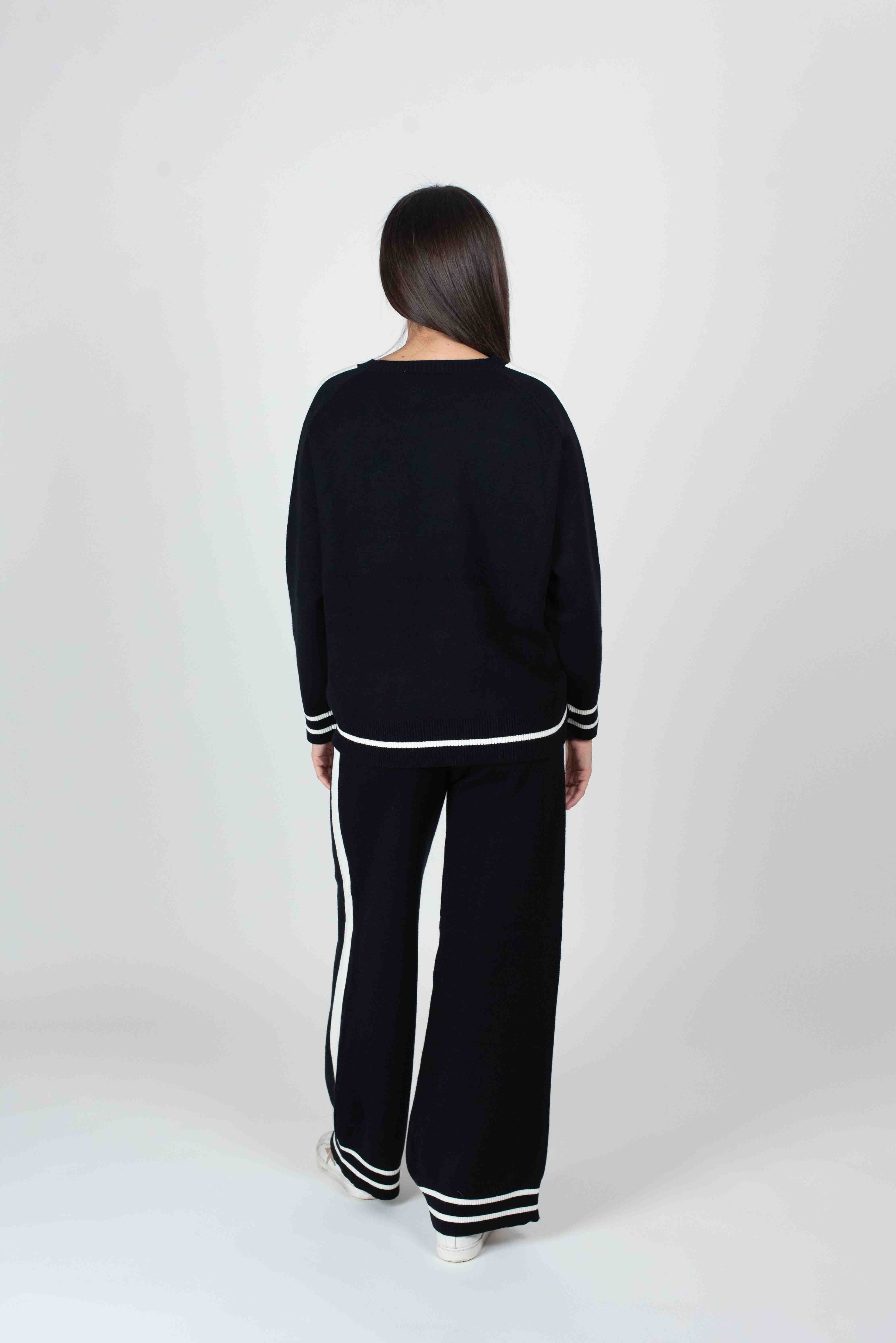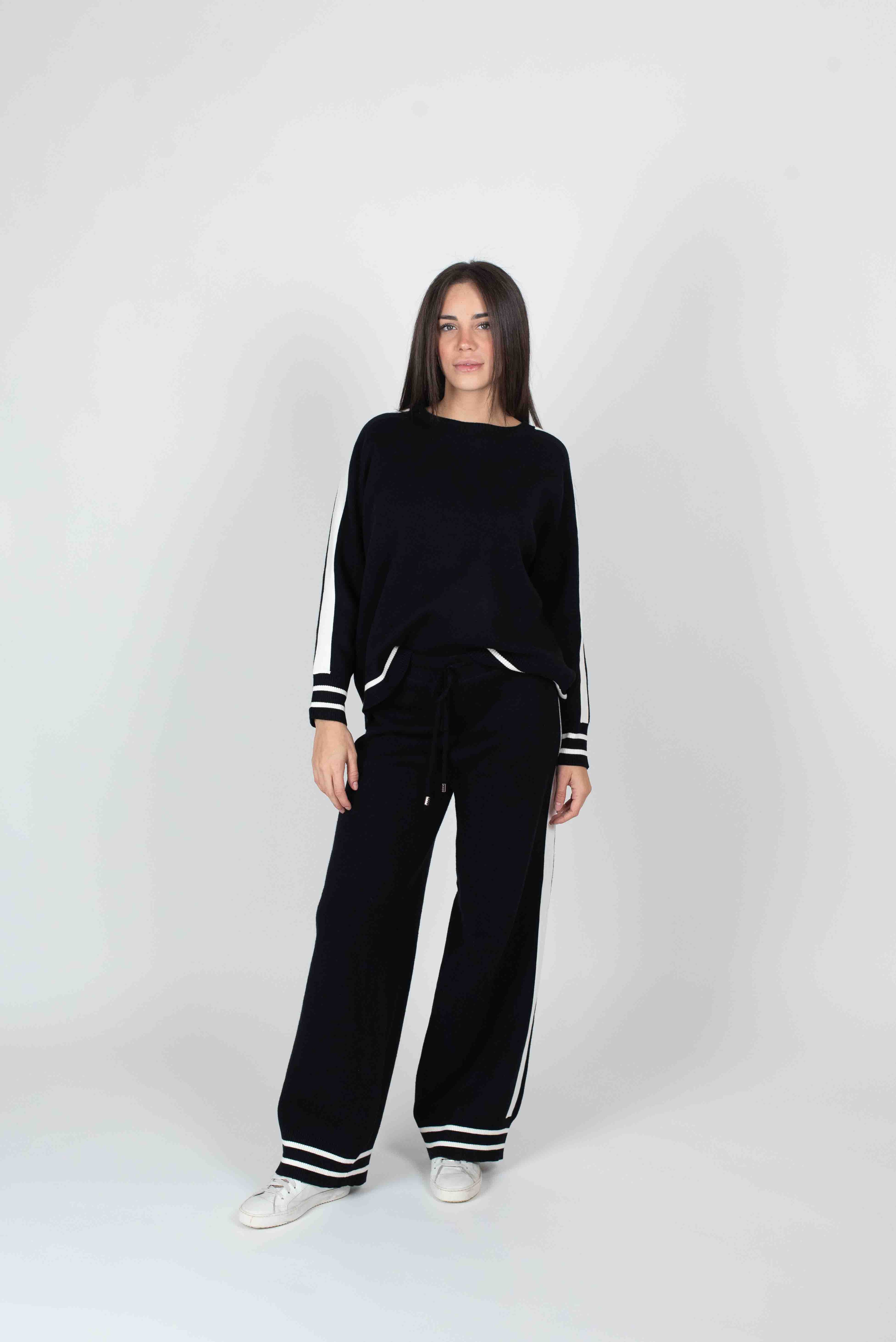Completo in maglia formato da due pezzi. maglia girocollo manica lunga pantalone palazzo con elastico e coulisse in vita entrambi con dettagli di colore in contrasto.