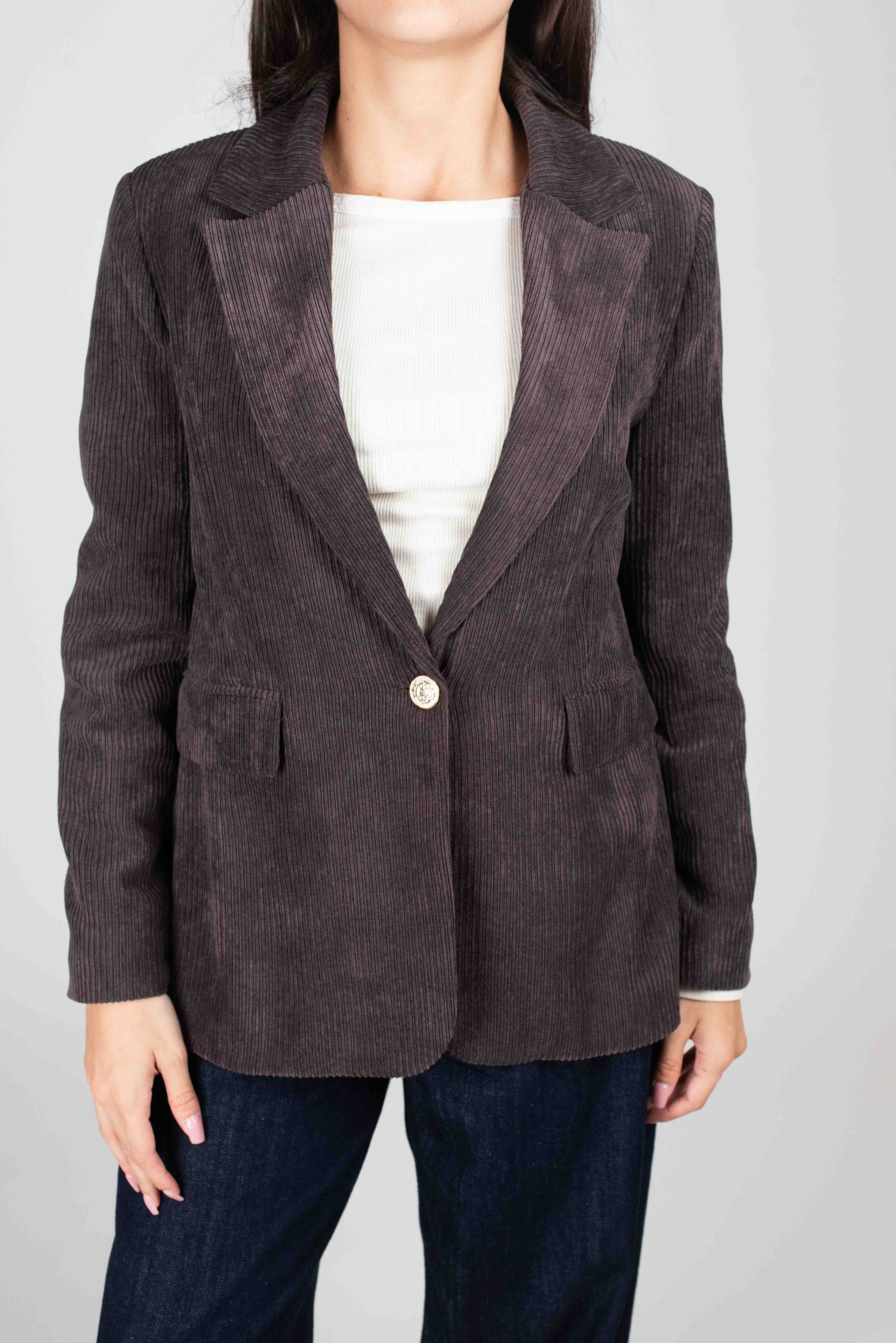 Giacca monopetto in velluto rocciatore con bottone e tasca.
