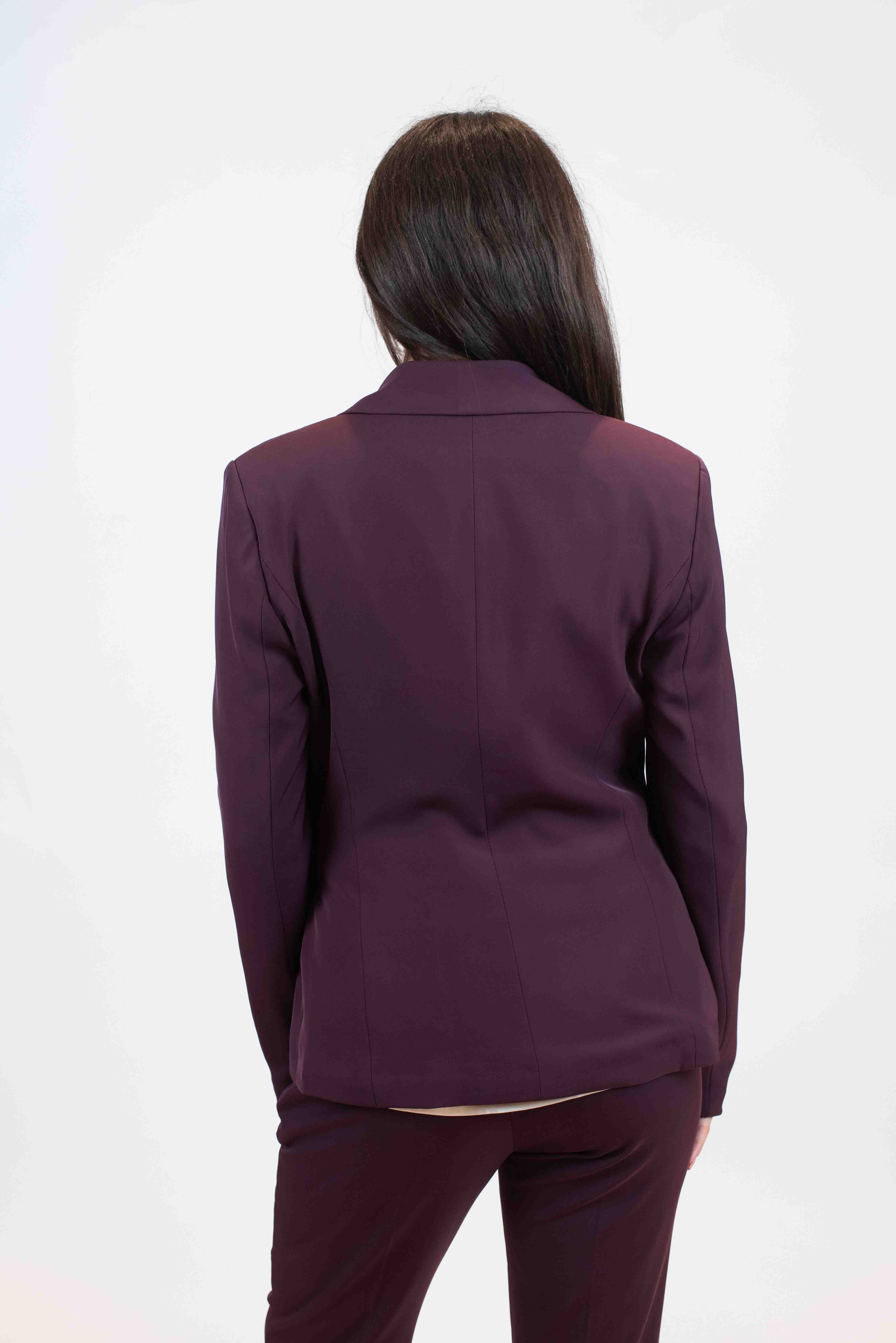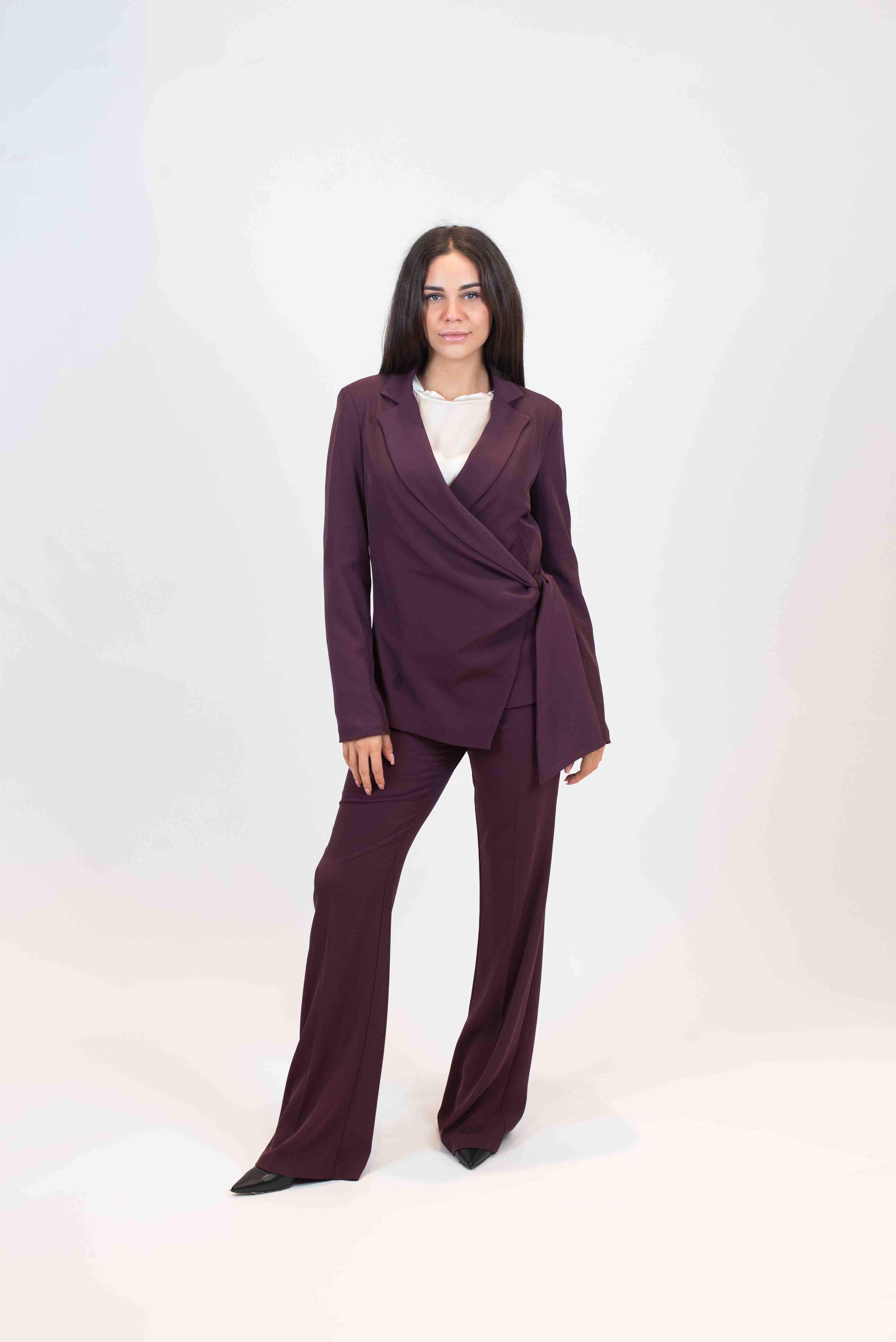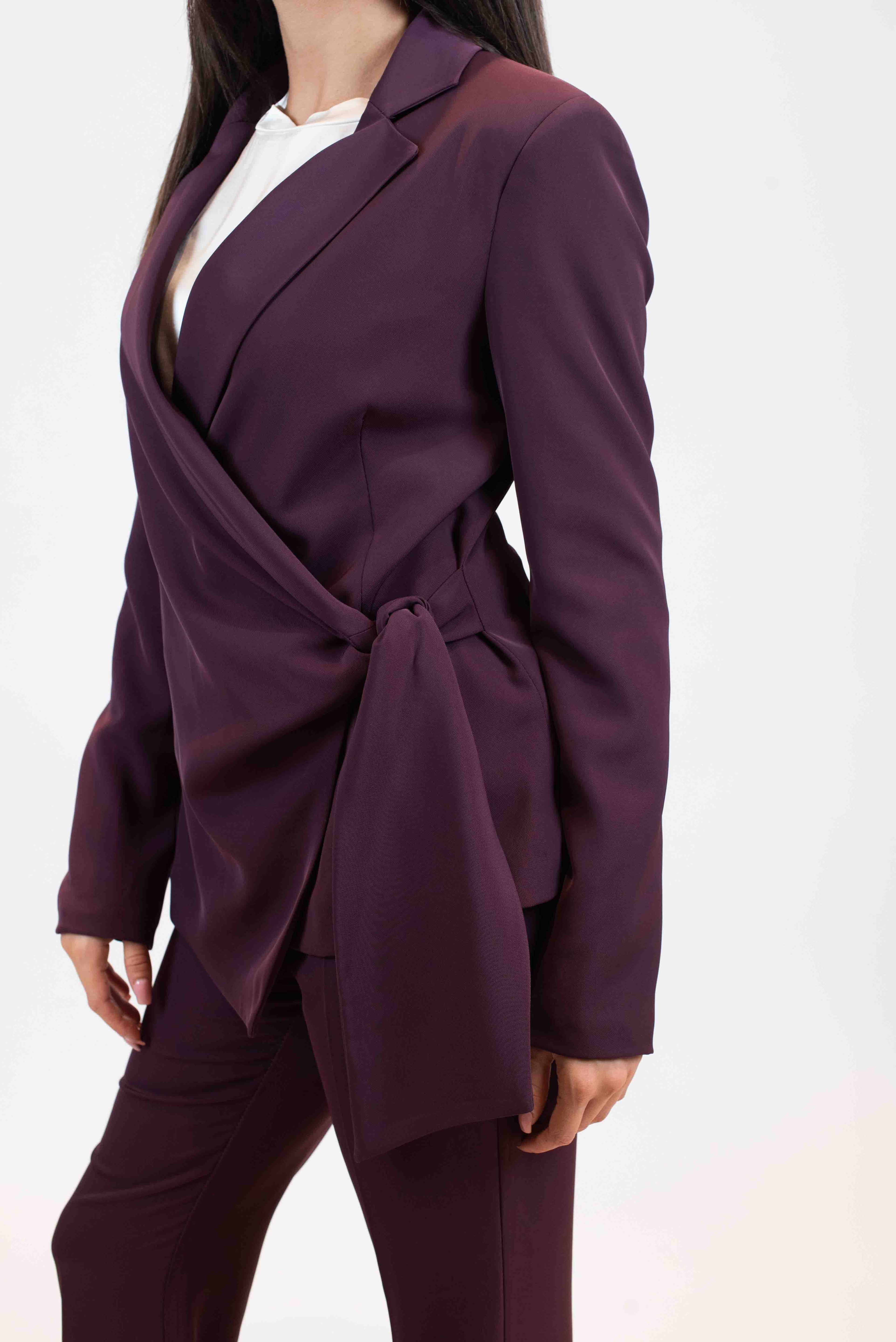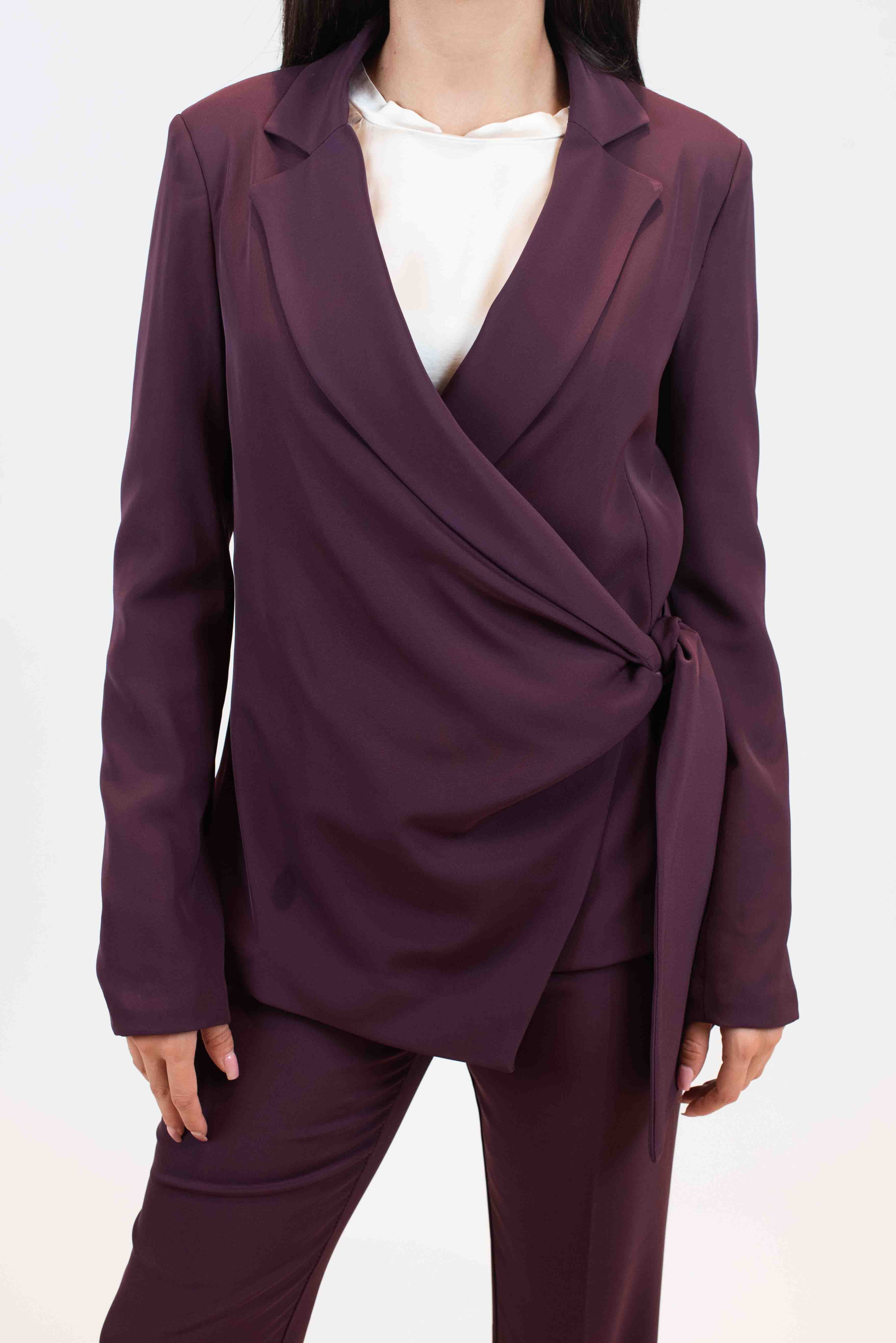Giacca monopetto tessuto fluido con fiocco laterale.