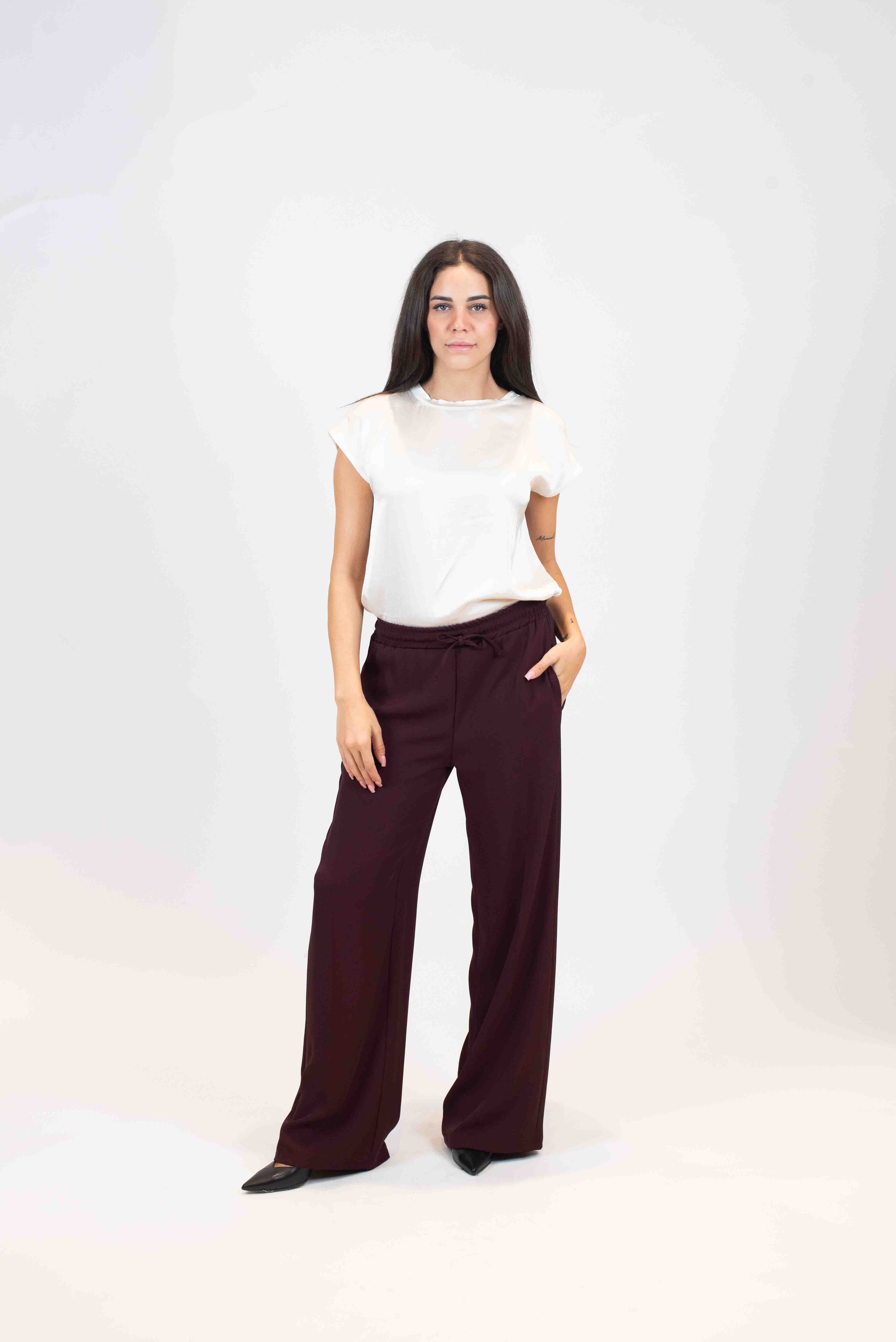 Pantalone palazzo in tessuto fluido con elastico in vita coulisse e tasche a filo.