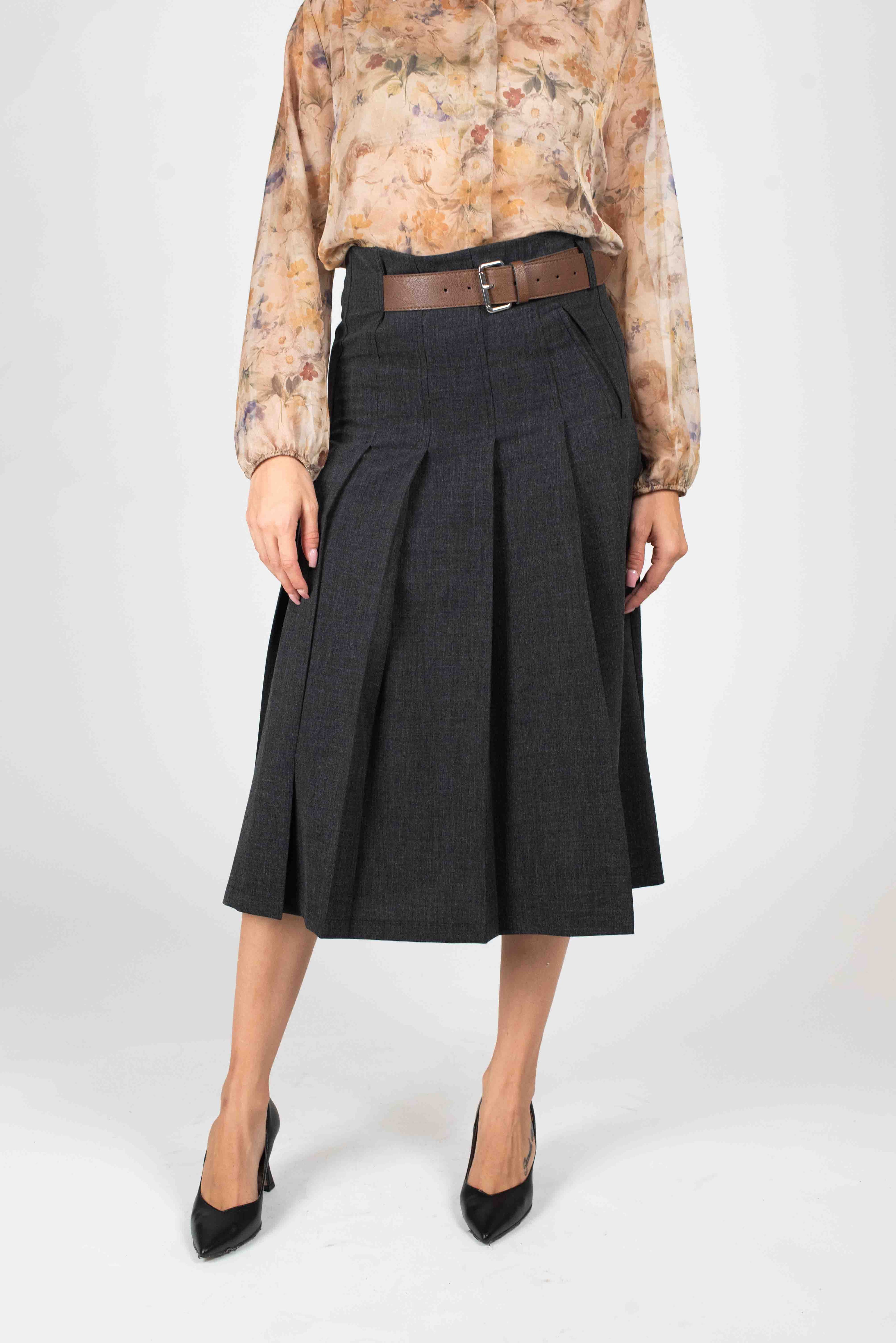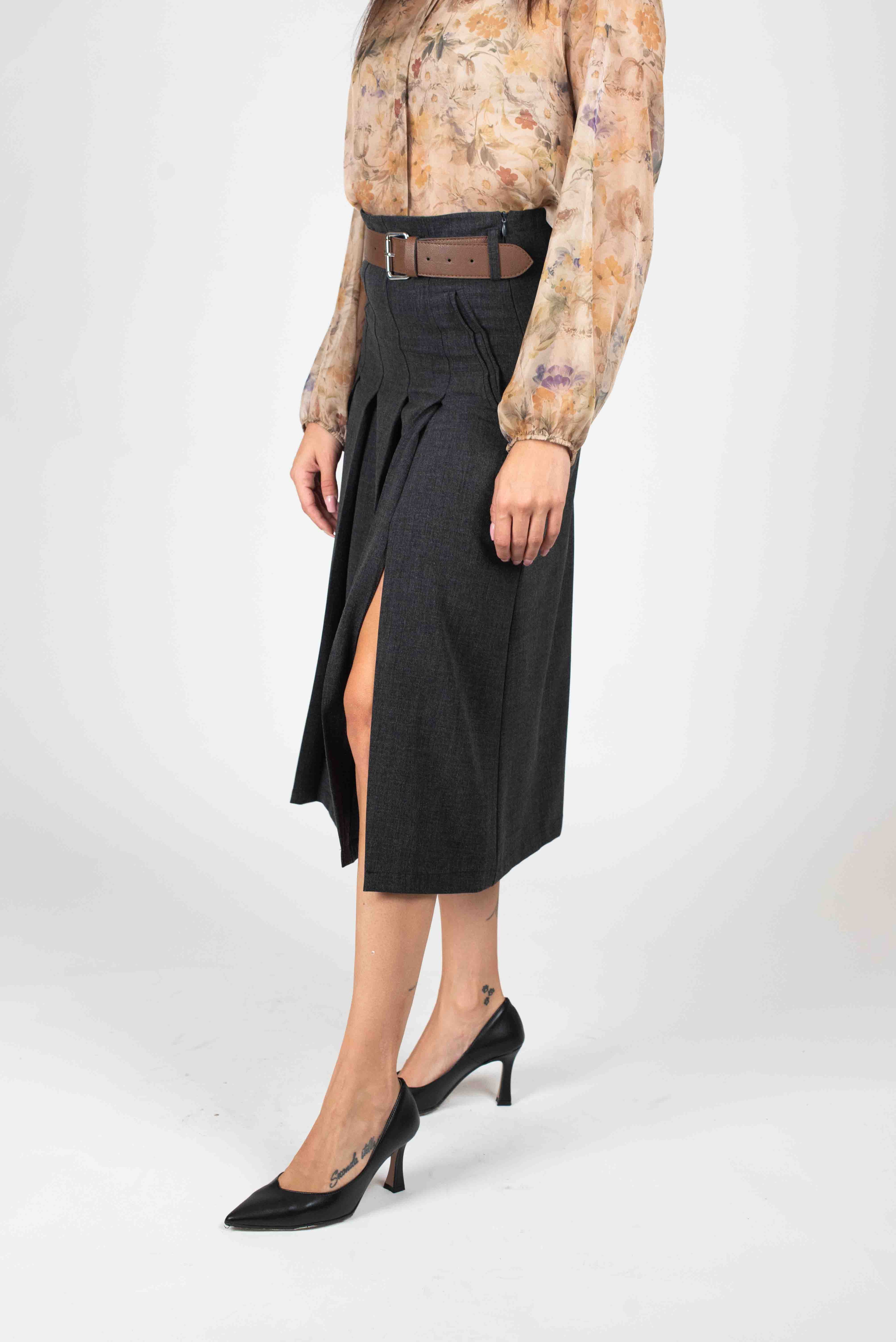 Gonna a pieghe con cinta in vita e spacco laterale.