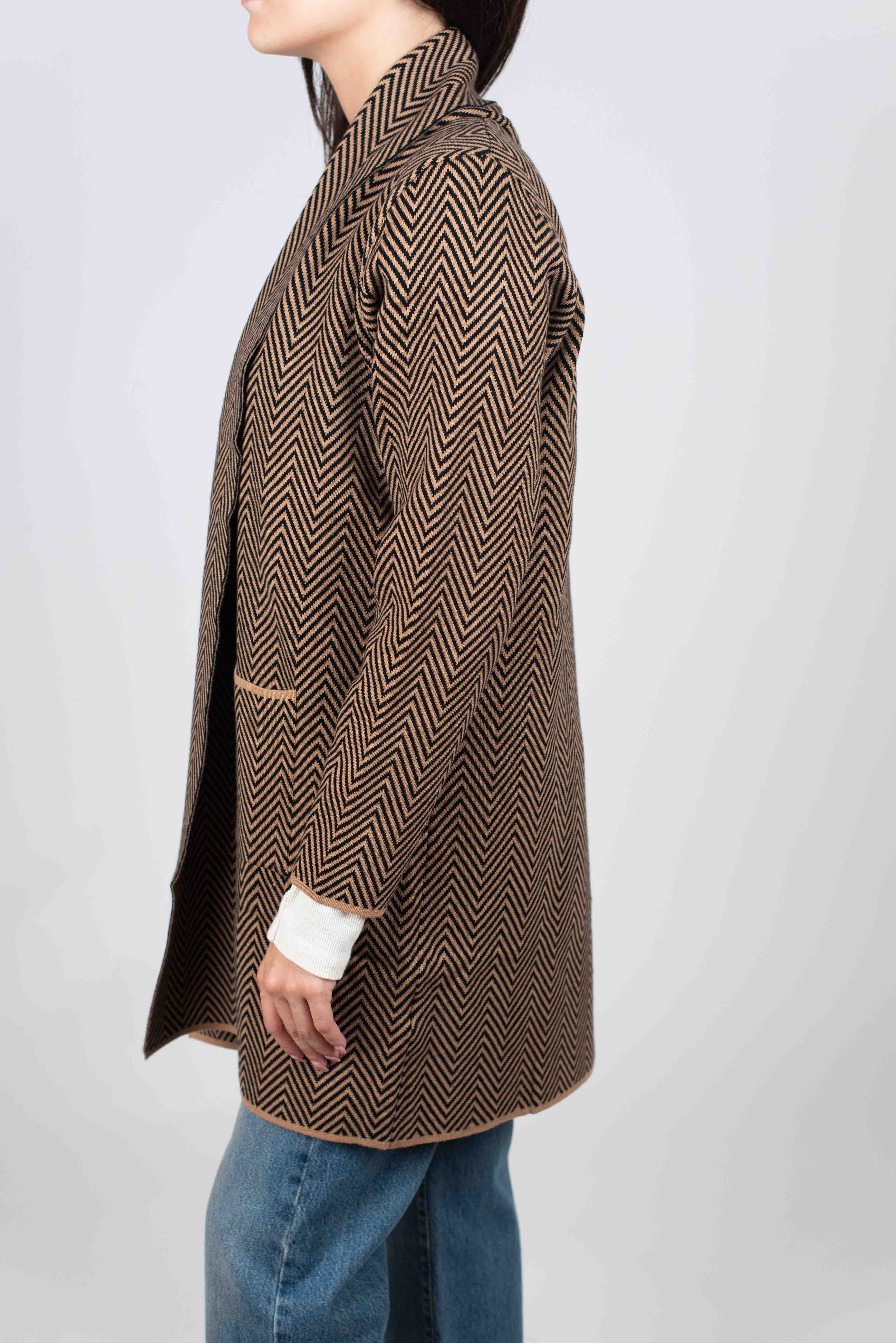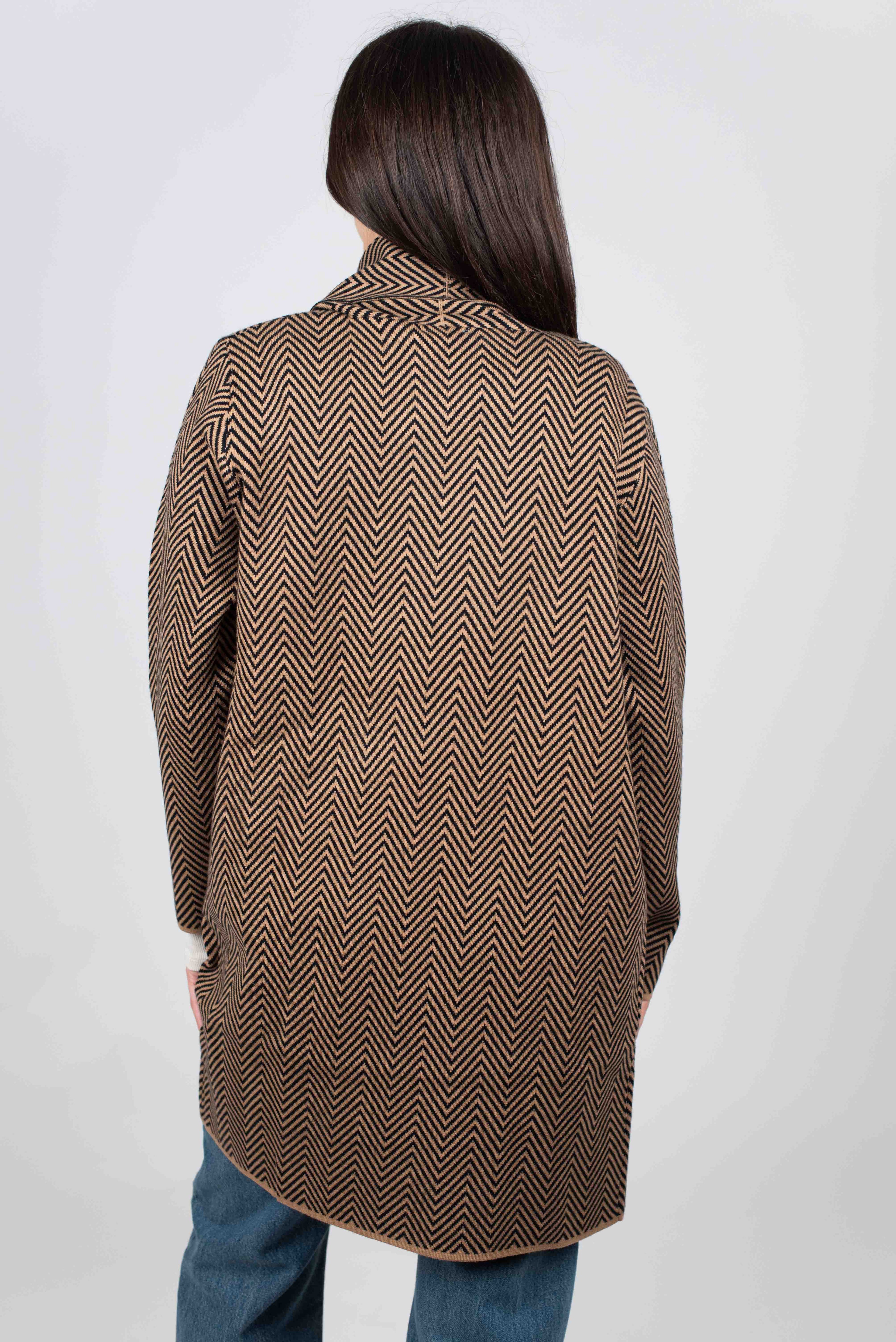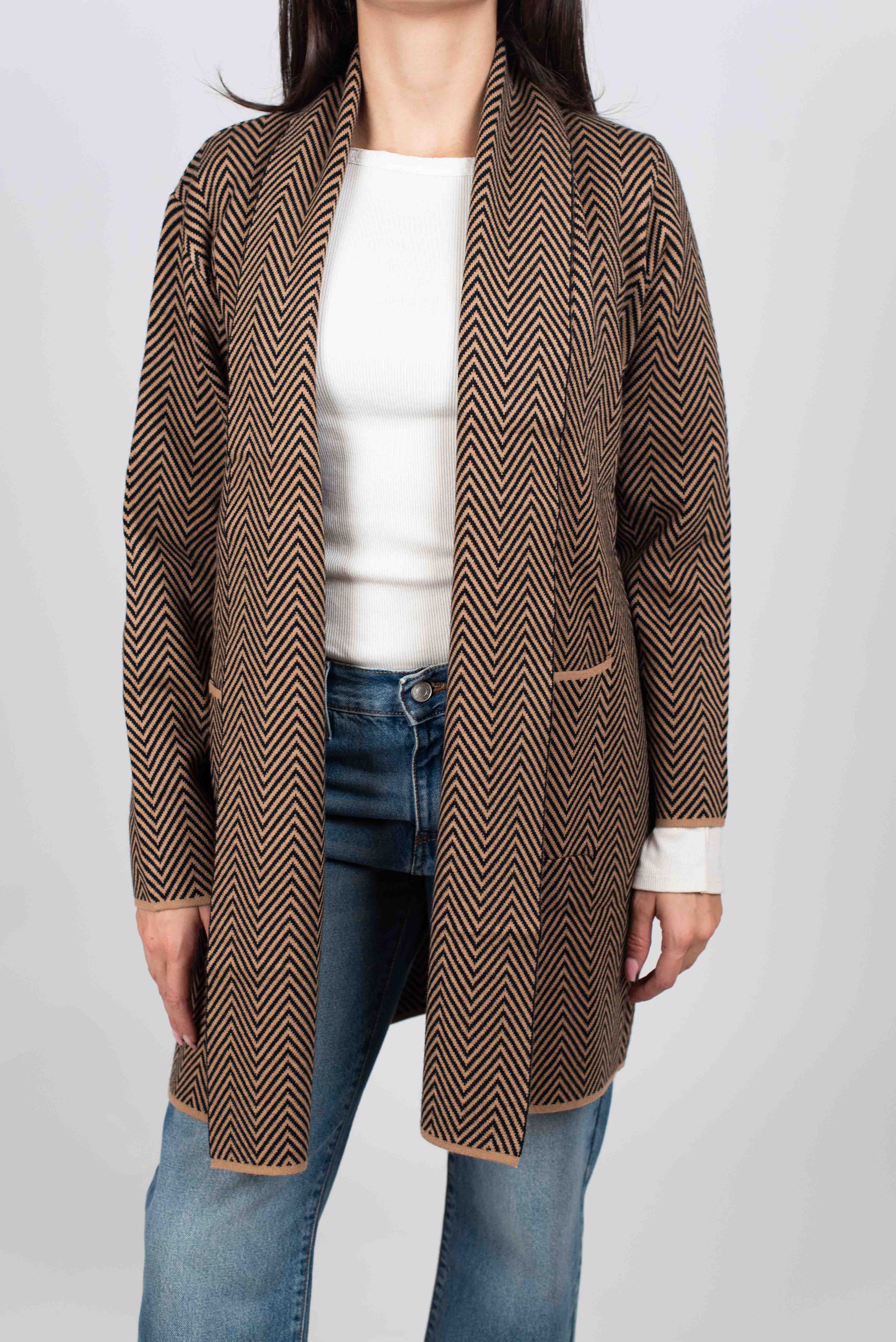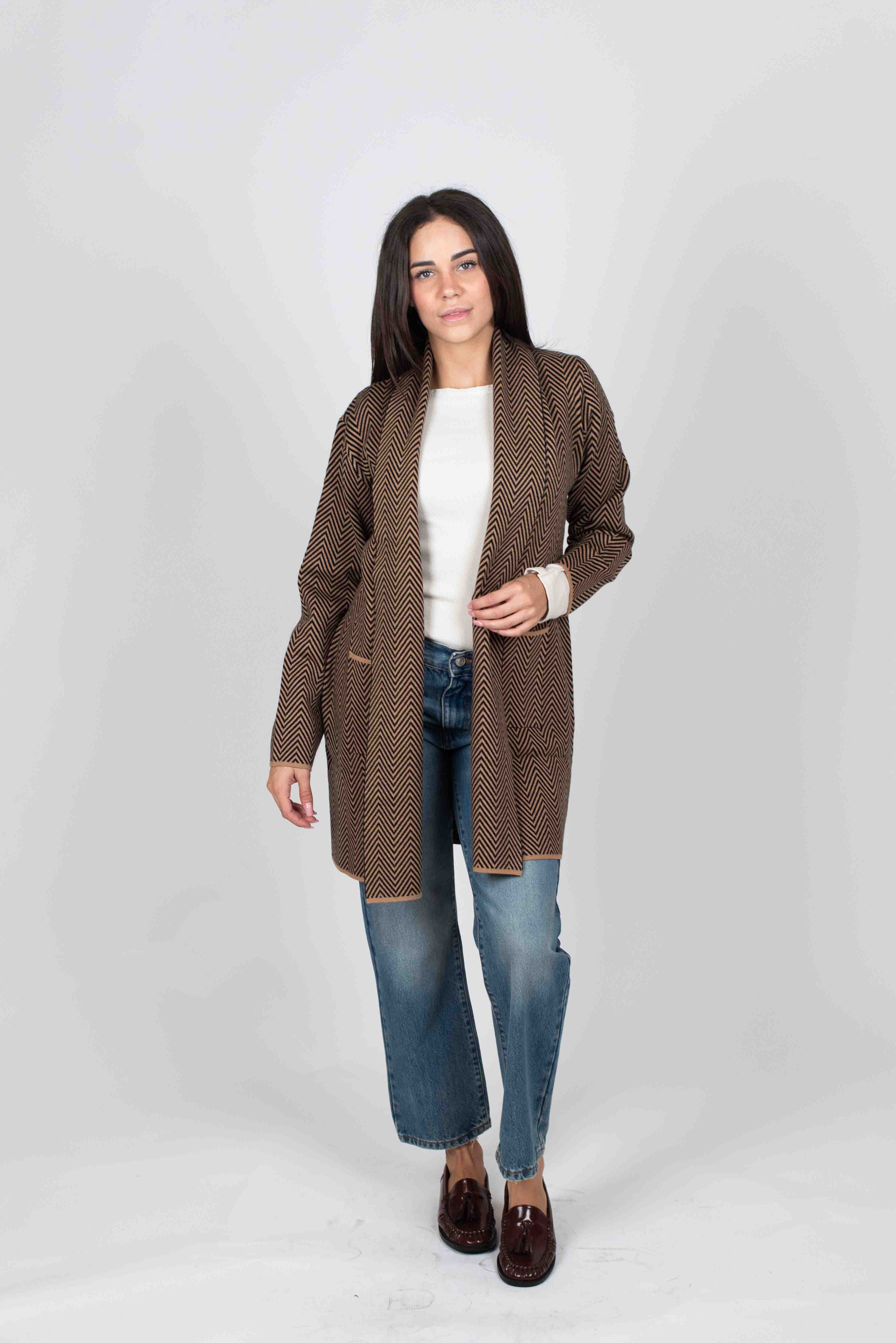 Cardigan lungo fantasia spiga con tasche frontali.