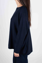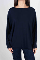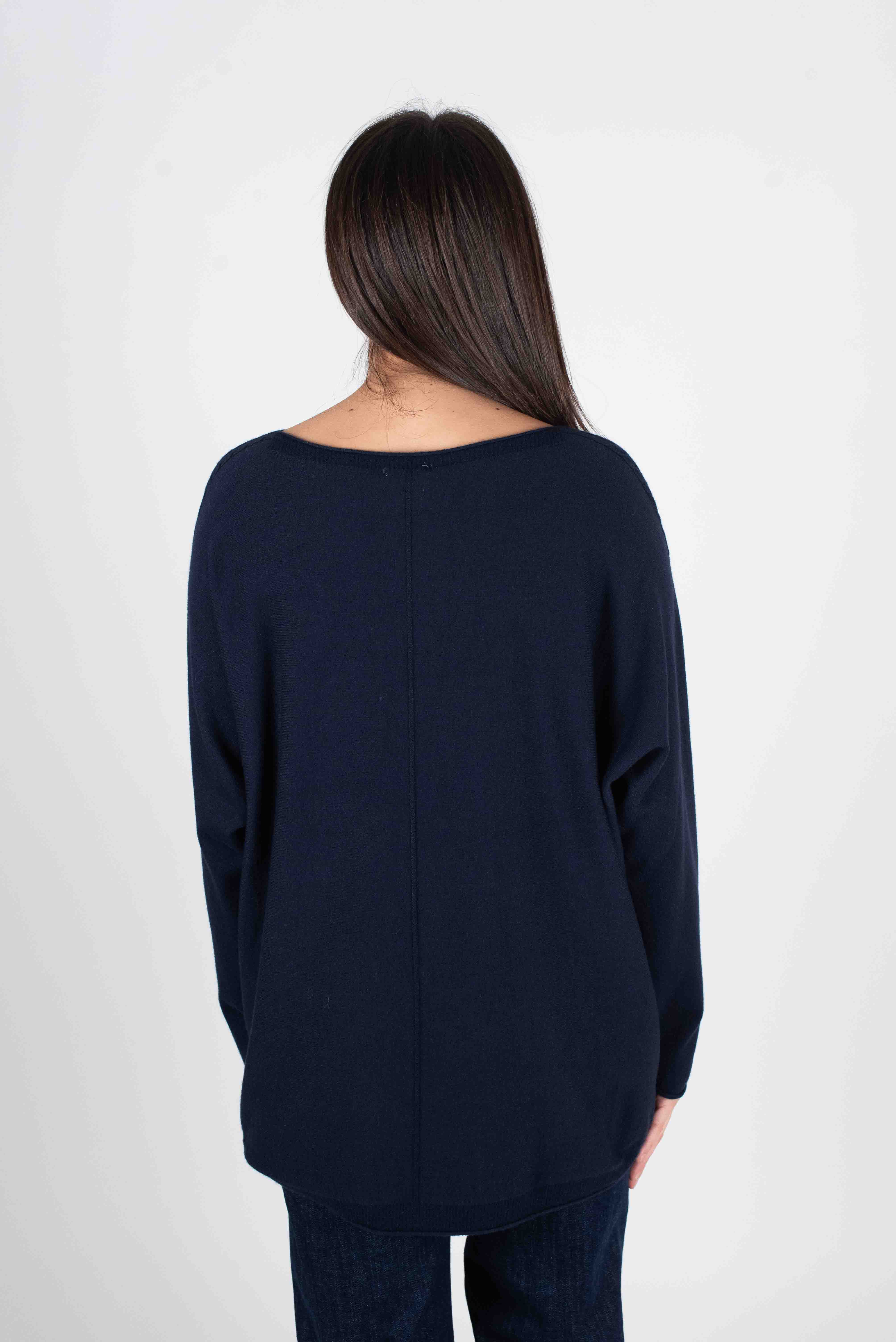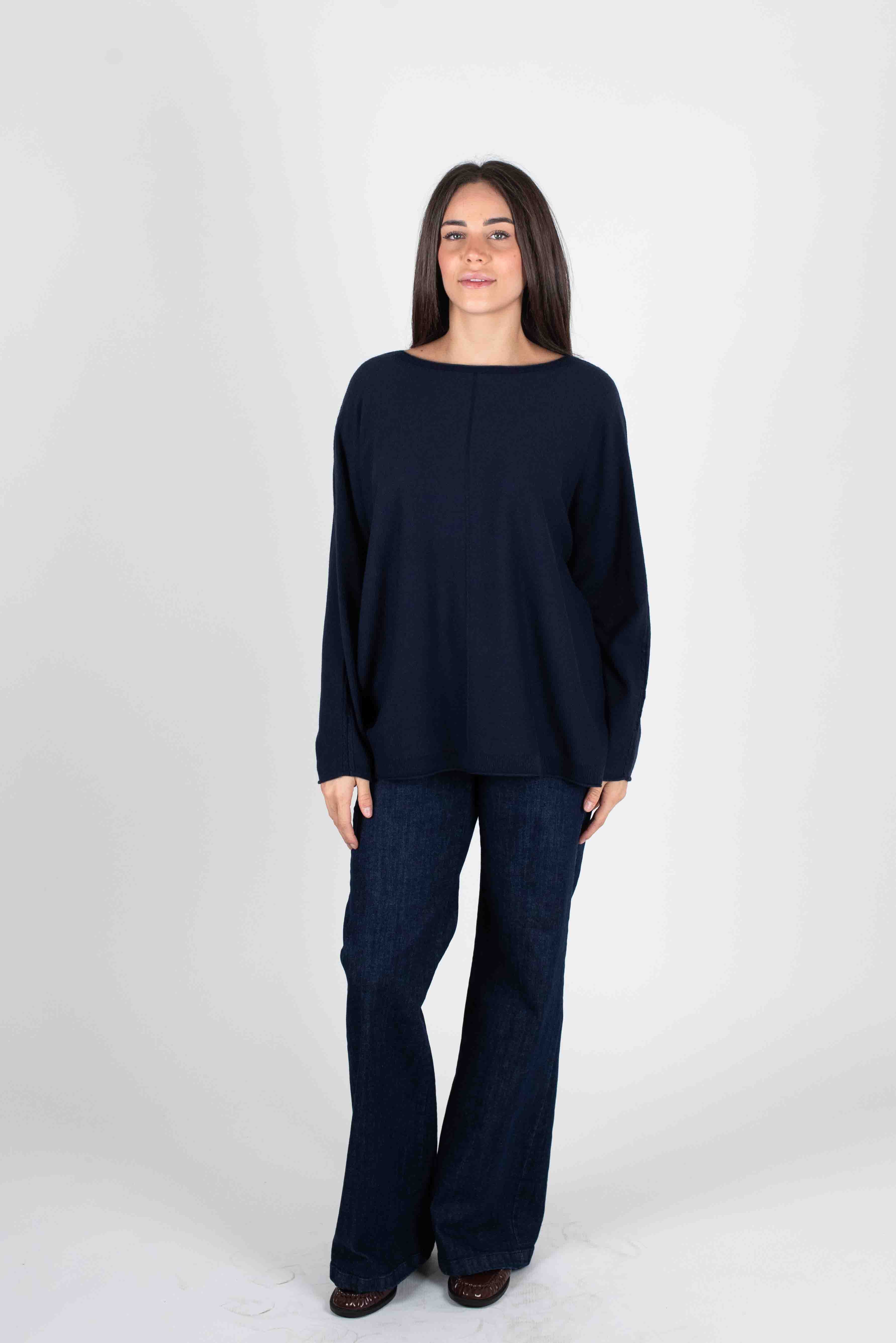 Maglia over con collo a barca e treccia sulla manica con riga centrale.