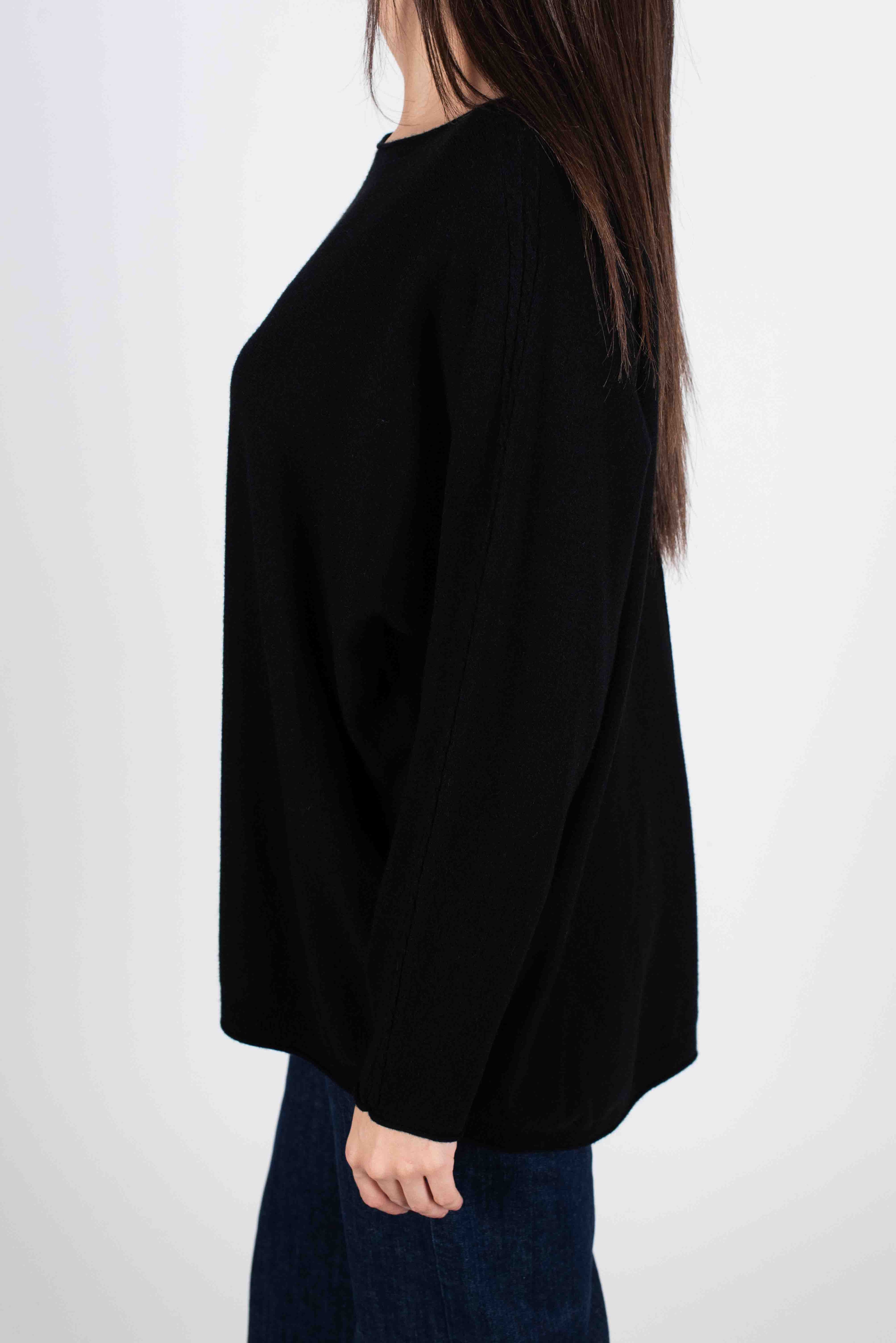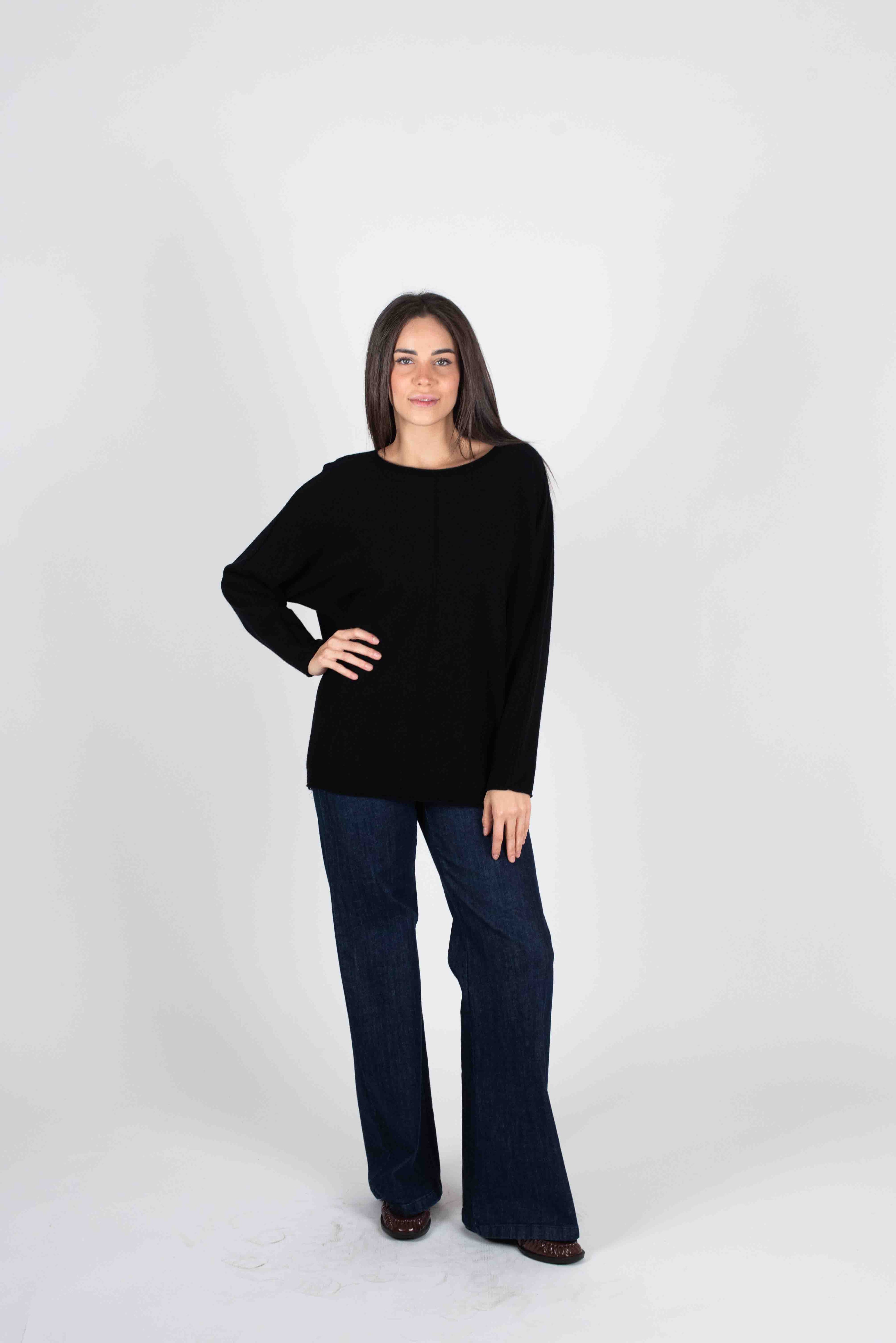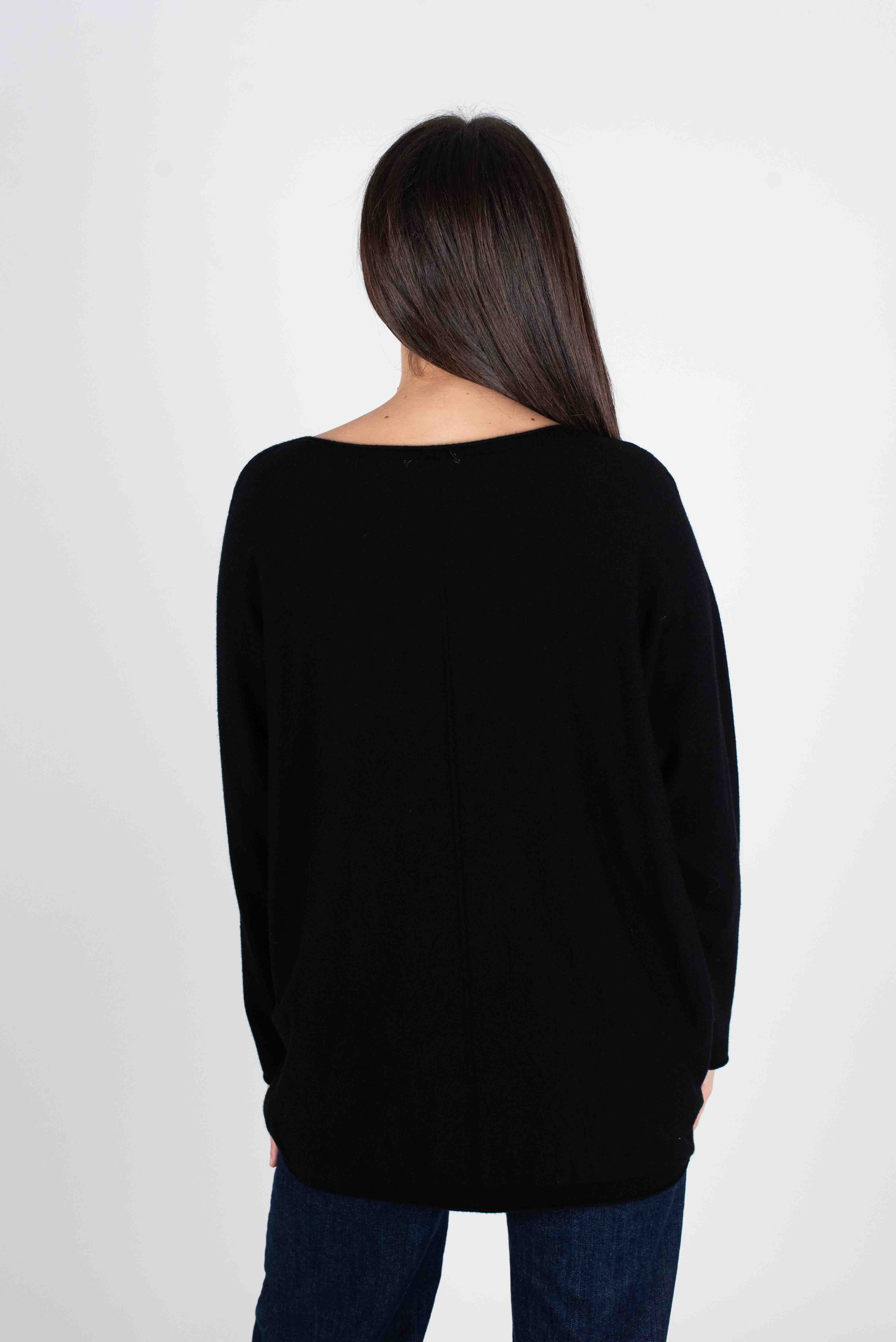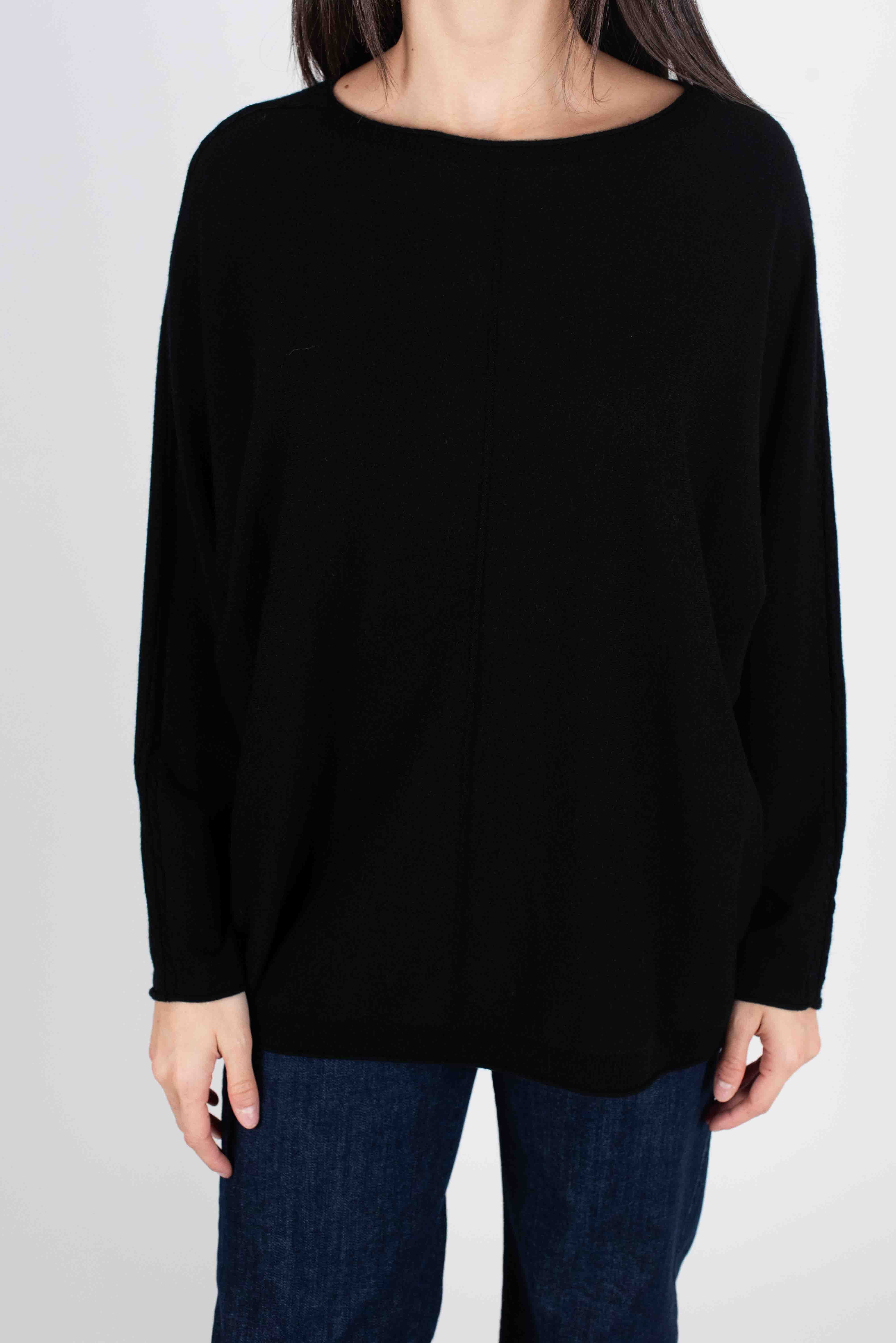 Maglia over con collo a barca e treccia sulla manica con riga centrale.