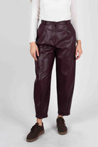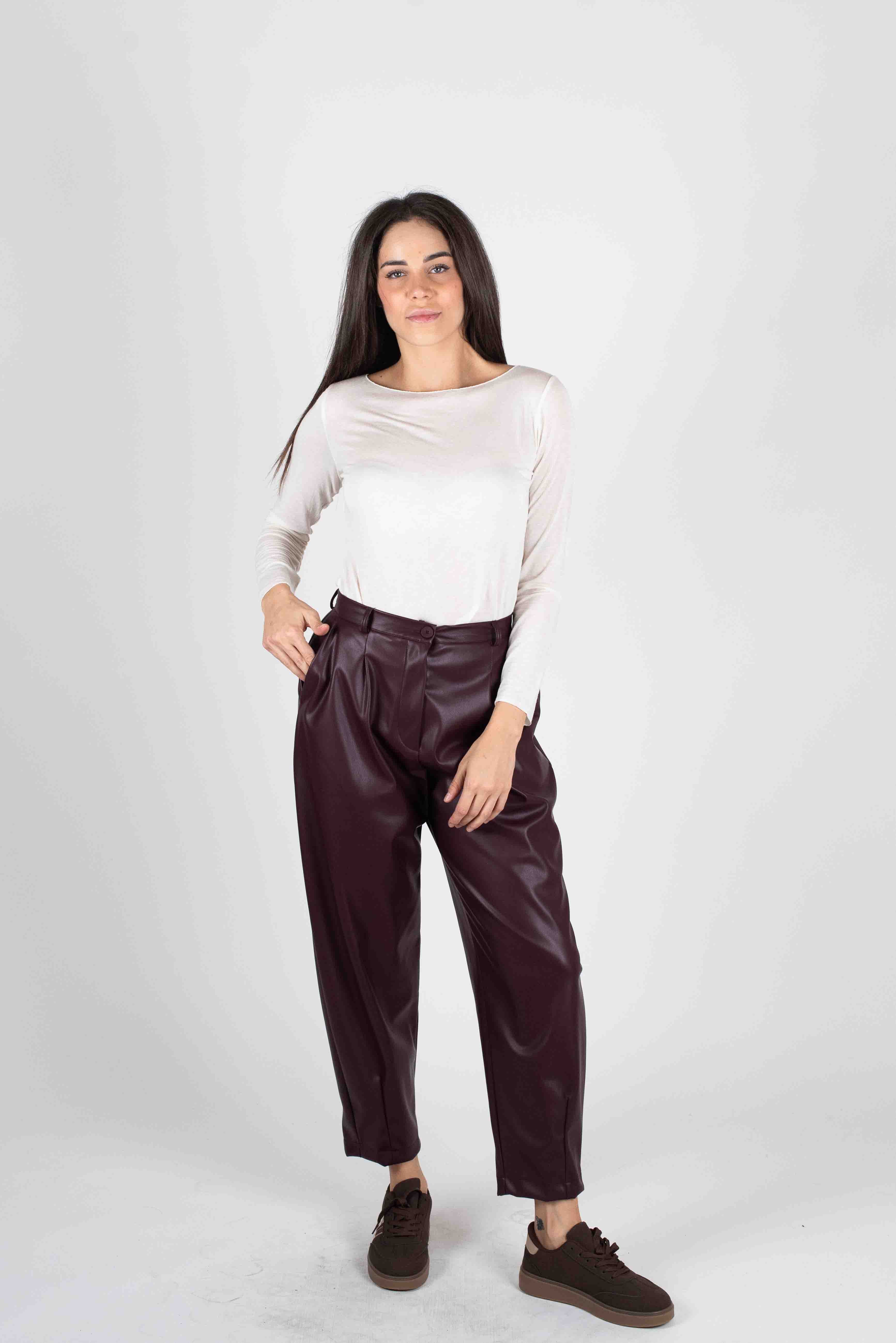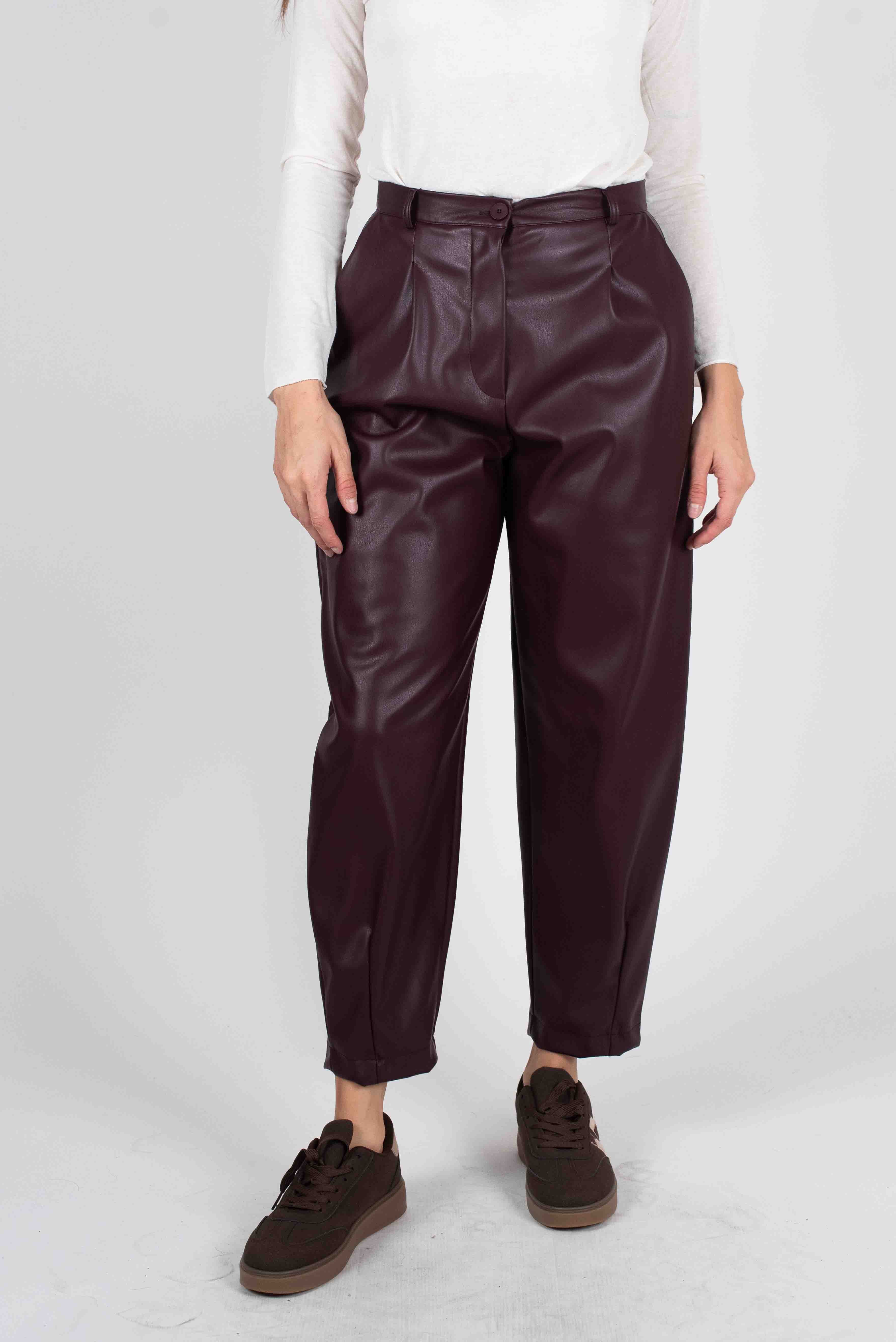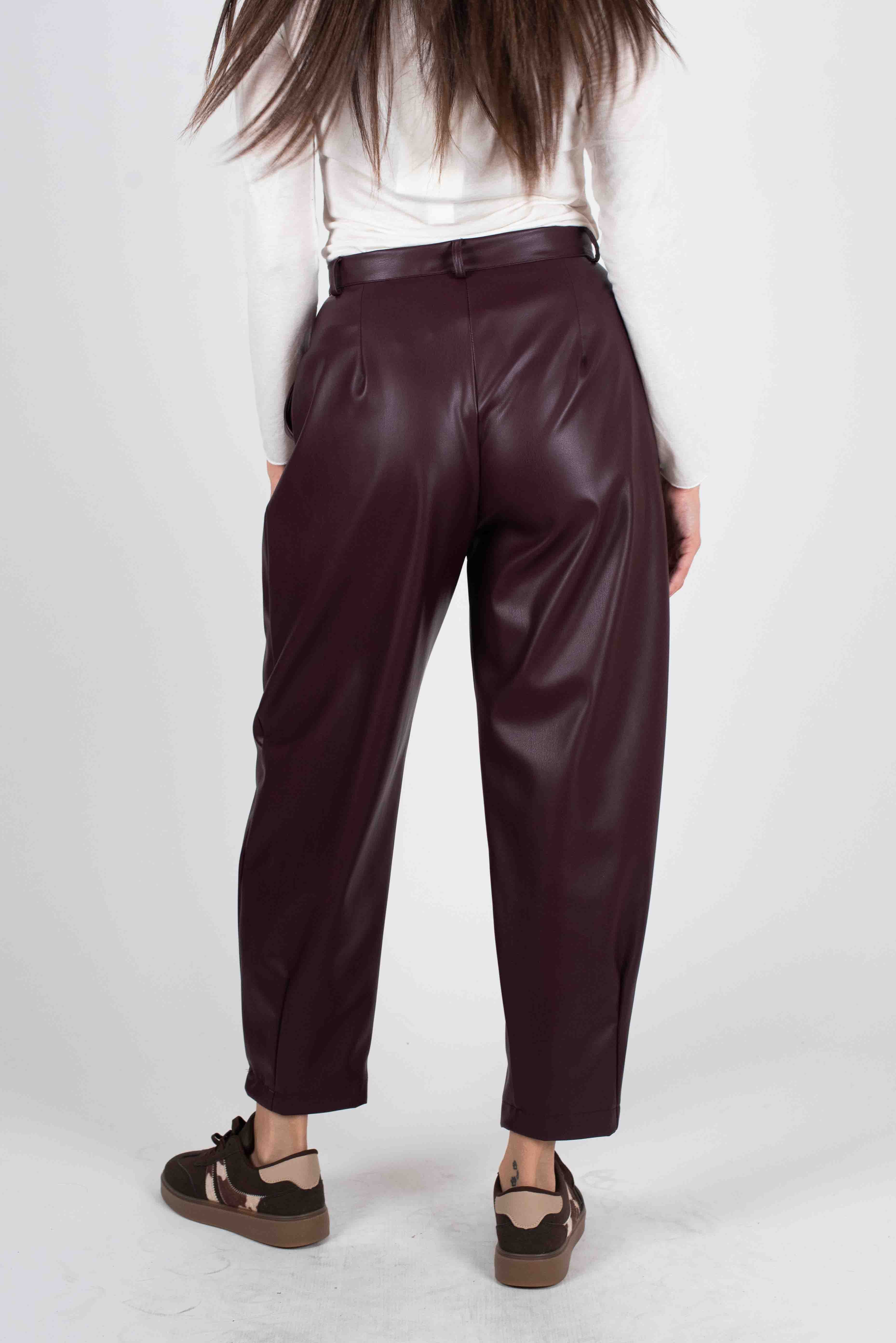 Pantalone balloon in ecopelle con pence e tasche alla francese.