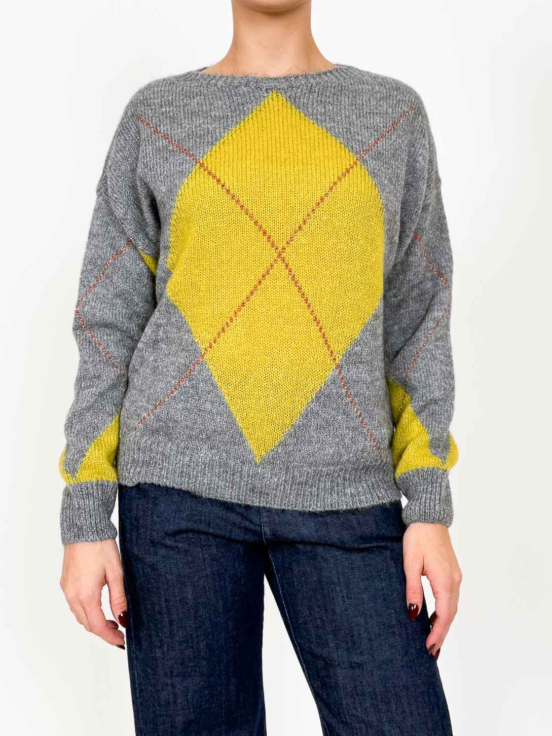 Maglia con disegno rombi e filo in lurex in contrasto.