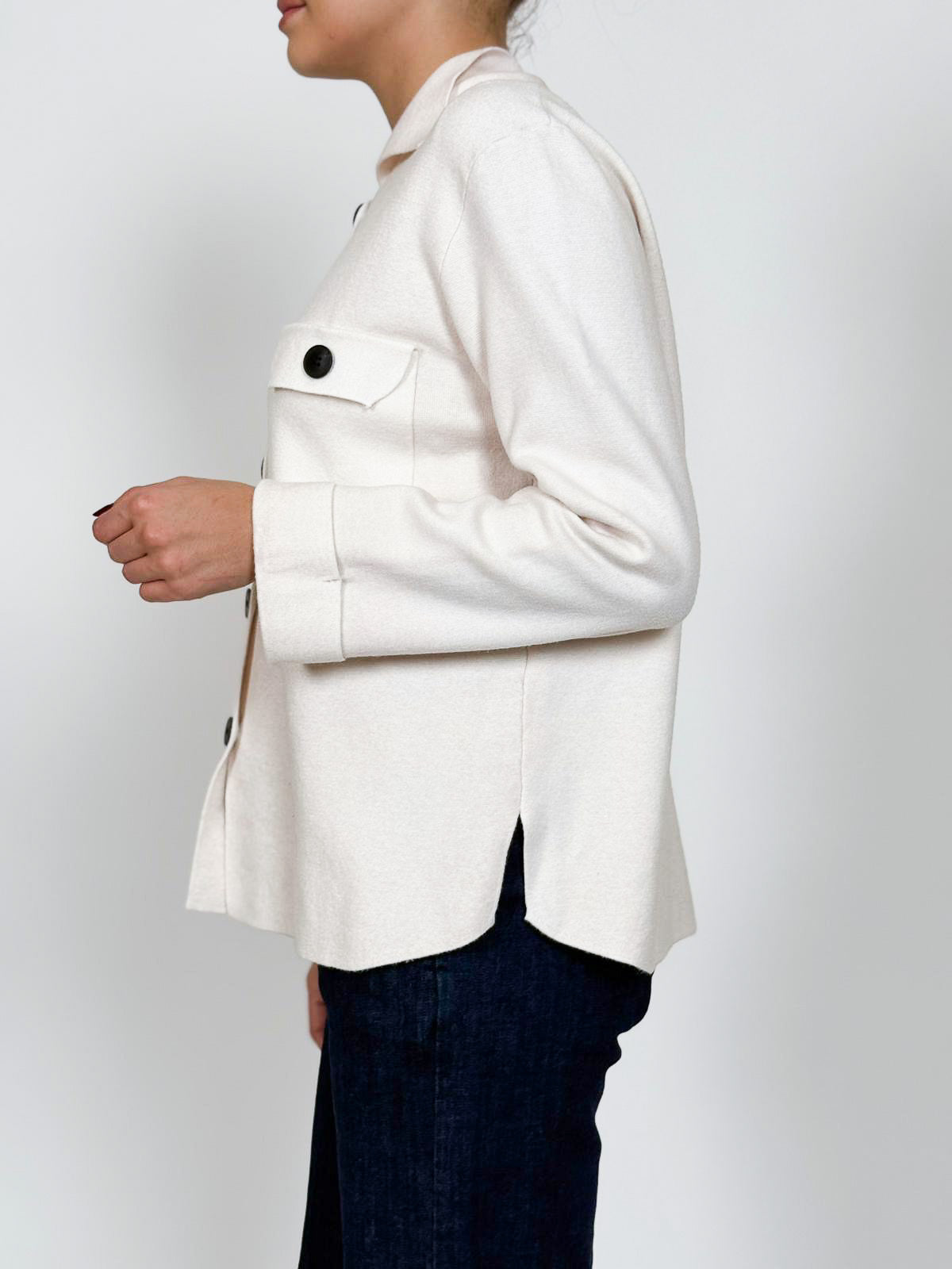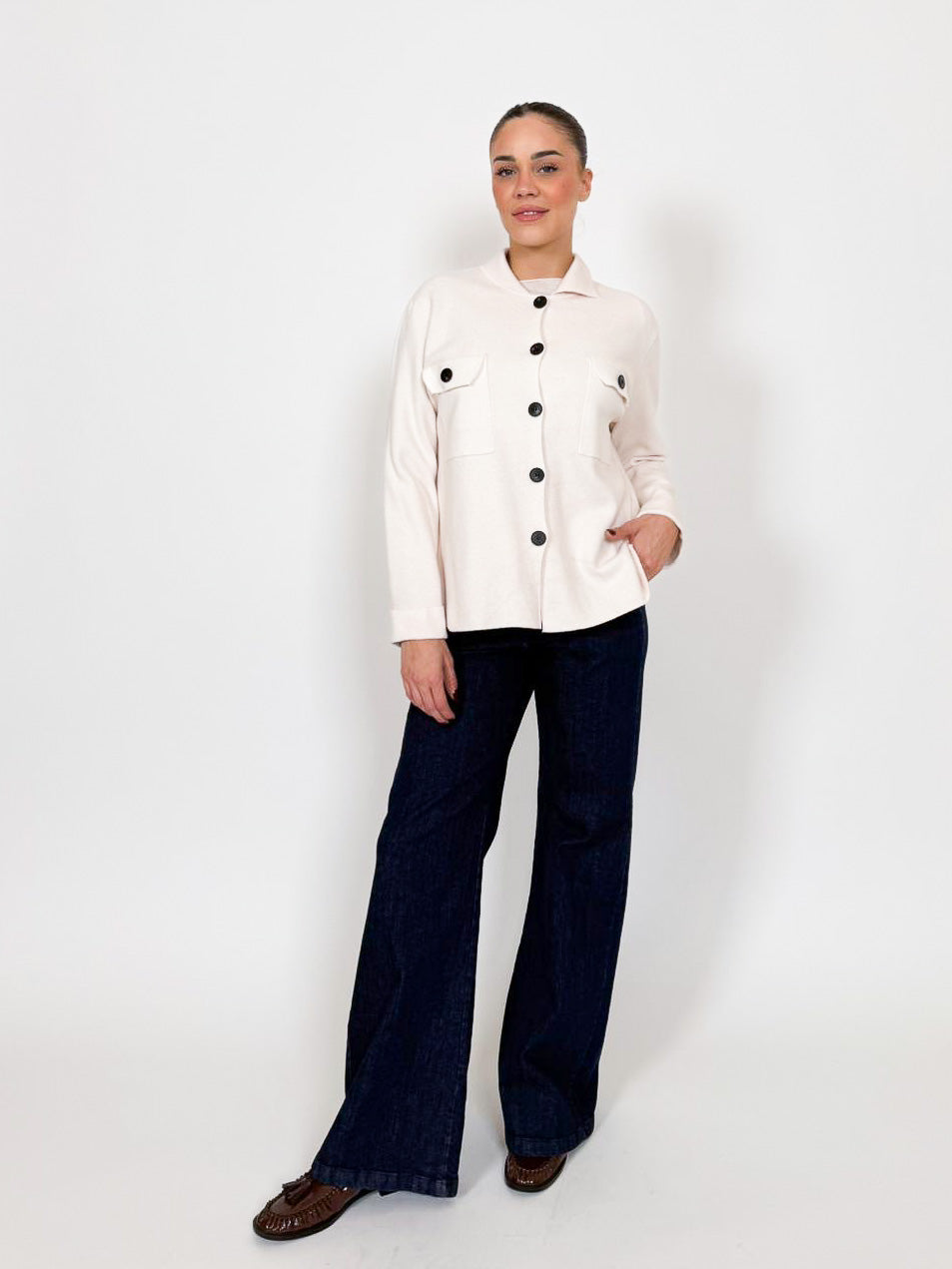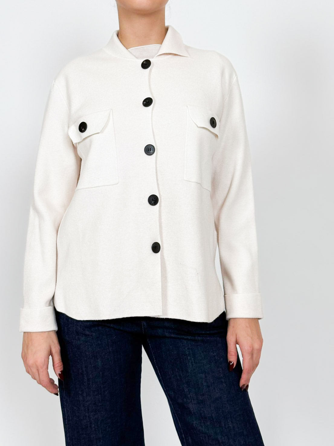 Giacca maglia modello camicia con tasche a toppa.