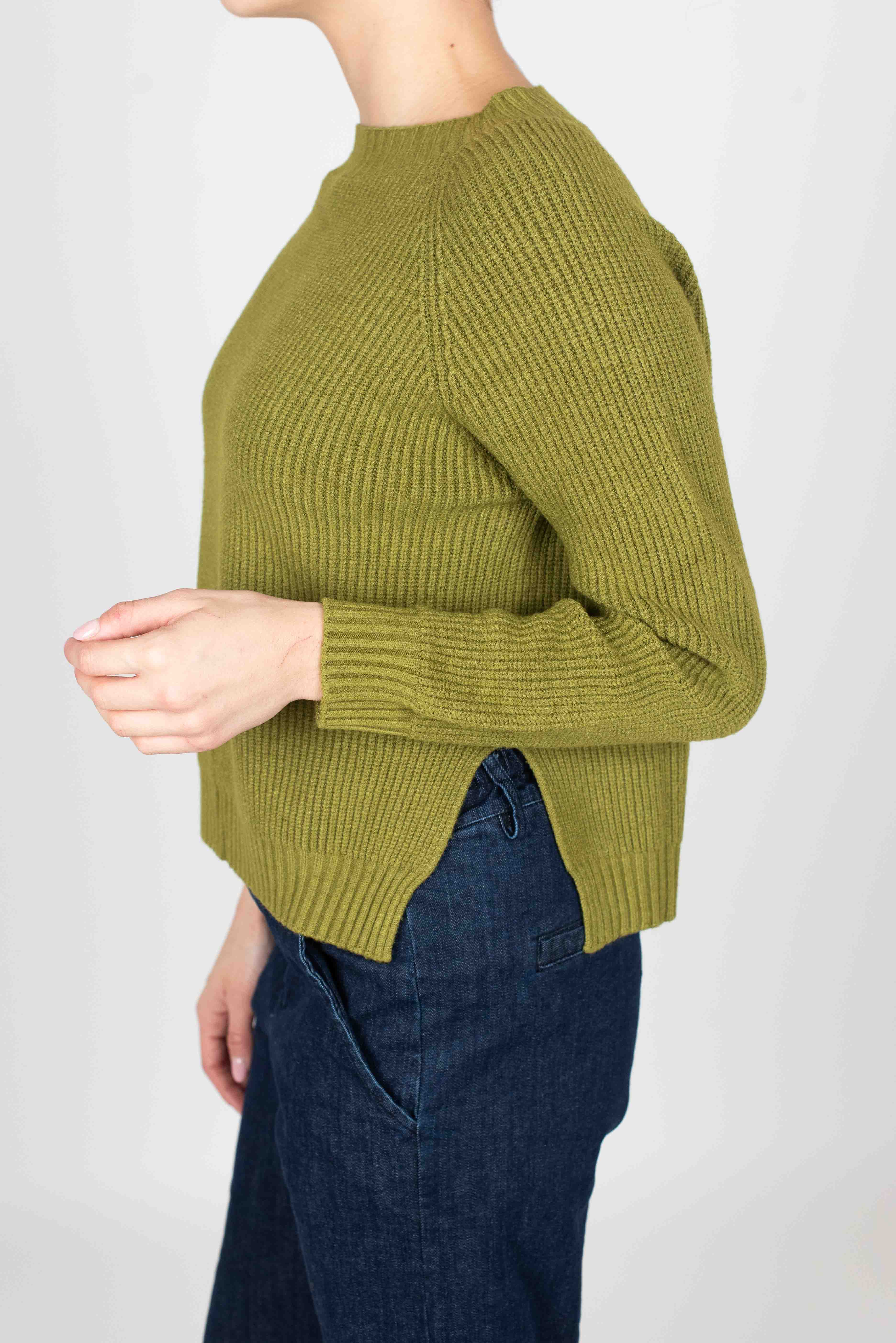 Maglia girocollo a coste con spacchi laterali.