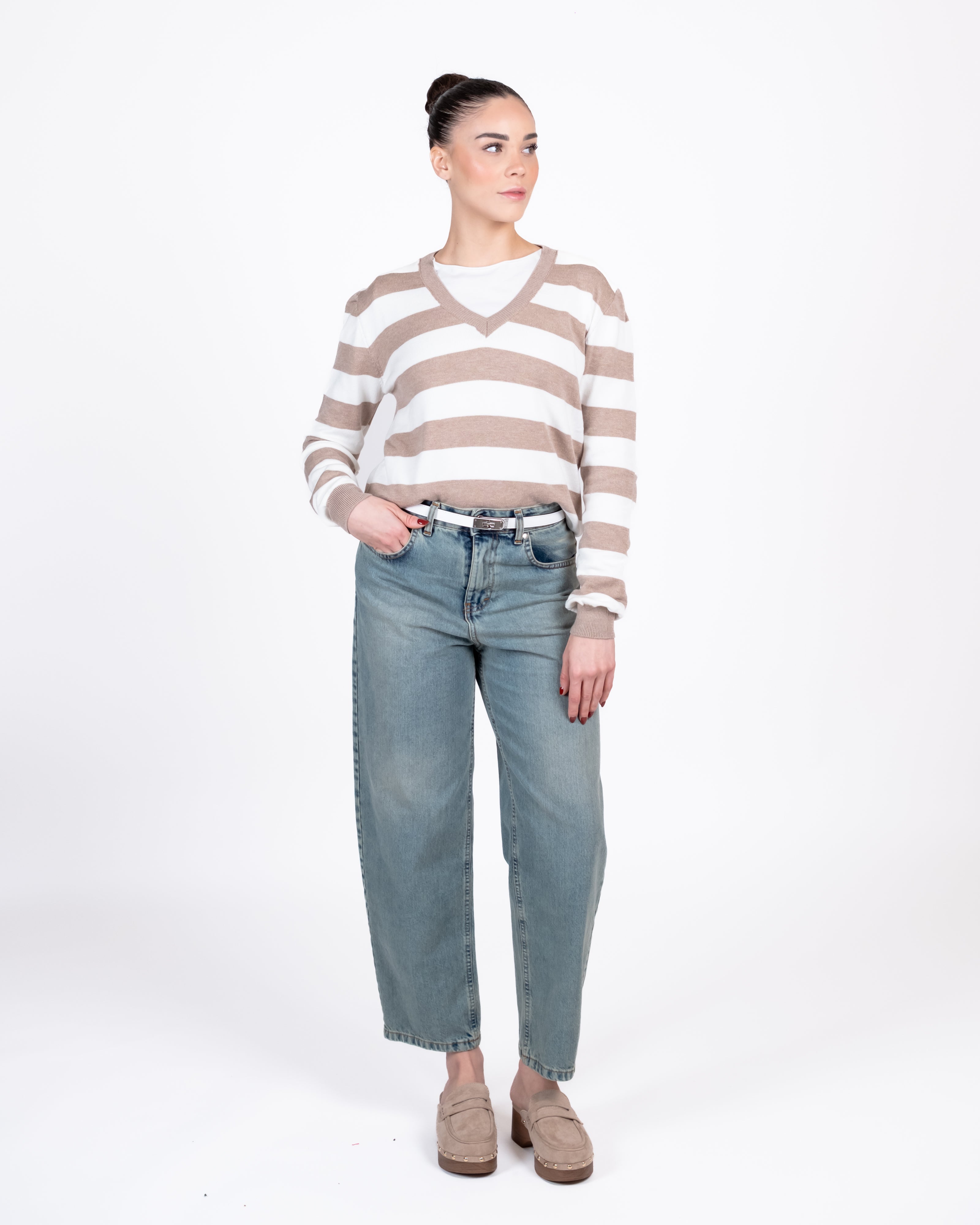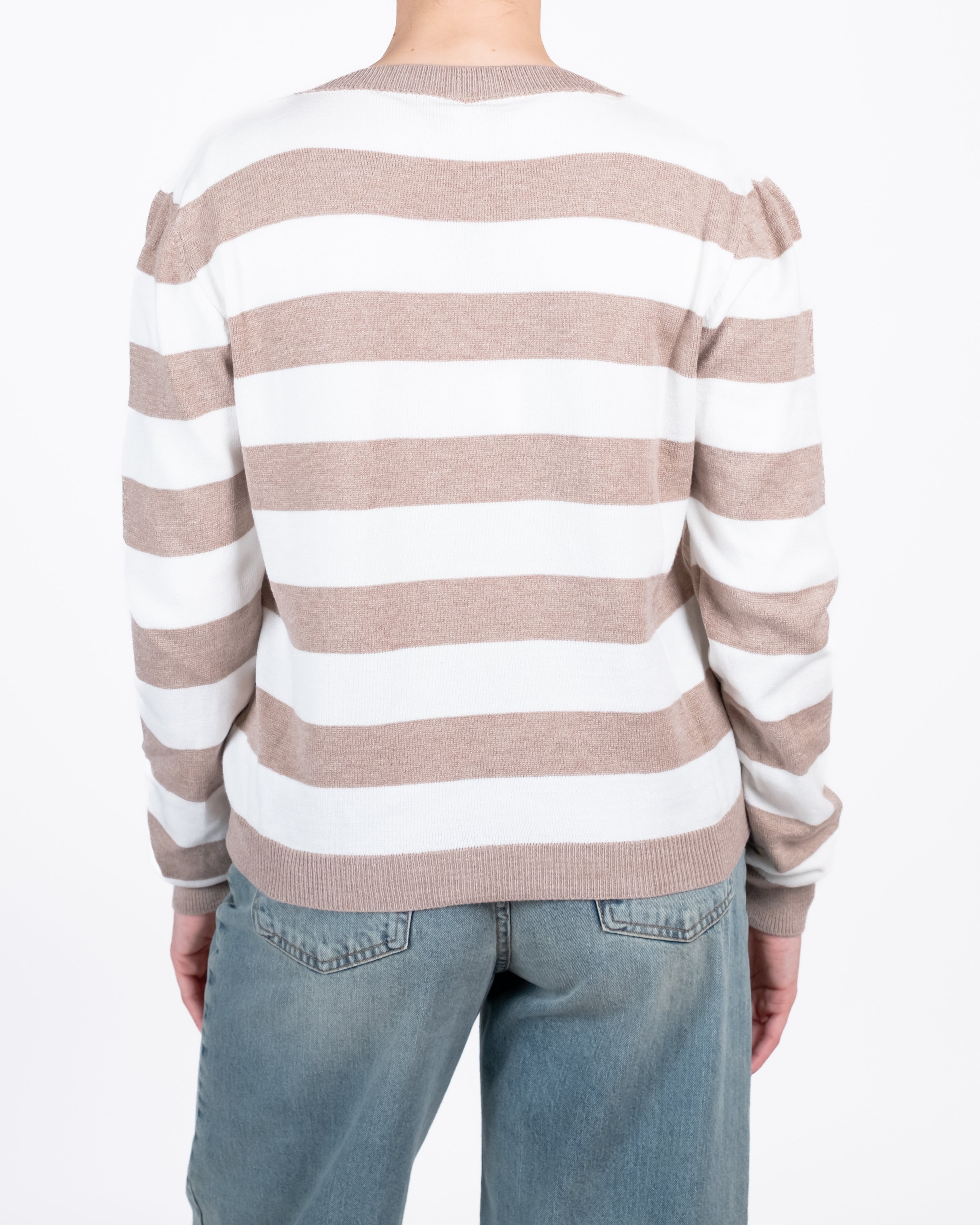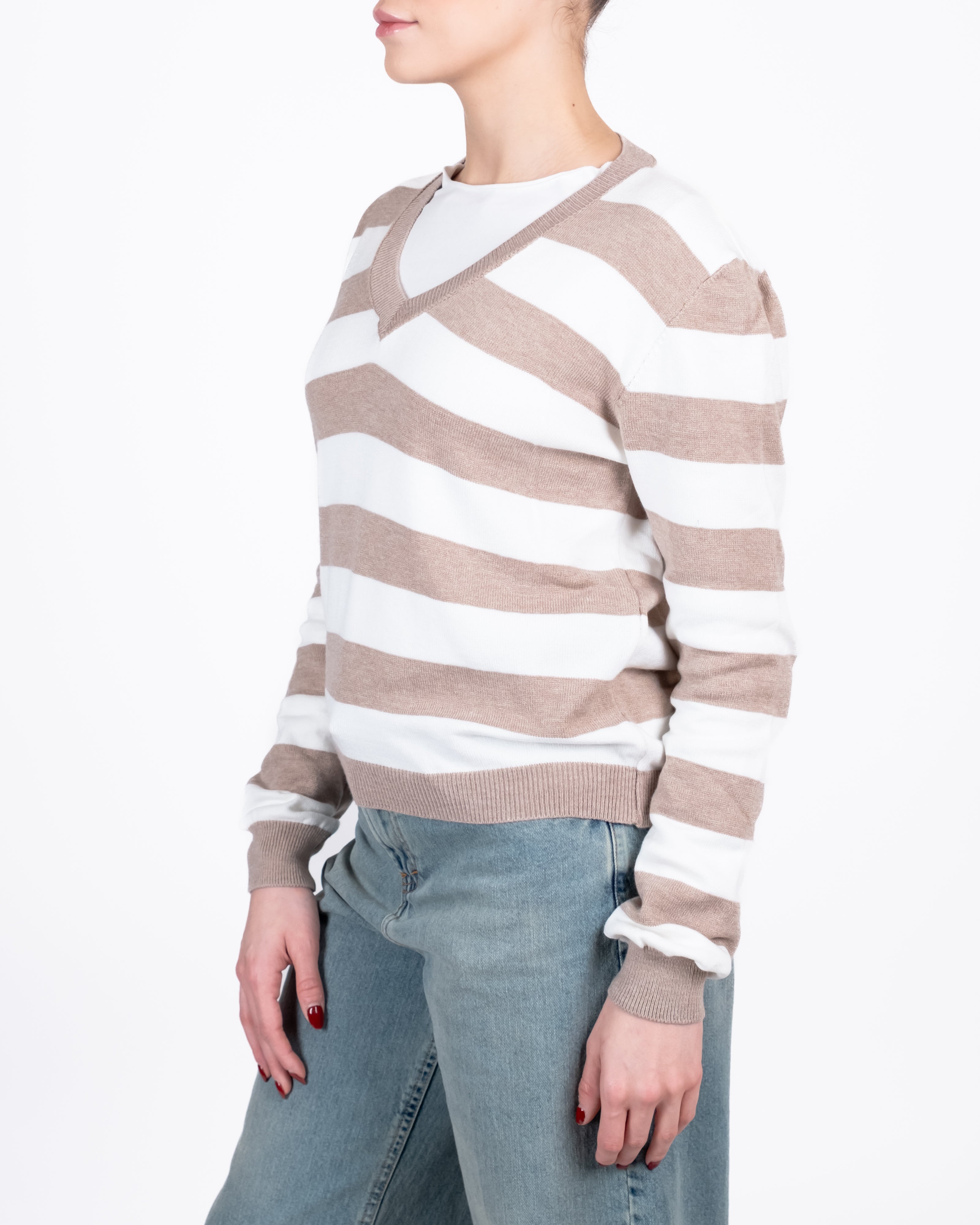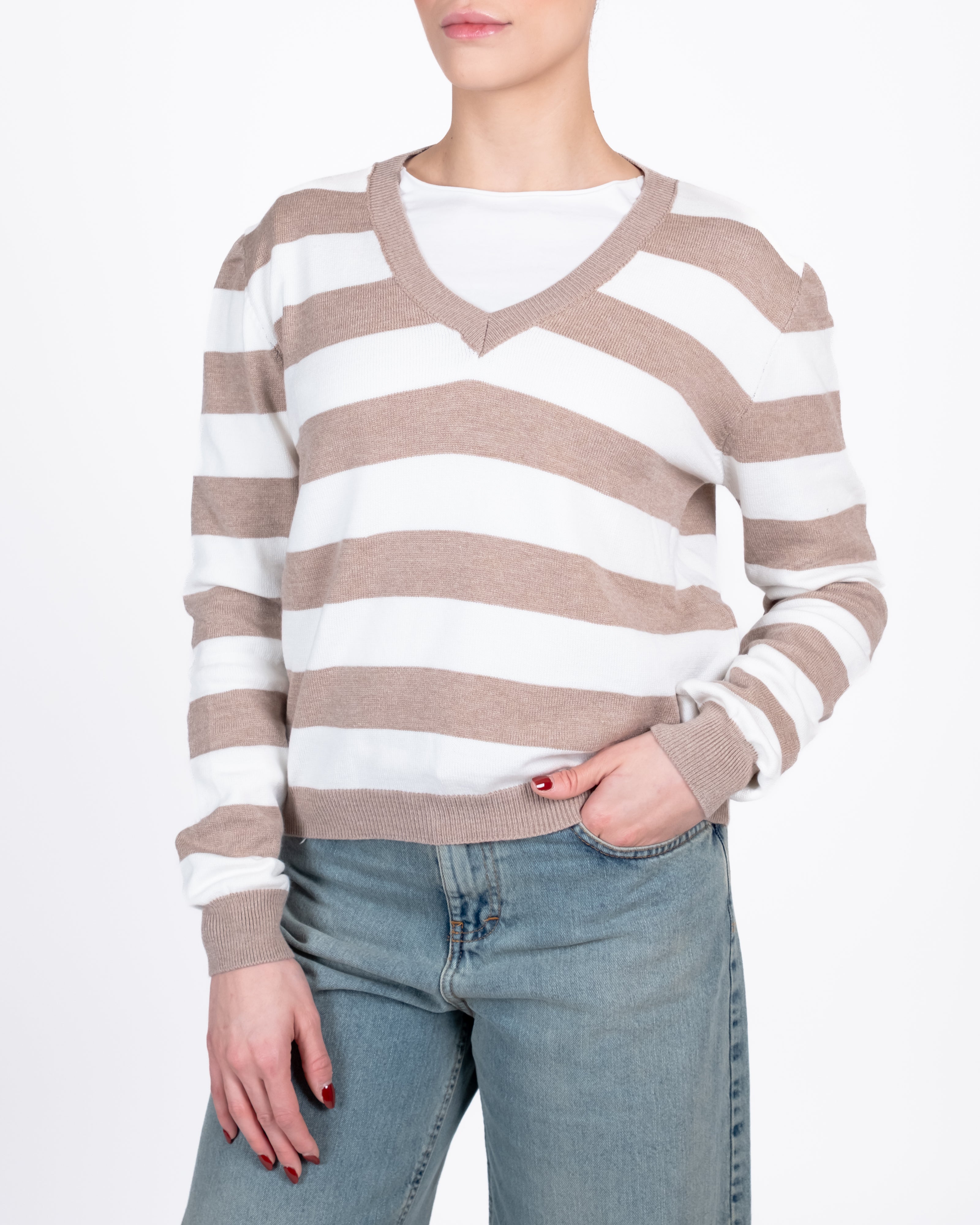 Tensione In Maglia Righe Collo V - sabbia/bianco