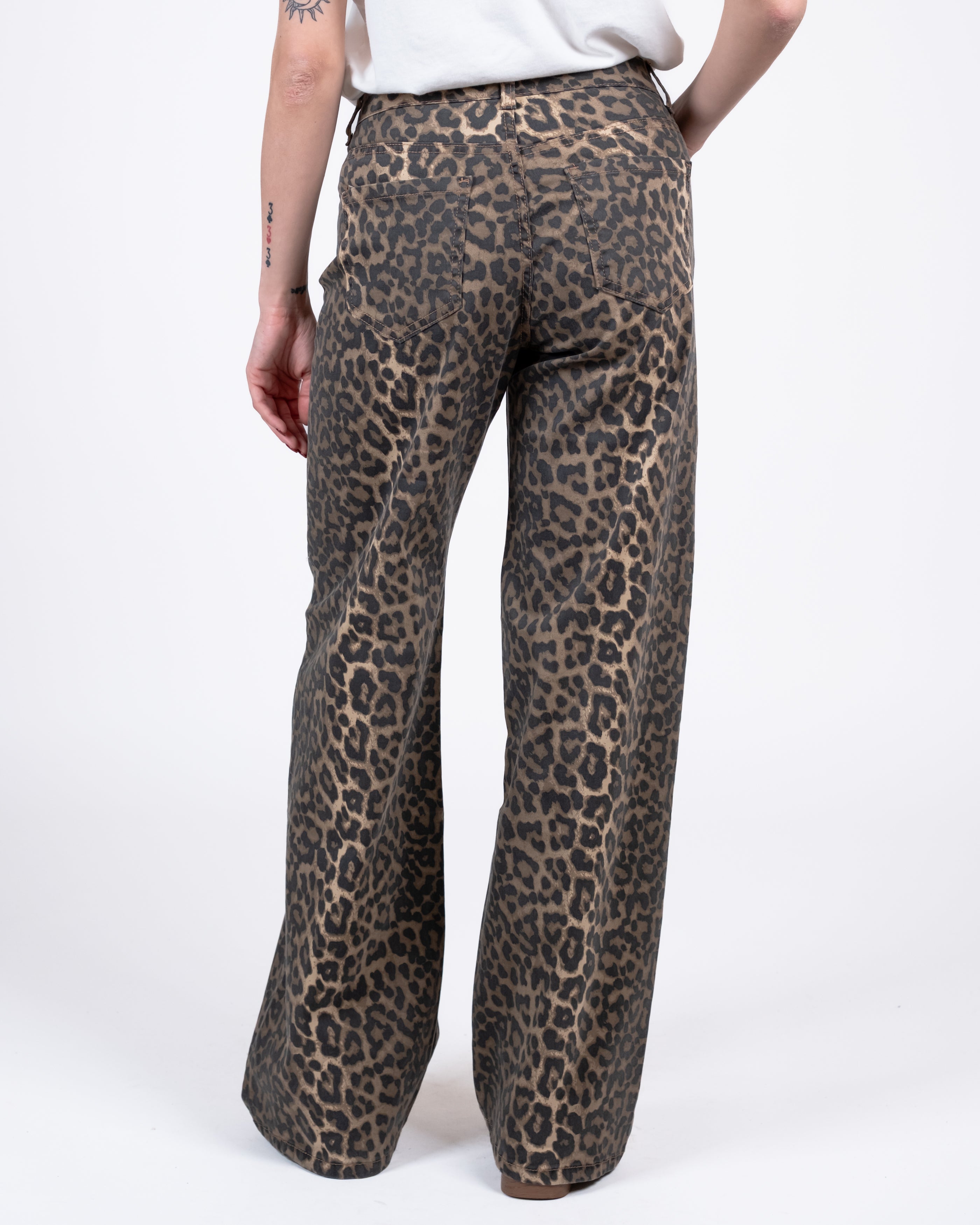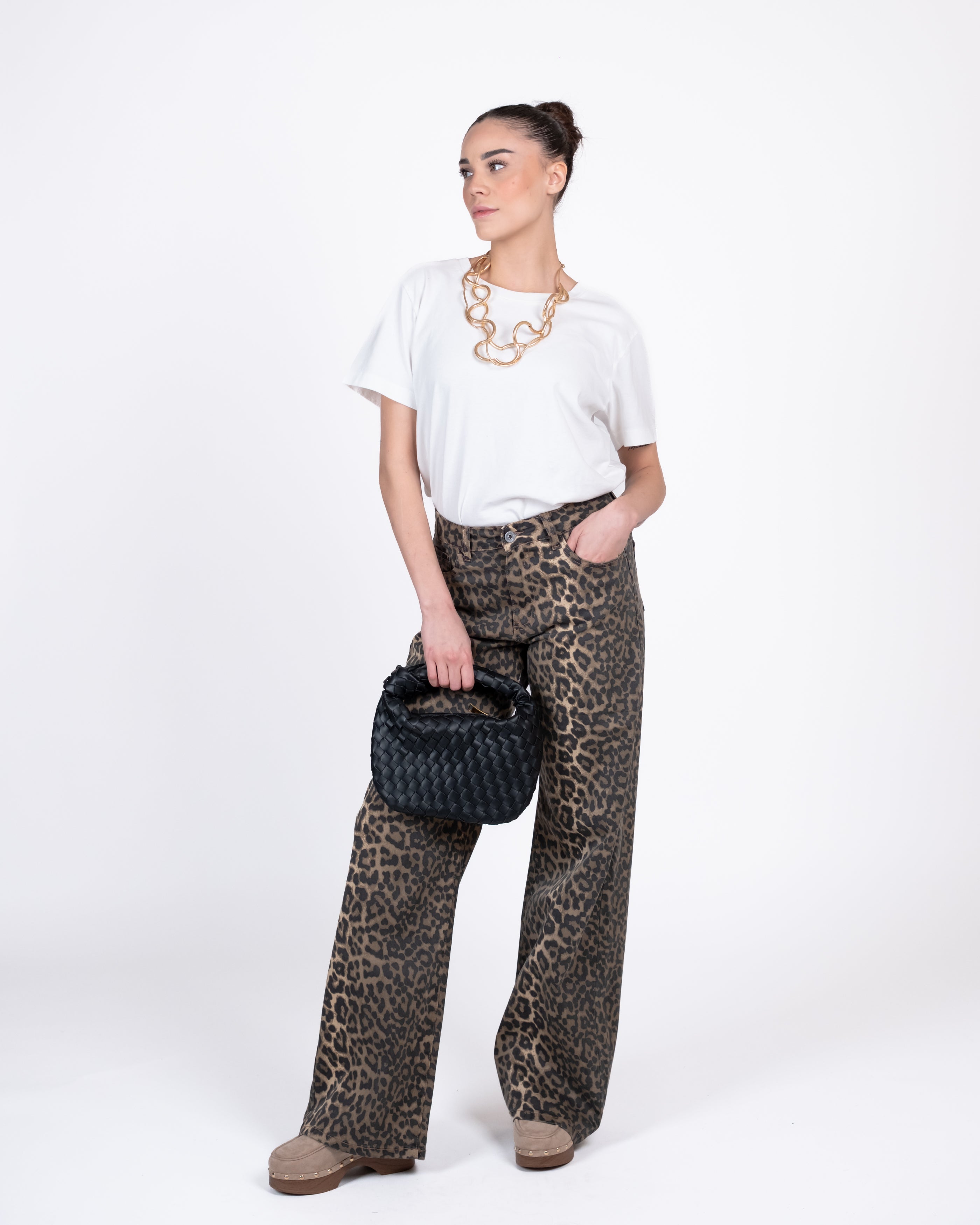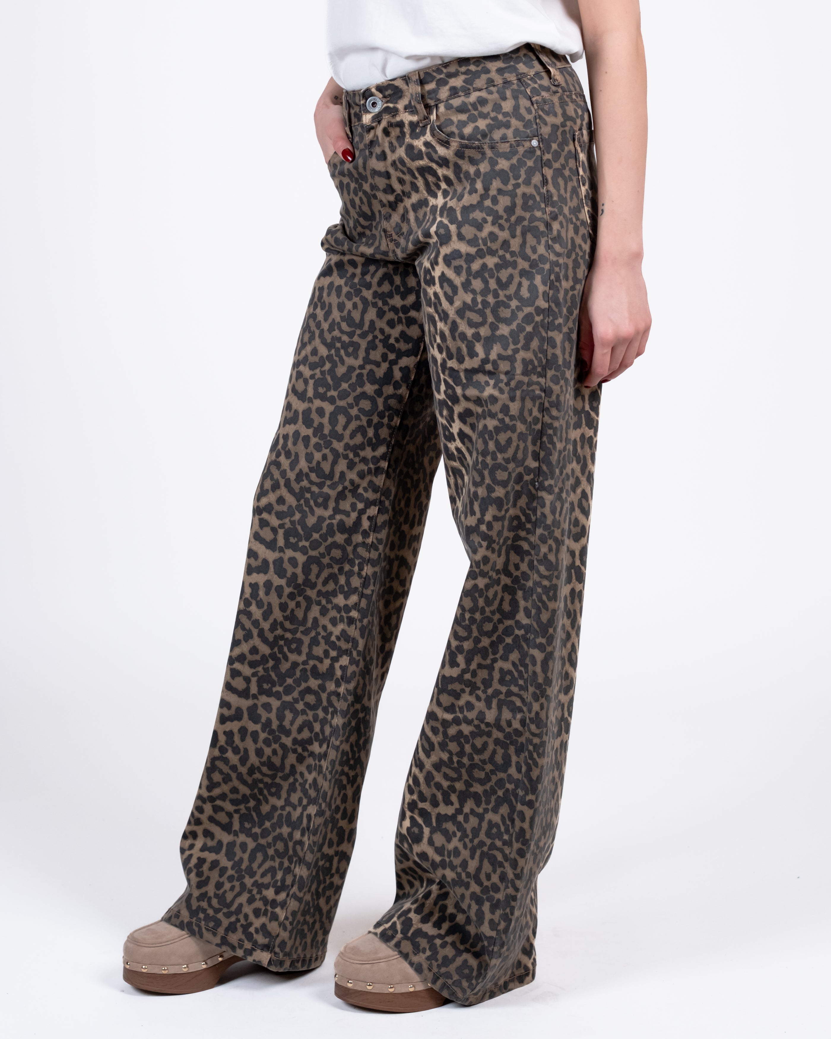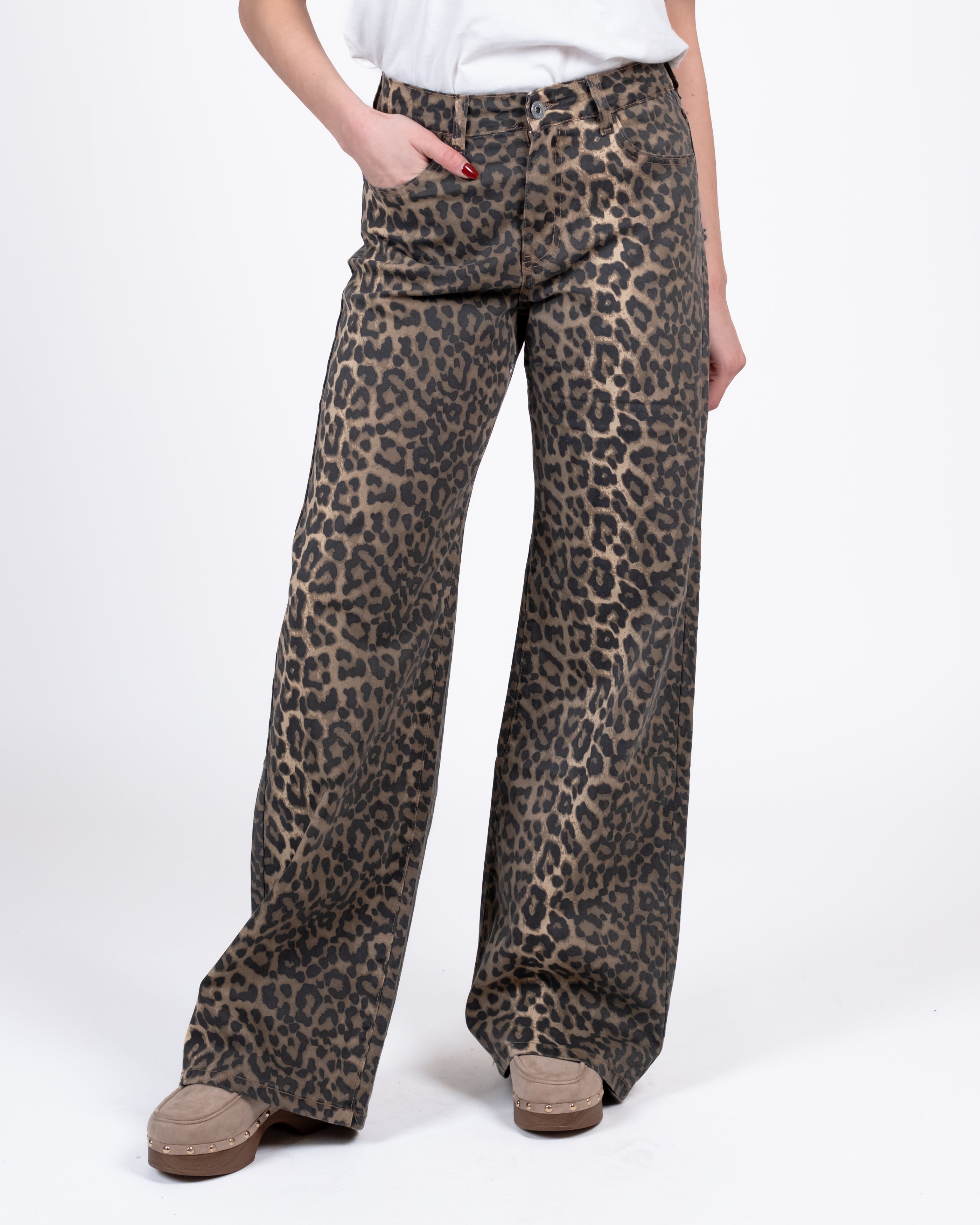 Pantalone palazzo elasticizzato stampa maculata.