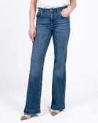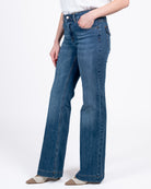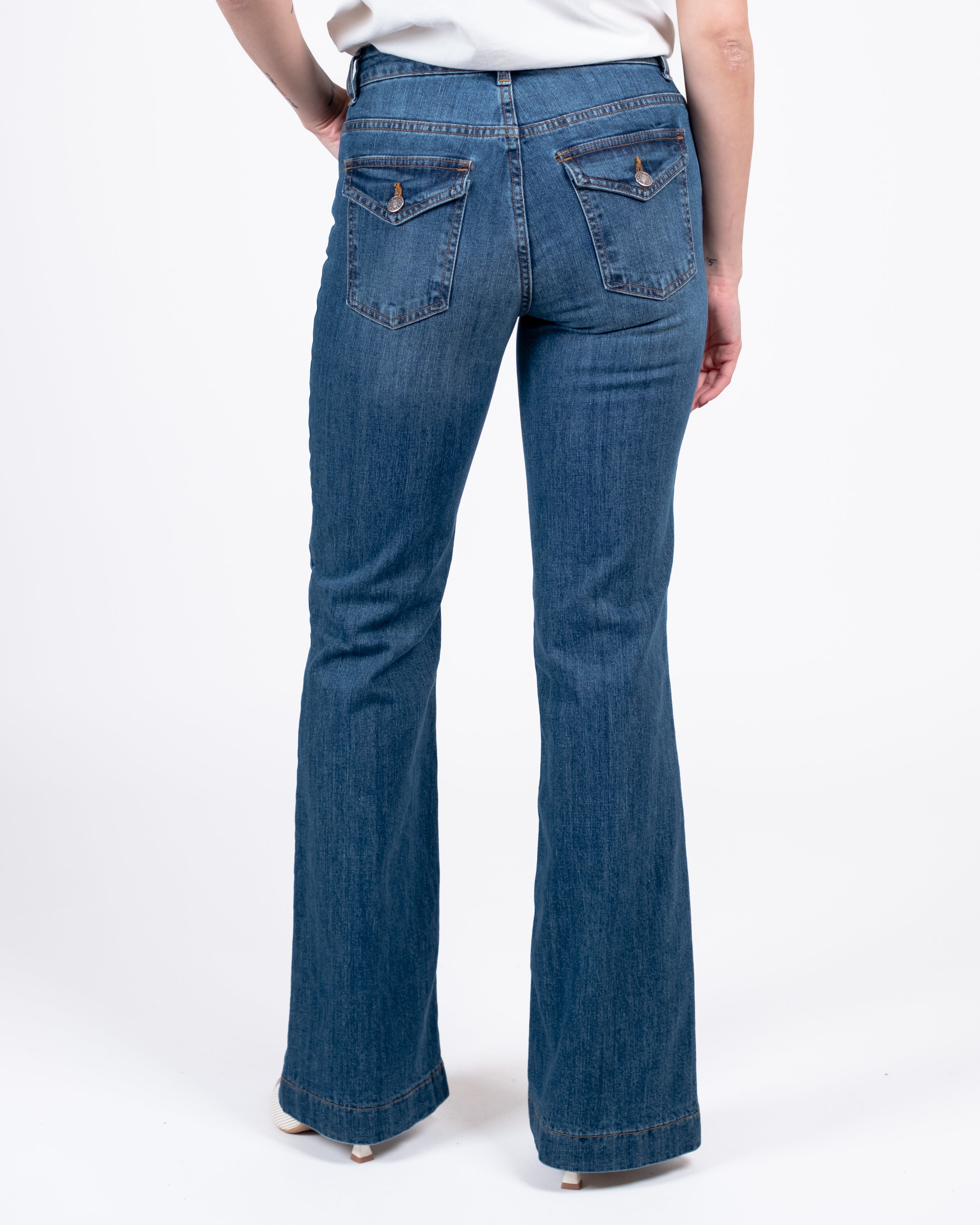 Jeans zampa con orlo alto e bottoni tasche dietro.