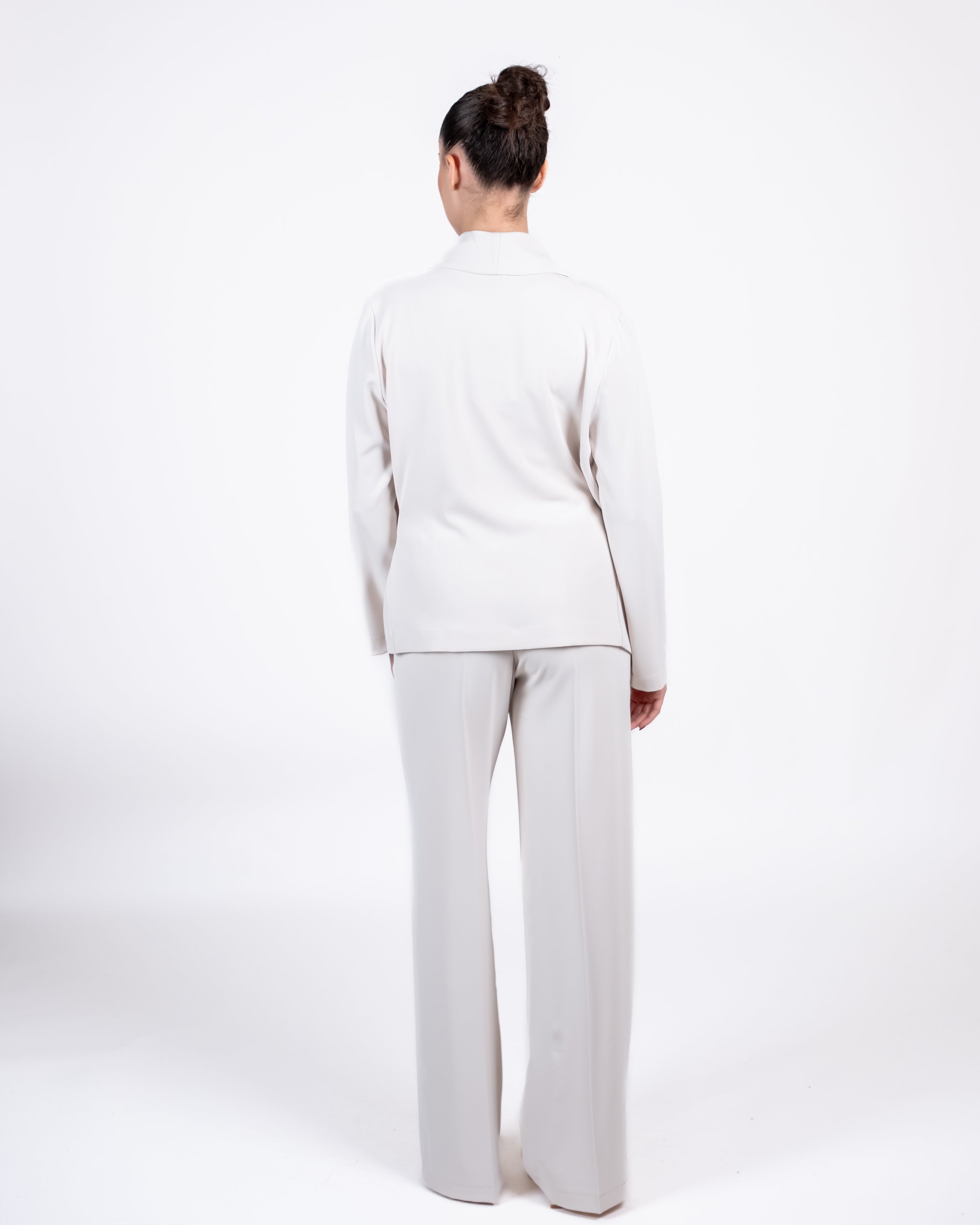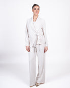 Completo tessuto fluido giacca con cinta a fiocco e pantalone palazzo con elastico dietro e tasche.